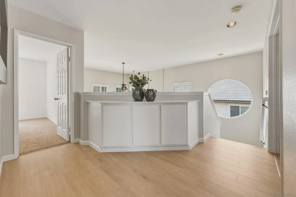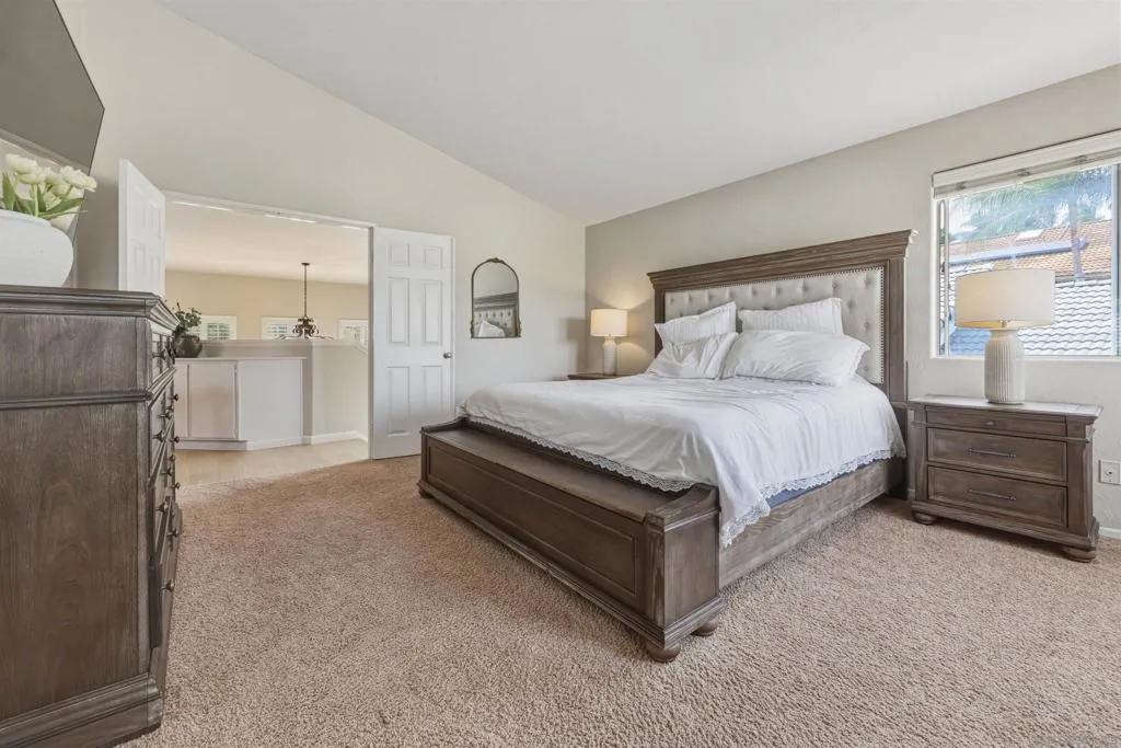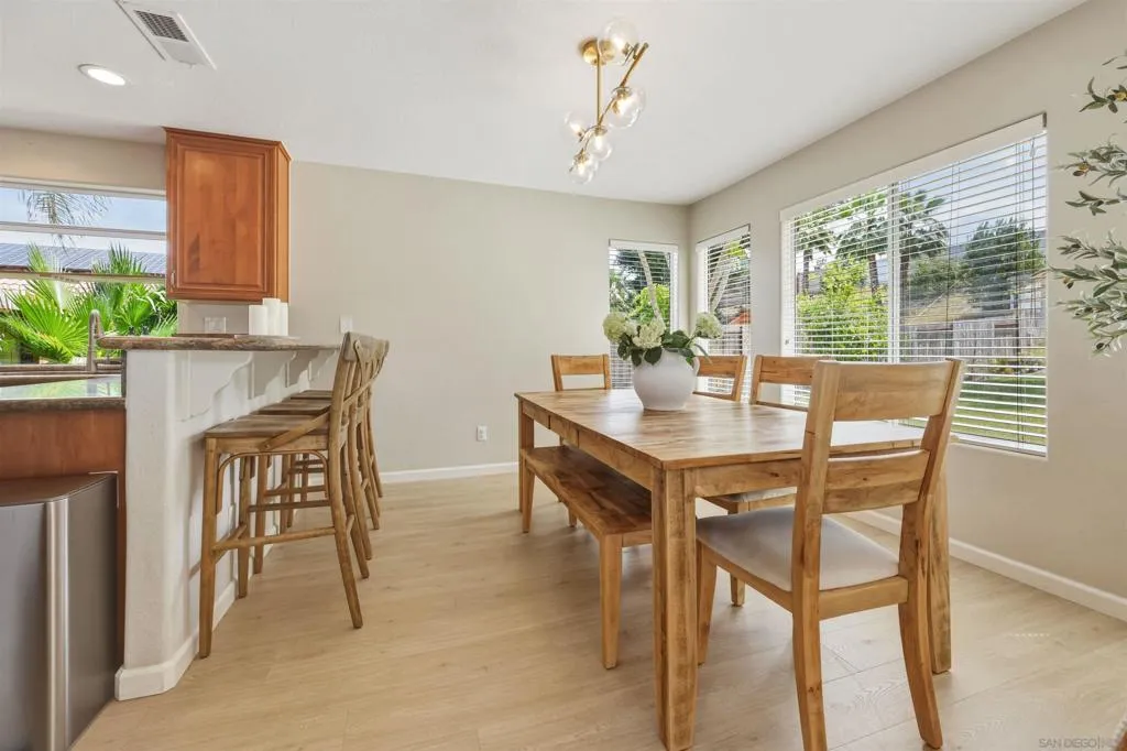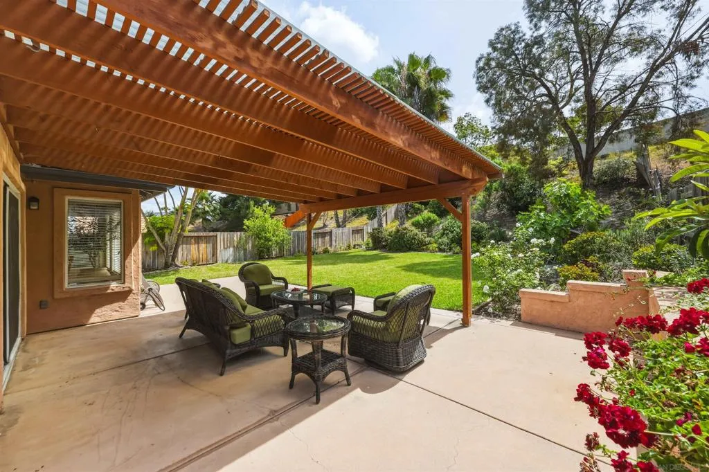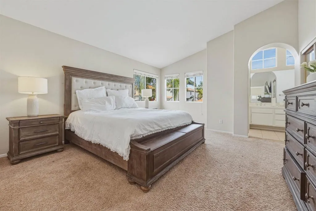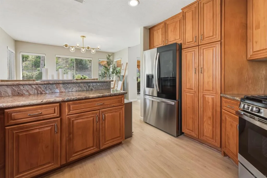 Welcome home to this beautiful Rancho Del Oro Villages II property, surrounded by walking trails and a, well-kept neighborhood. This home features one of the largest backyards in the community, complete with a covered patio and plenty of space for family, pets, and outdoor entertaining. New flooring has been added on the first floor and stairwell. The fully remodeled downstairs bathroom adds fresh style and convenience for guests. The kitchen has been tastefully maintained with granite counters, newer cabinets, stainless steel appliances, and a newer gas stove and microwave. Enjoy a breakfast bar and a spacious dining area that flows into the living room, which offers two-story ceilings, plantation shutters, wood flooring, and a cozy fireplace—bright, open, and airy throughout. Upstairs, the primary suite offers a peek view, room for large furniture, a walk-in closet, dual sinks, and a new walk-in tile shower. A Jack-and-Jill bathroom connects the two additional bedrooms.