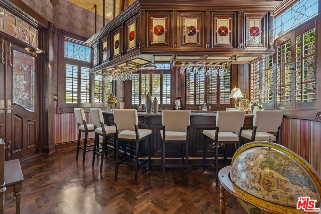 Perched above the Mulholland Hills Premier Golf & Tennis Country Club (Formerly Braemar Country Club) this gated English Tudor estate offers exceptional privacy and presence in the heart of Tarzana. Designed by Ronald Firestone, the approx. 8,700 SF residence sits on two lots of over 4 acres of beautifully landscaped grounds, functioning as a private sanctuary, peaceful, expansive, and deeply calming.A grand two-story foyer with soaring ceilings and an architectural staircase sets the tone, complemented by hand-distressed walnut floors and bespoke stone and wood detailing throughout. The step-down living room features vaulted ceilings, a reclaimed stone fireplace, and French doors that flood the space with natural light. Oversized windows throughout further enhance the home's open, elegant feel. The formal dining room, highlighted by coffered oak ceilings, comfortably seats 20 and flows seamlessly into the main living areas. The chef's kitchen is outfitted with a La Cornue range, oversized center island, dual sinks, beamed ceilings, custom cabinetry, and multiple walk-in and butler's pantries. A circular breakfast room overlooks the covered patio, outdoor kitchen, and expansive backyard. A dramatic two-story great room showcases cathedral-beamed ceilings, an oversized stone fireplace, French doors, a wine cellar with imported pavers, and a full English pub bar. Additional highlights include an all-oak library with marble fireplace, built-in shelving, gentleman's bar, and French windows. The home offers 5 en-suite bedrooms, including a luxurious owner's retreat featuring a sitting room, kitchenette, fireplace, private balcony, spa bath with soaking tub and steam shower, and a large walk-in closet. Resort-style grounds span over 4 acres and include manicured gardens, a large pool, an outdoor pavilion with kitchen and bath, and a lighted tennis courtframed by panoramic views of the surrounding hills and golf course greens. A private gated entrance, expansive motor court, and a 3-car garage with built-in storage complete this rare offering.A true legacy estate blending scale, privacy, and timeless architecture, ideally suited for refined living and grand entertaining.