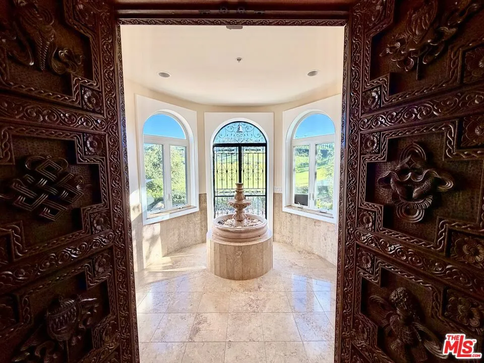 Perched on approximately 3.5 acres above Western Malibu, this exceptional custom estate offers sweeping panoramic views of Point Mugu State Park, Boney Ridge, and sparkling city lights. Extensively remodeled in 2004, with approximately 60% new construction at that time, the home showcases remarkable craftsmanship with globally sourced finishes, including hand-carved Nepalese doors, custom wrought iron, and imported Mexican stone. A grand entry with a fountain opens to the main level, featuring a spacious family room with marble fireplace, wet bar with Talavera sink, four of the five bedrooms, three bathrooms, and a dry sauna. Upstairs, the great room impresses with soaring 18-foot wood-beamed ceilings, a fireplace, and a loft ideal for an office or retreat. The chef's kitchen offers custom cabinetry, granite countertops, a butler's pantry, and a scenic breakfast nook. The primary suite includes a sitting area, fireplace, spa-like bath, and custom closets. Outdoor patios capture breathtaking canyon and city views. Additional features include a two-car garage and ample additional parking. Located approximately 20 minutes from Central Malibu, Camarillo, and Oxnard, this private retreat offers a rare combination of tranquility, privacy, and accessibility.