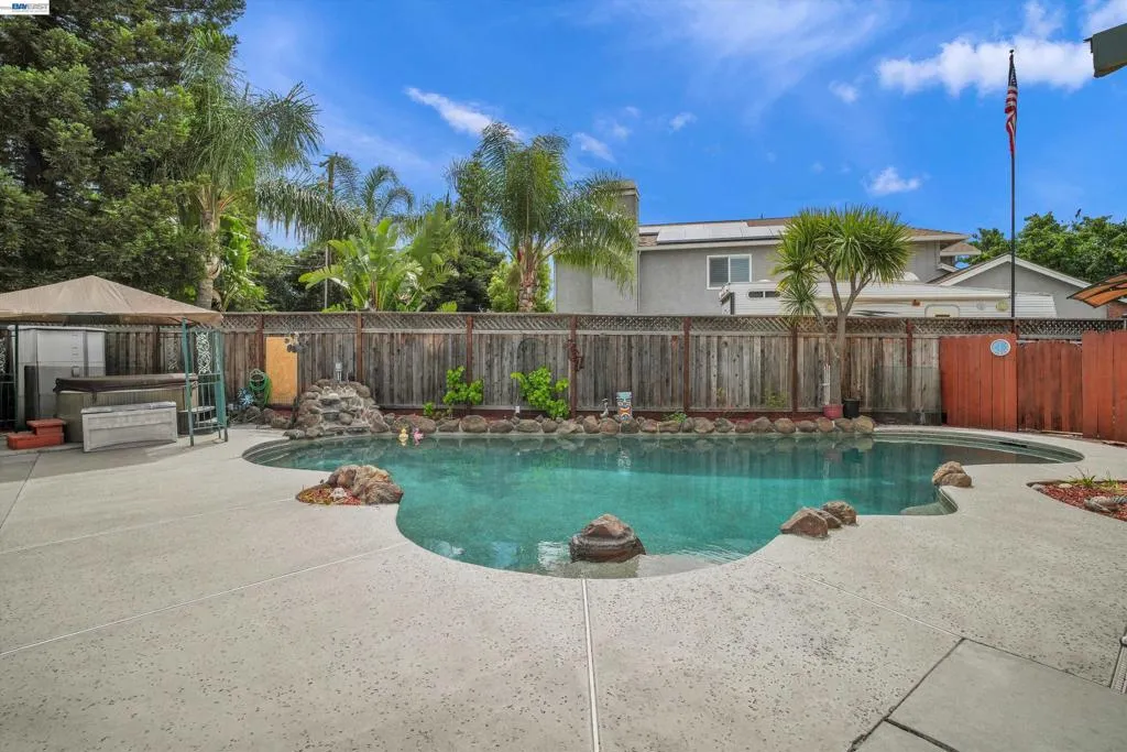 Welcome to a well maintained home that sits on a quiet court and features three bedrooms upstairs with one bedroom and bath downstairs, ideal for guests or a home office. The backyard is designed for Central Valley living with a built in pool and generous outdoor space, plus RV access for added flexibility. A three car garage provides ample parking and storage. Fully paid off solar adds long term energy savings. Conveniently located near parks, schools, shopping, and commuter routes, this home delivers comfort, efficiency and location in one complete package.