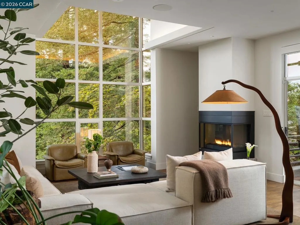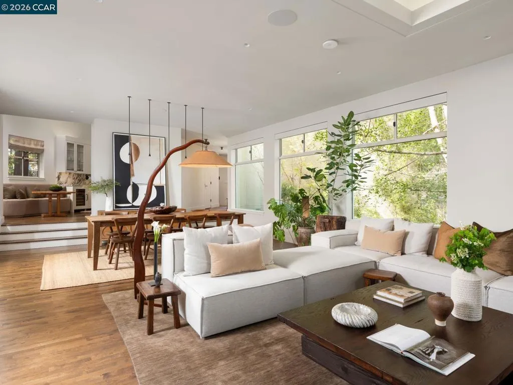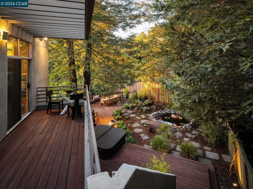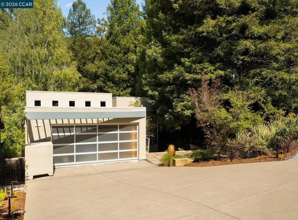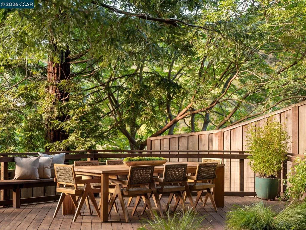 A home of rare design integrity, offering elegance and serenity on a secluded cul-de-sac in the Claremont Hills. This 3-bed, 2.5-bath home offers 2,905 sq. ft. of recently renovated living space on a double lot that spans over 14,800 sq. ft. Surrounded by a canopy of redwoods, the property blurs the boundary between architecture and landscape to create a private retreat that is still only minutes away from the Claremont Resort, Rockridge, and Piedmont Ave. Interiors by acclaimed designer Sarah Solis blend timeless materials with modern functionality. The open living areas move with ease, from a lime-washed media room anchored by a gas fireplace, through a kitchen defined by dramatic Calacatta Viola marble, soaring ceilings, and professional-grade appliances, to a light-filled great room that dissolves into the tree canopy through panoramic glass walls. In the primary suite, linen-wrapped walls produce a serene retreat, featuring a spa bath with heated floors and soaking tub; custom walk-in closets; and private garden and hot tub access. The home has fully upgraded HVAC, electrical, and Vivint security systems, multi-zone heating and air conditioning, Lutron Smart Home drapes and lights, audio with ceiling speakers throughout, and elite SubZero, Miele, and Wolf appliances.