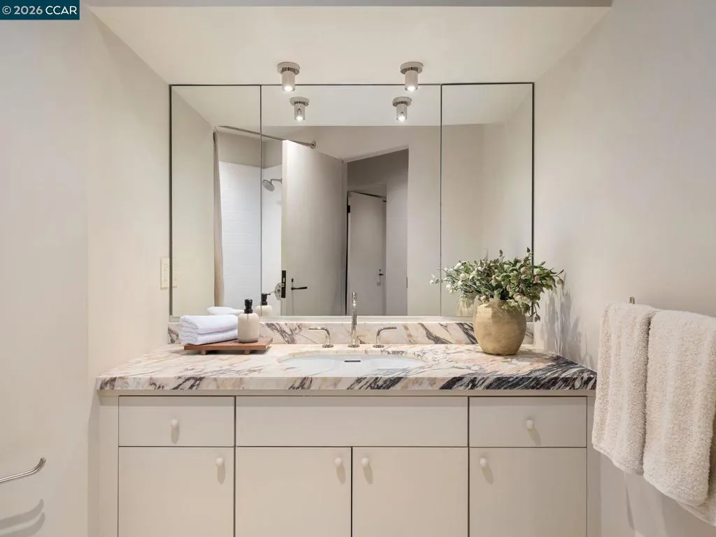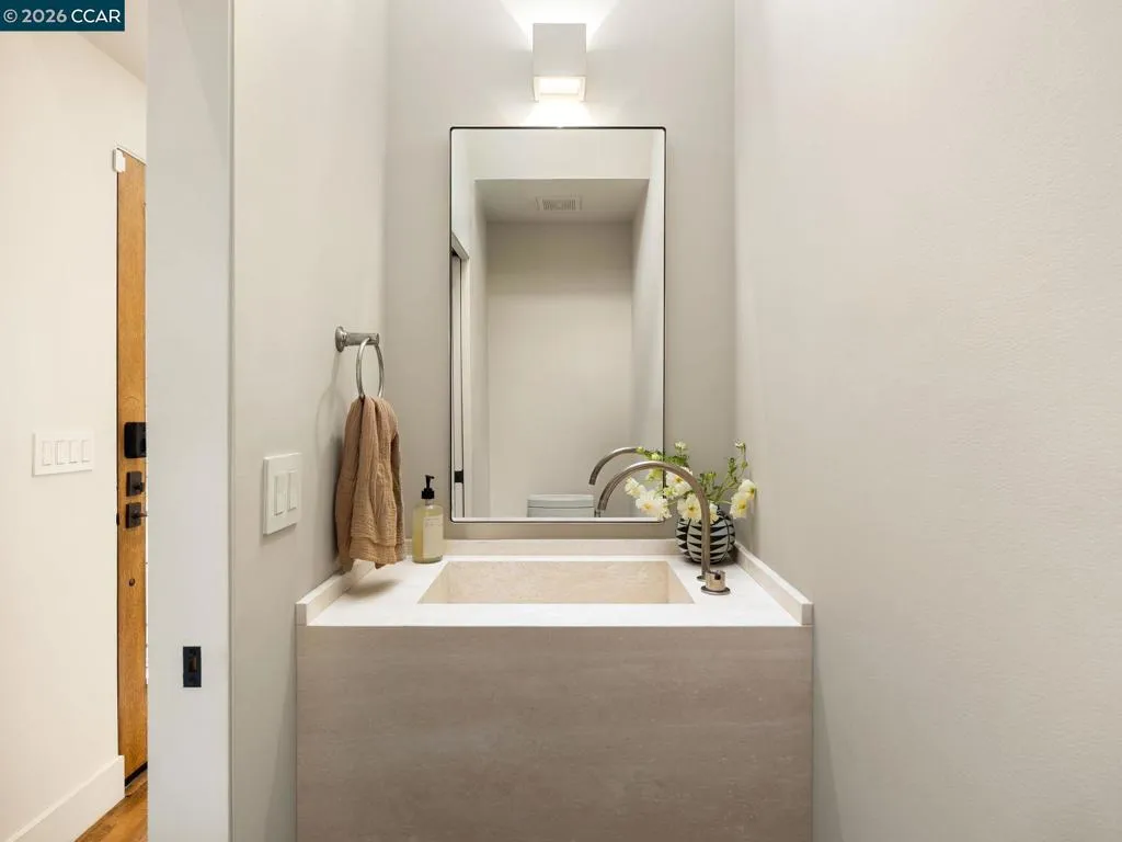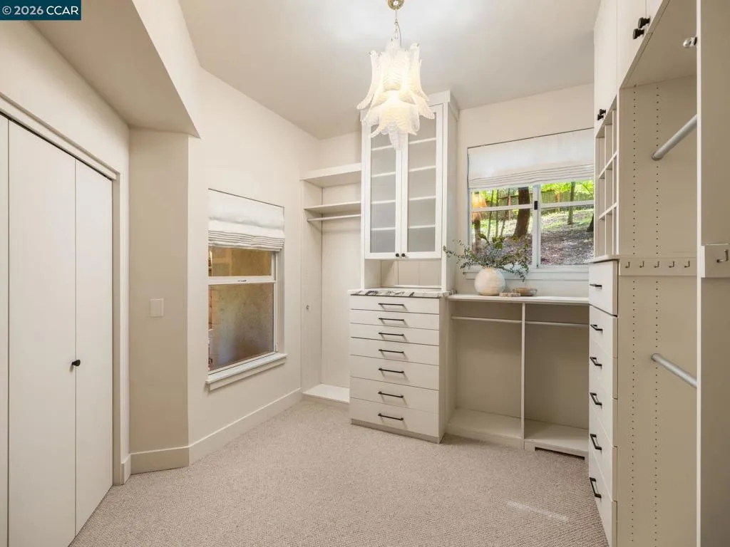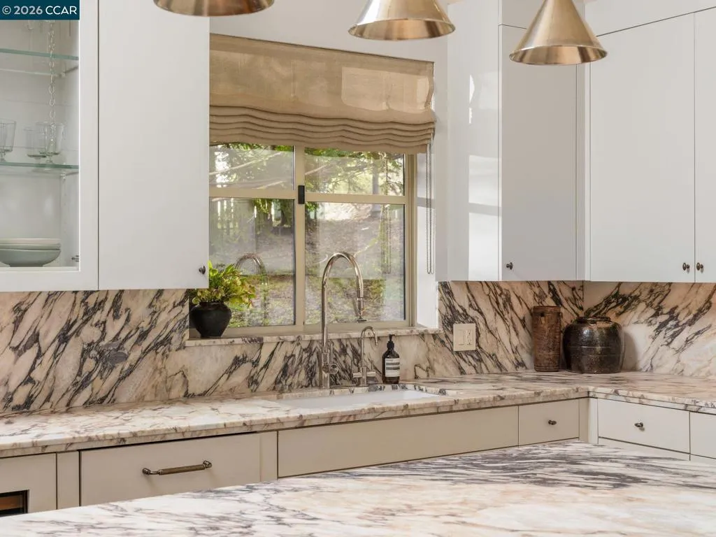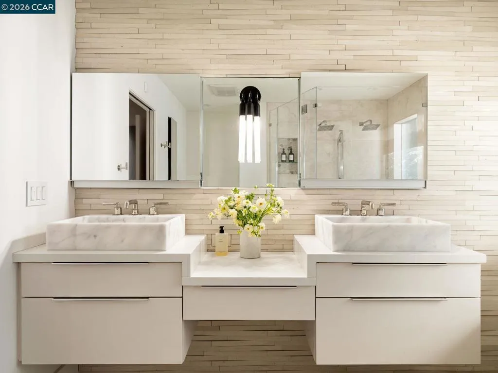 A home of rare design integrity, offering elegance and serenity on a secluded cul-de-sac in the Claremont Hills. This 3-bed, 2.5-bath home offers 2,905 sq. ft. of recently renovated living space on a double lot that spans over 14,800 sq. ft. Surrounded by a canopy of redwoods, the property blurs the boundary between architecture and landscape to create a private retreat that is still only minutes away from the Claremont Resort, Rockridge, and Piedmont Ave. Interiors by acclaimed designer Sarah Solis blend timeless materials with modern functionality. The open living areas move with ease, from a lime-washed media room anchored by a gas fireplace, through a kitchen defined by dramatic Calacatta Viola marble, soaring ceilings, and professional-grade appliances, to a light-filled great room that dissolves into the tree canopy through panoramic glass walls. In the primary suite, linen-wrapped walls produce a serene retreat, featuring a spa bath with heated floors and soaking tub; custom walk-in closets; and private garden and hot tub access. The home has fully upgraded HVAC, electrical, and Vivint security systems, multi-zone heating and air conditioning, Lutron Smart Home drapes and lights, audio with ceiling speakers throughout, and elite SubZero, Miele, and Wolf appliances.