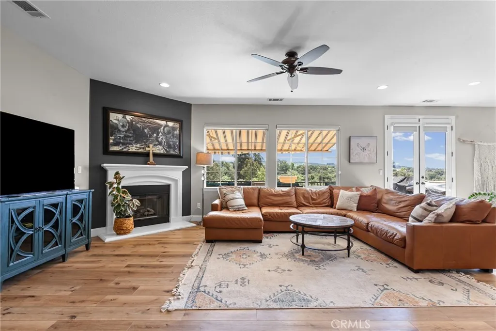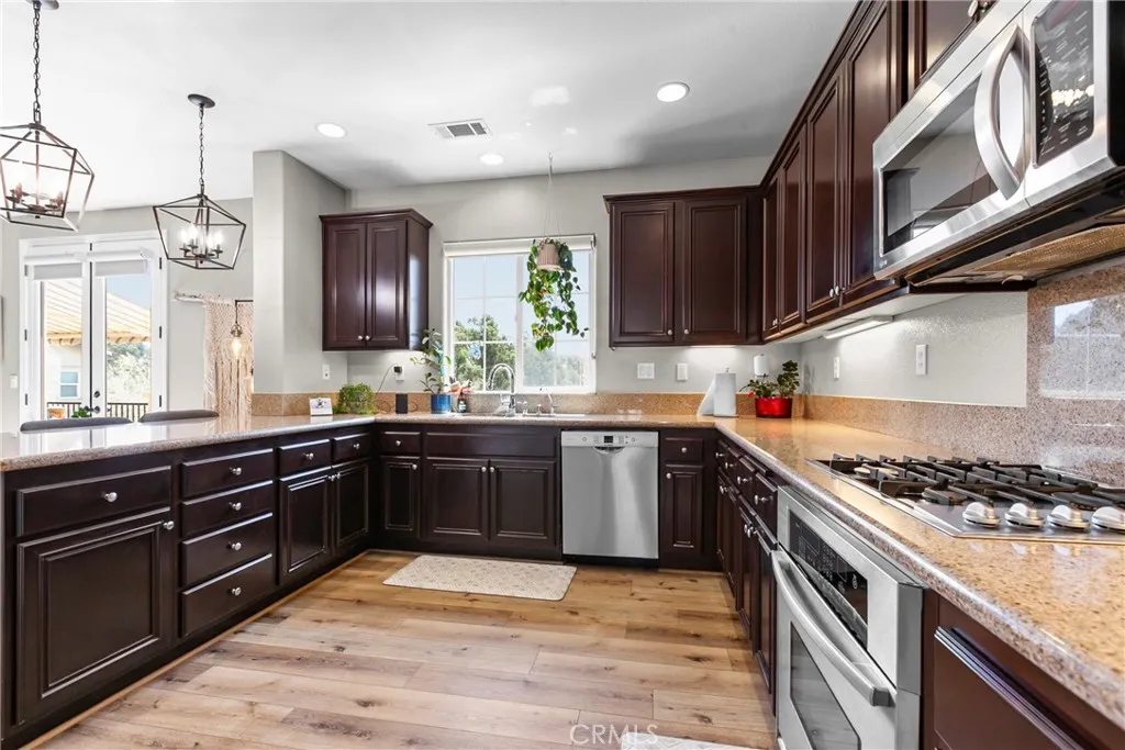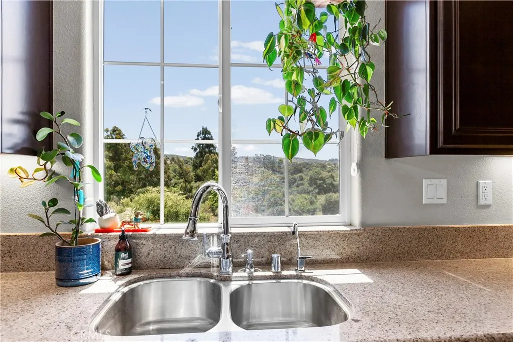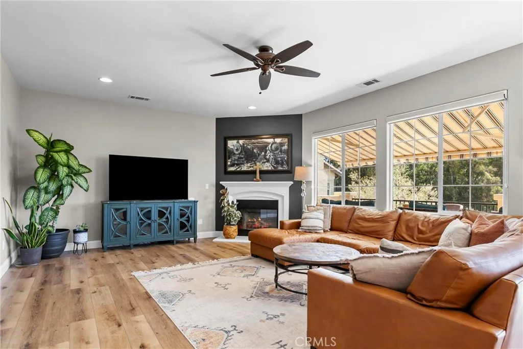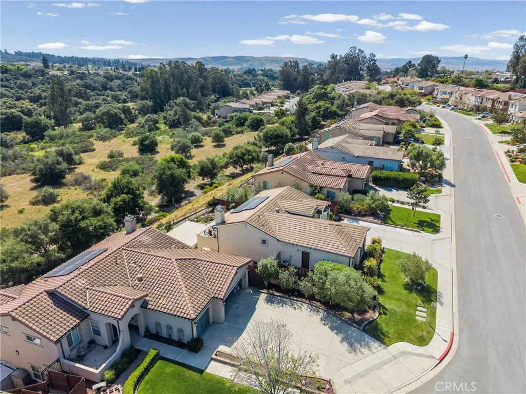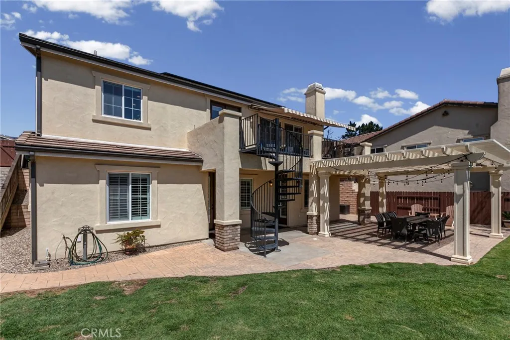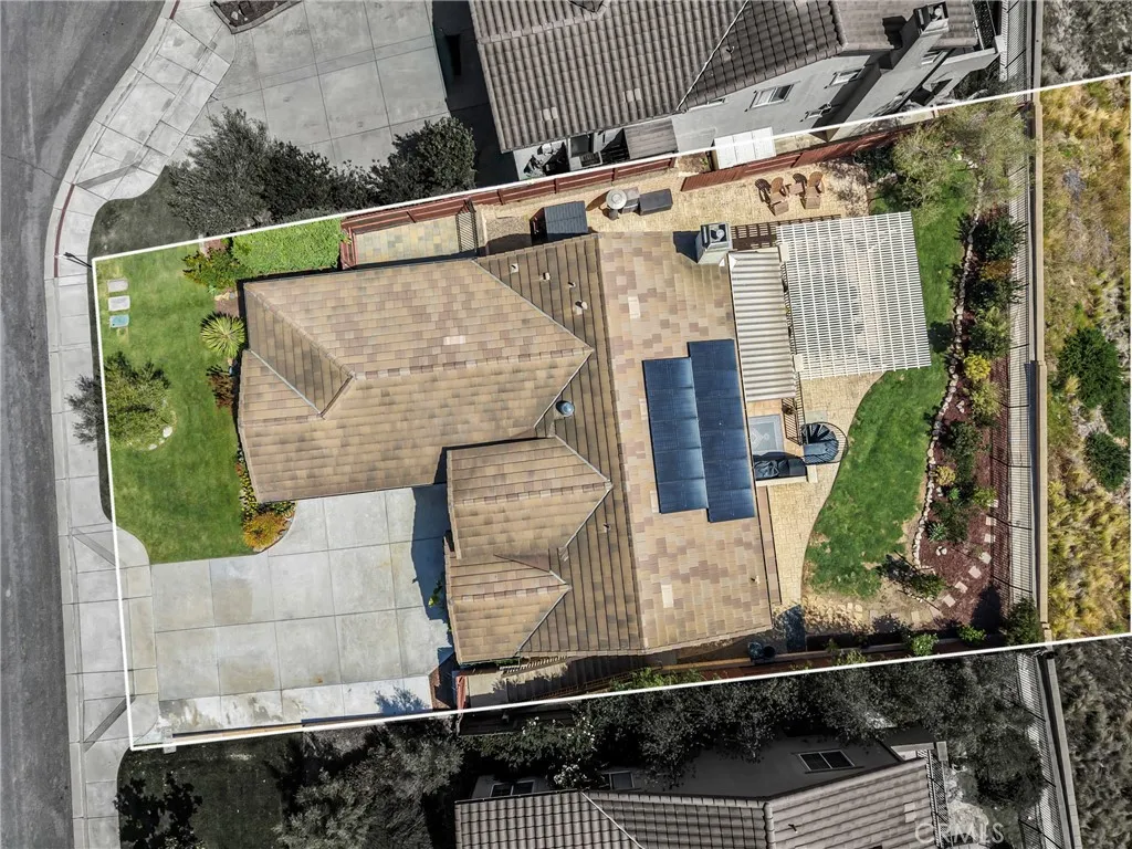 Welcome to this beautifully upgraded home located on a premium view lot with no rear neighbors, offering privacy and stunning open space views. This 3-bedroom, 2.5 bath home features approximately 2,396 sq ft of thoughtfully designed living space with an open-concept layout perfect for modern living. The interior showcases wide plank flooring, spacious living areas, and a well-appointed kitchen with ample cabinetry, granite countertops, and stainless steel appliances. Natural light pours in through large windows, creating a warm and inviting atmosphere throughout. Thoughtfully designed floor plan featuring an open-concept main level and a private upstairs layout with all bedrooms conveniently situated together. Each bedroom offers direct private access to outdoor space, creating a rare indoor-outdoor living experience. The primary suite includes a generous walk-in closet, and the home offers additional storage, including space beneath the staircase. Step outside to your private backyard retreat, complete with a covered pergola, expansive stamped concrete patio, and beautifully landscaped yard with avocado and citrus trees perfect for entertaining or relaxing while enjoying the peaceful surroundings. The elevated balcony and spiral staircase enhance an expansive stamped-concrete patio and an indoor-outdoor lifestyle. Additional features include a dedicated outdoor tool shed for extra storage or workspace, and energy-efficient living with fully PAID-OFF solar and 2 electric heaters. Don’t miss this rare opportunity to own a home with a premium lot, exceptional outdoor living space, and standout features throughout.