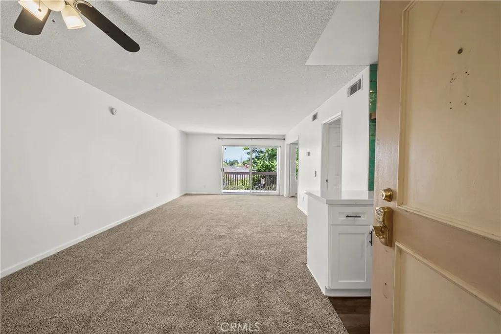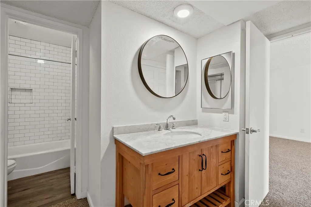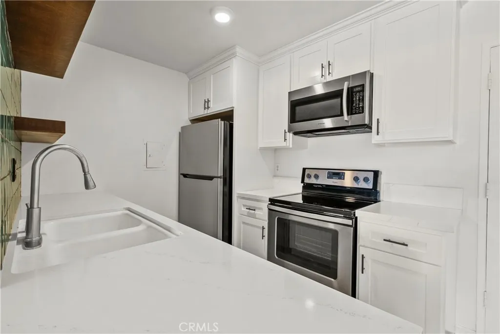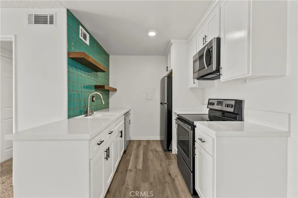 Light, bright, and move-in ready 1-bedroom, 1-bath condo in the heart of Valencia, located in the desirable Old Orchard community. This upper-level home is filled with natural light pouring in through sliding glass doors leading to a private balcony. It features an open floor plan with a spacious living room and dining area, complemented by updated vinyl flooring. The renovated kitchen offers quartz countertops, white cabinetry, a custom backsplash, and newer stainless steel appliances; refrigerator included. The large primary bedroom features two generously sized closets, an en-suite split bathroom with a quartz vanity, and almost new carpet throughout the unit. Additional upgrades include fresh interior paint, updated ceiling fans, modern window coverings, a new bathroom light fixture and fan, and added shelving for extra functionality. HOA dues include water and trash, residents enjoy resort-style amenities including pools, spa, tennis courts, a gym, clubhouse, and community laundry. Ideally located near parks, the Valencia paseo trail system, shopping, dining, freeway access, and the Metrolink. This home offers a comfortable, convenient lifestyle in a well-established community.