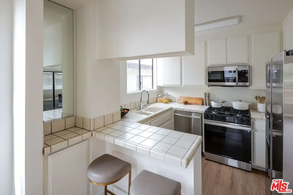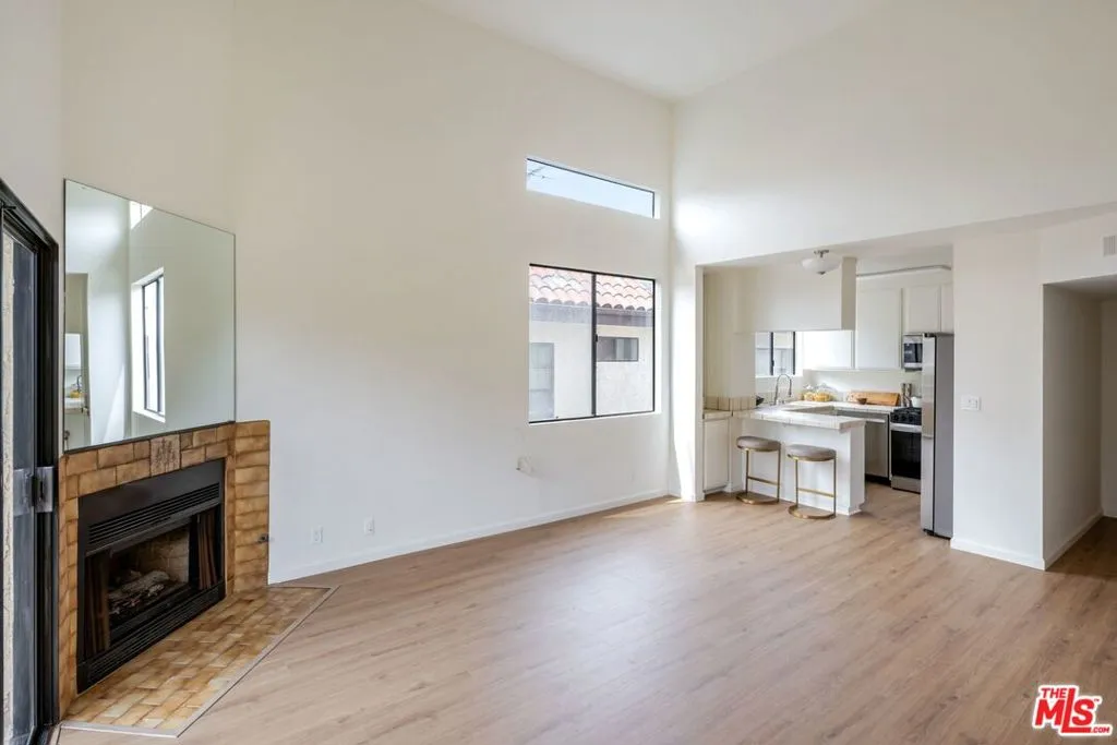 This gorgeously refreshed top-floor 2+2 condo is perched in a quiet, intimate building in the heart of West LA and offers the perfect blend of comfort, style, value and location! With no one above you and dramatic vaulted ceilings in the living room, the home feels bright, open, and filled with natural South-Western light throughout. The spacious living room is anchored by a charming fireplace and opens seamlessly to a sunny south-facing balcony ideal for morning coffee or unwinding at the end of the day in the afternoon sun. All freshly painted with brand-new laminate flooring throughout, the interiors feel crisp, modern, and move-in ready. The open kitchen features all brand-new stainless steel appliances, clean lines, ample cabinetry, and a welcoming breakfast bar for 2 that flows effortlessly into your main living space perfect for both everyday living and private entertaining. Both bedrooms are generously sized, with great light and storage, while the traditional layout offers ideal separation and privacy too. Set in a well-maintained, smaller complex, this quiet home delivers a sense of calm and respite, just moments from everything bustling. In-unit laundry & 2 side by side gated parking spaces. Enjoy unbeatable proximity to all the shops, retail and dining along the Bundy Wilshire corridor, with easy access to UCLA, Westwood, Santa Monica, Brentwood Village plus close access to both the 405 and 10 freeways. A rare opportunity to own a light-filled, top-floor retreat in one of West LA's most convenient pockets that is offered at an exceptional value and is sure to move quickly!