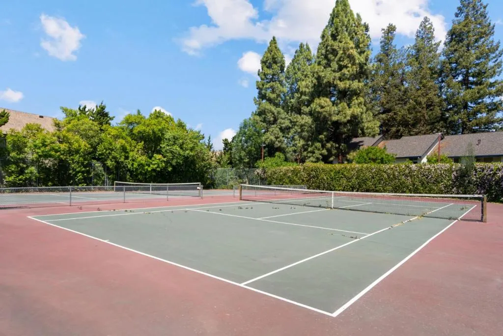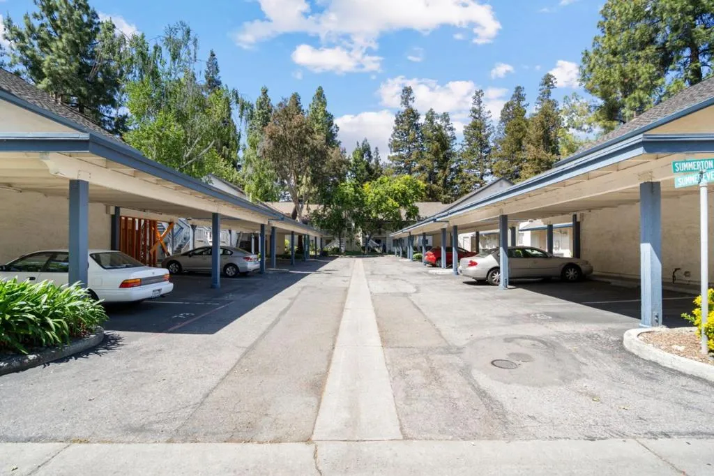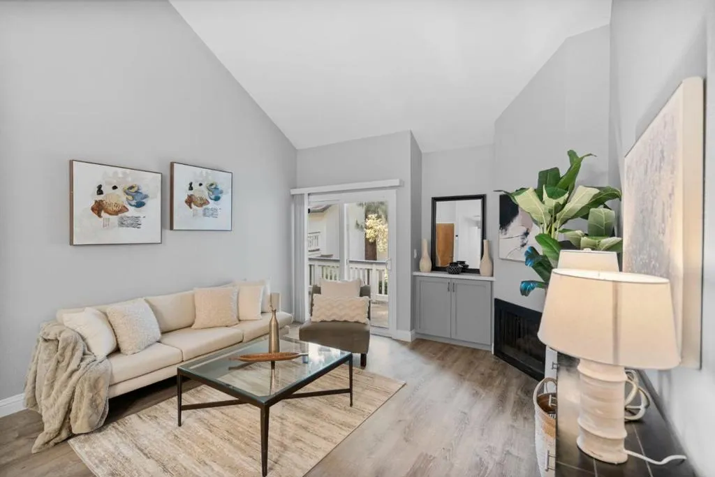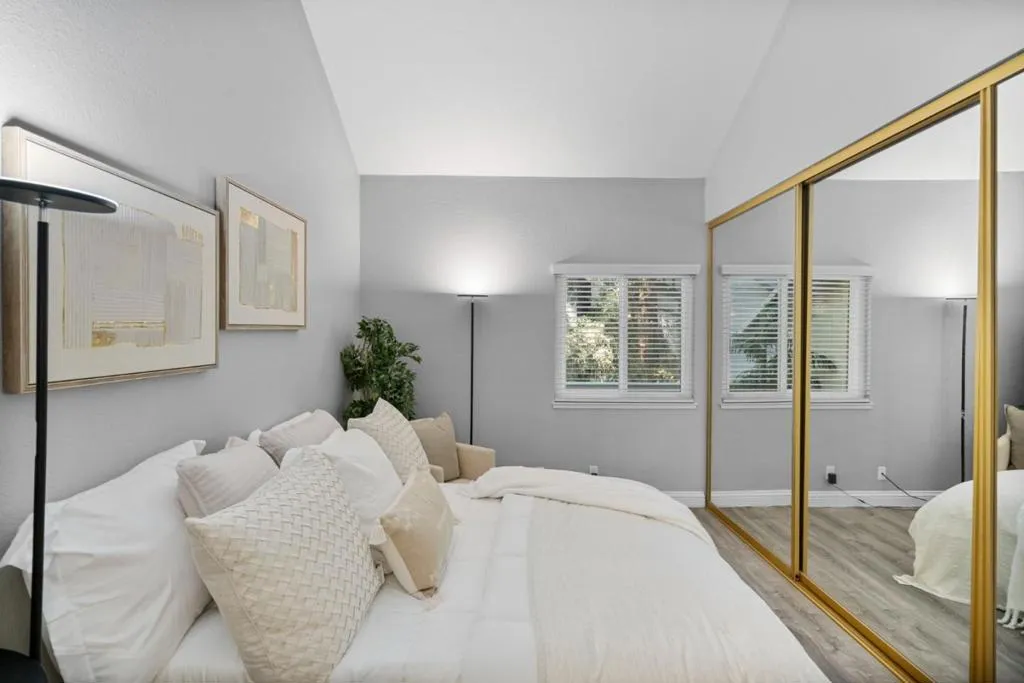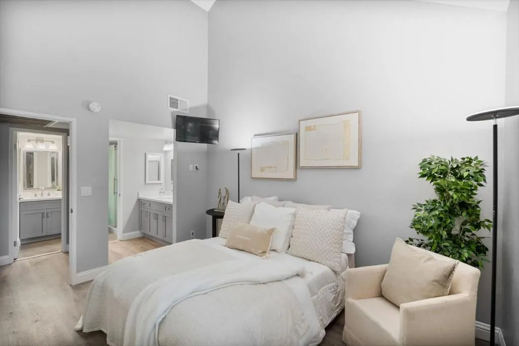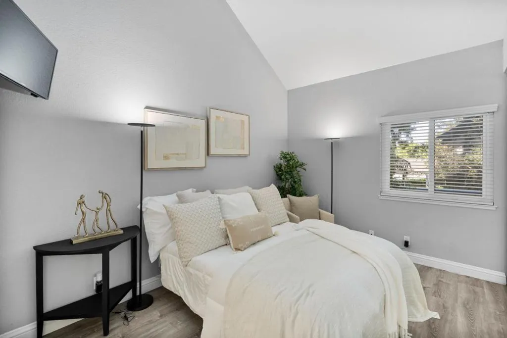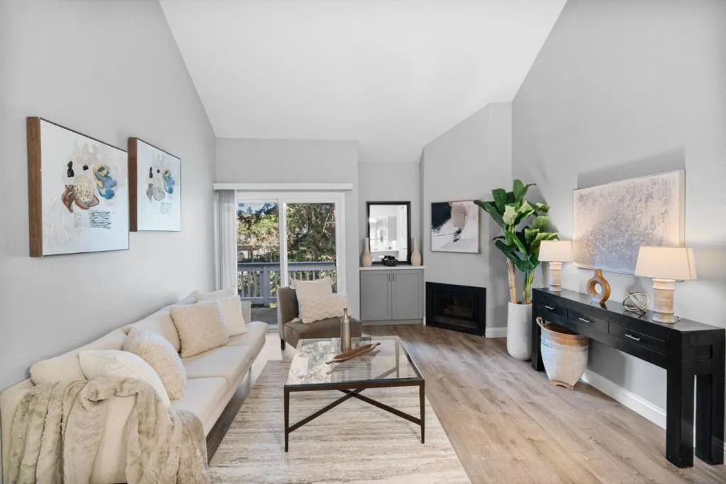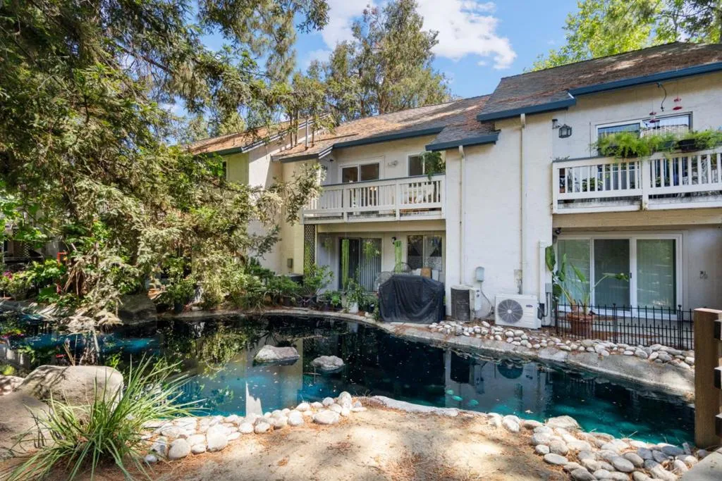 OPPORTUNITY TO OWN FOR CLOSE TO WHAT YOU ARE PAYING IN RENT. | Beautifully maintained 1-bed, 1-bath home offering comfort & convenience in a tranquil, Tahoe like setting; perfect for professionals, first-time buyers, commuters, investors & downsizers. Nestled in a well-kept gated community, this home features modern flooring throughout & a bright, open living space highlighted by a cozy fireplace & cathedral style vaulted ceilings. This spacious living area flows seamlessly to private outdoor space, perfect for relaxing & enjoying serene views of the community's lush landscaping, tranquil ponds & mature redwoods. The updated kitchen is equipped with stainless steel appliances, generous quartzite countertop space & ample storage w/under cabinet lighting. The bedroom offers a comfortable retreat with a large closet & high ceilings, while the home includes the convenience of an in-unit full-size washer & dryer. Community amenities feature a swimming pool, tennis courts, scenic walking paths & peaceful water features. HOA covers water, garbage, roof, exterior maintenance & cable TV w/DVR, providing added value & ease of ownership. Quick access to major routes (101, 280, 680, 87) & just minutes from shopping, dining & essentials | DONT MISS THIS AFFORDABLE ENTRY INTO SILICON VALLEY.