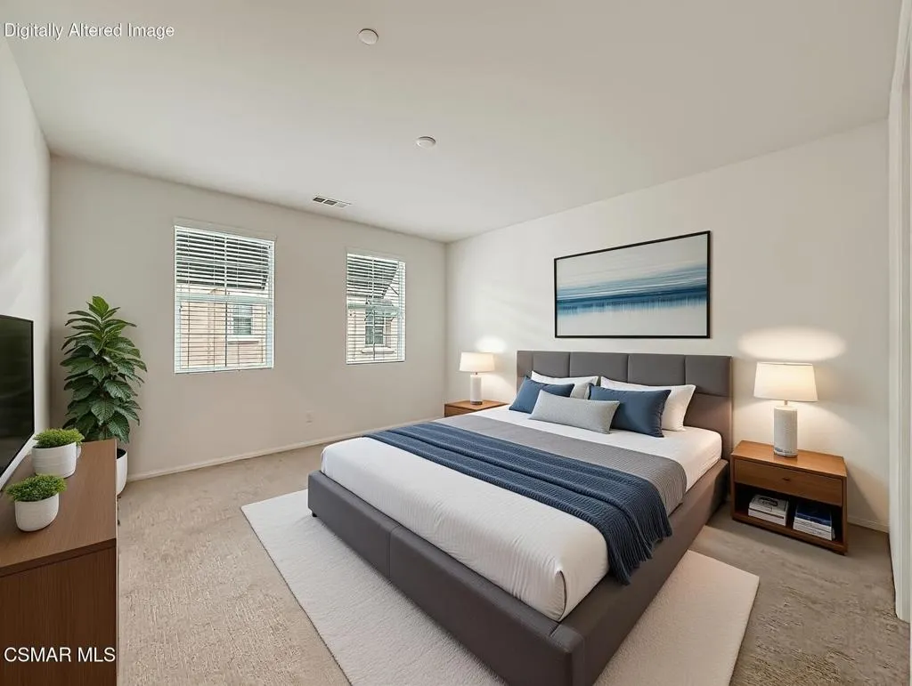 Welcome to this beautifully maintained townhome in Camarillo's desirable Teso Robles community, where modern design, energy efficiency, and a highly functional layout come together seamlessly. Built in 2018, this newer construction residence offers the ideal blend of comfort and convenience in one of the area's most sought-after neighborhoods.The open-concept main level creates an inviting atmosphere, effortlessly connecting the living room, dining area, and kitchen into one bright, cohesive space--perfect for both everyday living and entertaining. A convenient powder room, additional storage, and direct access to the attached two-car garage enhance the home's thoughtful design.The kitchen is both stylish and practical, featuring quartz countertops, GE appliances, and updated window shutters, providing a clean, modern aesthetic with plenty of functionality for cooking and gathering.Upstairs, the layout truly shines with two private primary suites, each with its own full bathroom--an ideal setup for roommates, guests, or anyone who appreciates added privacy. One suite offers a spacious walk-in closet and a well-appointed bathroom with dual sinks and elegant stone finishes. A dedicated upstairs laundry area with washer and dryer adds to the home's everyday ease.Designed with efficiency in mind, the property includes Tesla solar panels, a tankless water heater, energy-efficient appliances, and a 14-50 NEMA outlet in the garage for EV charging--helping keep utility costs manageable while supporting a modern lifestyle.Residents of Teso Robles enjoy access to a range of community amenities, including a private dog park, gated spa, and a fully furnished clubhouse complete with a kitchen and BBQ area--perfect for hosting gatherings or relaxing with neighbors. The home also includes two parking passes, providing convenient accommodations for both one resident and one guest.Ideally located with easy access to the 101 freeway, shopping, dining, and everyday conveniences, this home offers a connected and comfortable Camarillo lifestyle with all the right upgrades in place.