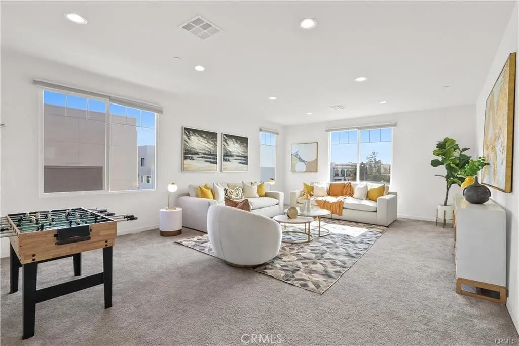 This beautiful townhouses, built in 2019, with only one wall attached, is located in the highly desirable Great Park Modo community of Irvine and features an open floor plan with nearly 10-foot ceilings that create a bright and airy living environment. Upon entry, the upgraded kitchen sits to the left and showcases stainless steel appliances and a walk-in pantry, combining style and functionality, while the living room to the right opens to a private patio through a sliding glass door for seamless indoor-outdoor living. Upstairs, the primary suite offers large windows with neighborhood views and an en-suite bathroom with a generous walk-in closet, while two additional southeast-facing bedrooms provide abundant natural light. The versatile third-floor bonus room can be used as a playroom, office, or media room and features both a private balcony and a spacious deck on opposite sides, perfect for relaxing or entertaining while enjoying community views and glimpses of Saddleback Mountain. Residents of Great Park enjoy access to exceptional amenities including resort-style pools, parks, sports courts, scenic trails, an ice skating rink, and the nearby FivePoint Amphitheatre, with the upcoming Canopy retail and dining hub offering approximately 12 acres of shopping and everyday conveniences. Conveniently located near the Irvine Spectrum, major freeways (I-5, 405, and 133), and within the award-winning Irvine Unified School District.