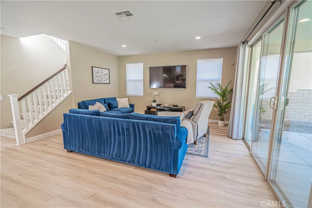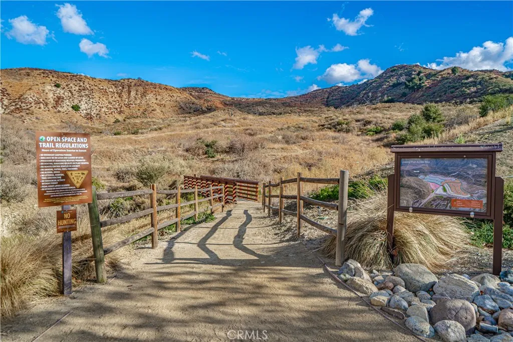 Stunning Mediterranean-Style Home in the Desirable Aliento Gated Community! Beautiful 4-bedroom, 3-bathroom home offers a perfect blend of modern amenities and traditional charm. ALL-NEW LVP FLOORING AND HIGH-PROFILE BASEBOARDS DOWNSTAIRS!! One bedroom and a full bathroom on the main floor, it’s ideal for guests or extended family. Step into the inviting foyer and be greeted by a spacious open floor plan, wood-look laminate flooring, and soaring ceilings. Living room features double sliding glass doors that open to a covered Arizona-style outdoor living space and a pool-sized rear yard—perfect for entertaining or relaxing outdoors. The gourmet kitchen is a true centerpiece, boasting a large center island with breakfast bar seating, granite countertops, stainless steel sink, pendant lighting, abundant cabinetry, high-end stainless steel appliances, a custom tile backsplash, and an extended counter area. Large pantry and a butler’s pantry provide plenty of storage and entertaining space. Just off the kitchen, an office nook with a built-in desk offers a convenient work-from-home solution. Upstairs, you’ll find a versatile loft area (could be a fifth bedroom), two additional bedrooms, and a spacious hallway bathroom with a double sink vanity. The luxurious primary suite is filled with natural light, features a large walk-in closet, and a spa-like bathroom with quartz countertops, dual vanity, soaking tub, and separate walk-in shower with seamless glass doors. Additional features include recessed lighting, dual-controlled central AC/heat, tankless water heater, upstairs laundry, and a two-car direct access garage. Solar panels enhance energy efficiency. Residents of the gated Aliento community enjoy an exceptional array of resort-like amenities. The Terrace, the community’s recreation area, has a clubhouse, lap and family swimming pools, children’s splash pad, poolside cabanas, fitness center, bocce ball courts, and outdoor recreation spaces.? Green spaces and lawns provide plenty of room for outdoor play, picnics, and community events, along w/ barbecue areas and fire pits.?Scenic walking and hiking trails wind throughout the community and connect to nearby public trailheads, offering miles of pathways to explore the foothills.? A dog park within Aliento provides a fun, social space for four-legged residents. All of these outstanding amenities are included for homeowners through one low HOA fee, making Aliento a true lifestyle destination in Santa Clarita.