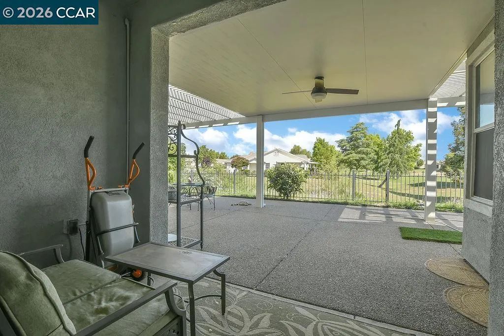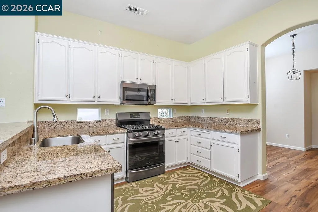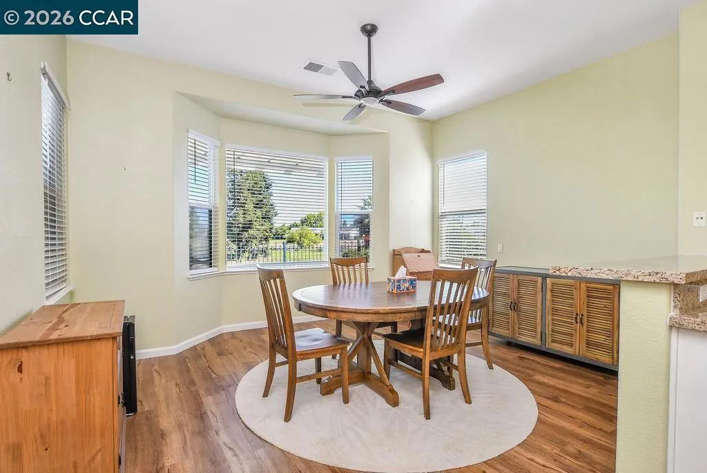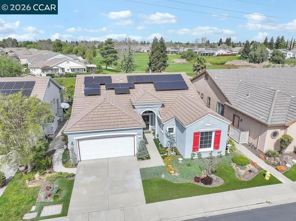 Open House this weekend Saturday and Sunday 12 to 3 PM. SELLER IS MOTIVATED! This is the Edgewood model, which is a popular open floor plan W/ 3 bedrooms, (the 3rd bedroom can be an office) with 2.5 baths, 1921 sq ft. SOLAR is Owned! Beautiful views of the golf course. There is a large living room with fireplace, and a large morning room could be used as a family room or dinette area. Beautiful wood laminate flooring & carpet in the bedrooms. There is a guest suite with bathroom & ceiling fans. A formal dining room. The primary/Master bedroom has ceiling fan, a walk-in closet, double sinks, frameless glass separate stall shower & separate tub. Kitchen has granite counters, black steel Appliances w/ gas stove, microwave, dishwasher & French door refrigerator and plenty of white cabinets. The laundry RM has sink & cabinets. Guest half bathroom. The garage is considered a 2.5 car w/room for a golf cart or a workshop. There is a tankless water heater. The lot is 5,700 sq ft with patio & patio overhang with ceiling fan, low maintenance yard & fruit trees completely fenced for your puppy. The home is backing to open space and the first hole of the golf course. Located in Summerset 2, a 55+ senior development with monthly HOA fee of $142 which includes: security gates, Pool, Spa, Gym, Club House, Bocce courts, tennis courts, walking trails, activities and more. Just minutes away from Kaiser Hospital & John Muir, Safeway & CVS.