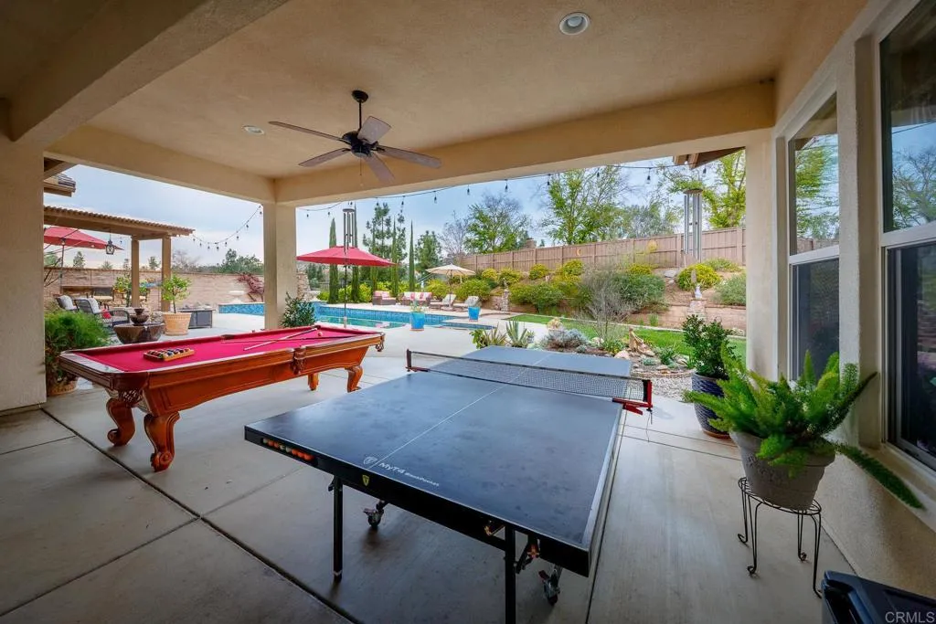 Welcome to this beautifully appointed single-level home tucked into a quiet cul-de-sac in the gated Woods Valley community of Valley Center, surrounded by the Native Oaks Golf Course. Bordering the 9th hole, this 4-bedroom, 4-bath residence offers 3,406 sq ft of open-concept living on .47 acres. Guests are welcomed through an open-air wrought-iron courtyard into the formal living and dining rooms, featuring three sets of French doors that open to the backyard—ideal for indoor-outdoor entertaining. The expansive great room includes a chef’s kitchen with quartz countertops, oversized island with seating, walk-in pantry, vessel sink, wine refrigerator, five-burner cooktop, dual ovens, built-in refrigerator, glass backsplash, pendant lighting, abundant cabinetry, prep space, and a breakfast nook with an adjoining family room featuring a stone fireplace and custom built-ins. Additional access leads to the covered patio. The private primary suite is thoughtfully separated from the guest bedrooms and offers French door access to a peaceful sitting area. The en-suite bath includes a soaking tub, walk-in shower, dual vanities, and a spacious walk-in closet. A large private office is nearby for the at home business or family library/music room. In addition a versatile bonus room works well as a playroom, craft space, or media area situated on the guest side of the home. One guest bedroom features an en-suite bath, while two additional bedrooms share a Jack-and-Jill bathroom with dual sinks. The front yard showcases drought-tolerant landscaping with natural stone accents and convenient access to the golf course—perfect for walking to lunch or dinner at Native Oaks Golf Course. The backyard is designed for year-round enjoyment with an oversized covered patio, sparkling saltwater Pebble Tec pool and spa with fire bowls, pavers, and a charming stone arbor seating area accented with bistro lighting. Additional features include: Owned solar + pool solar, portable generator hookup, LVP flooring, garden shed, raised garden beds, fruit trees, golf course and hillside views, abundant natural light, and refreshing valley breezes. A rare opportunity to enjoy space, privacy, and resort-style living in one of Valley Center’s most desirable gated communities.
