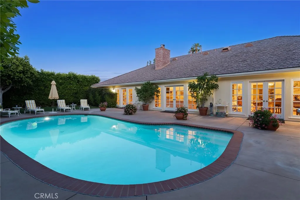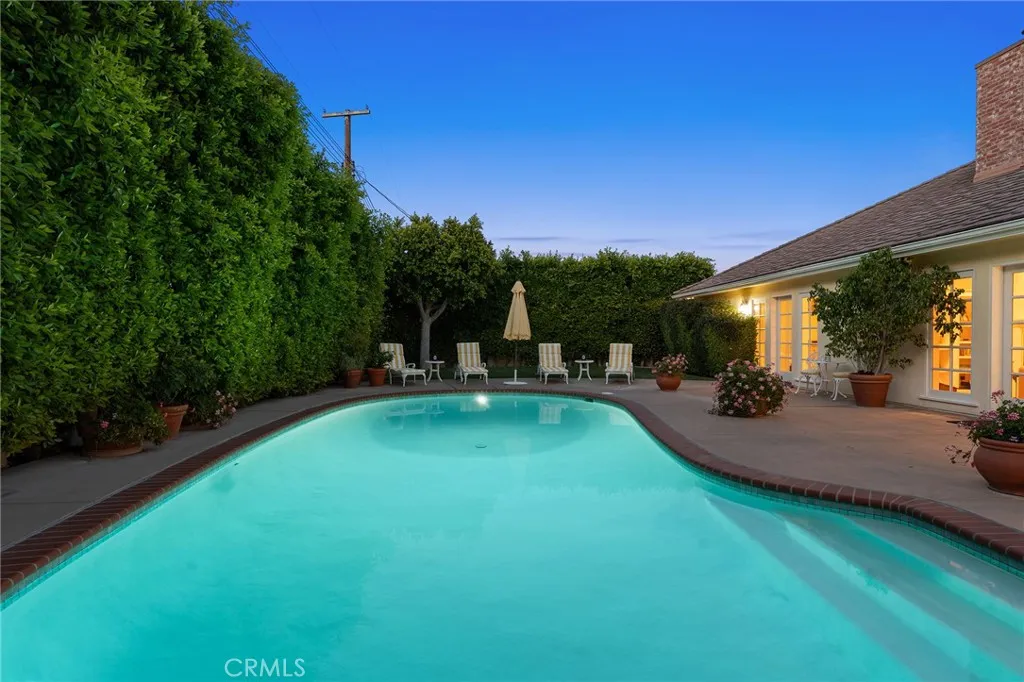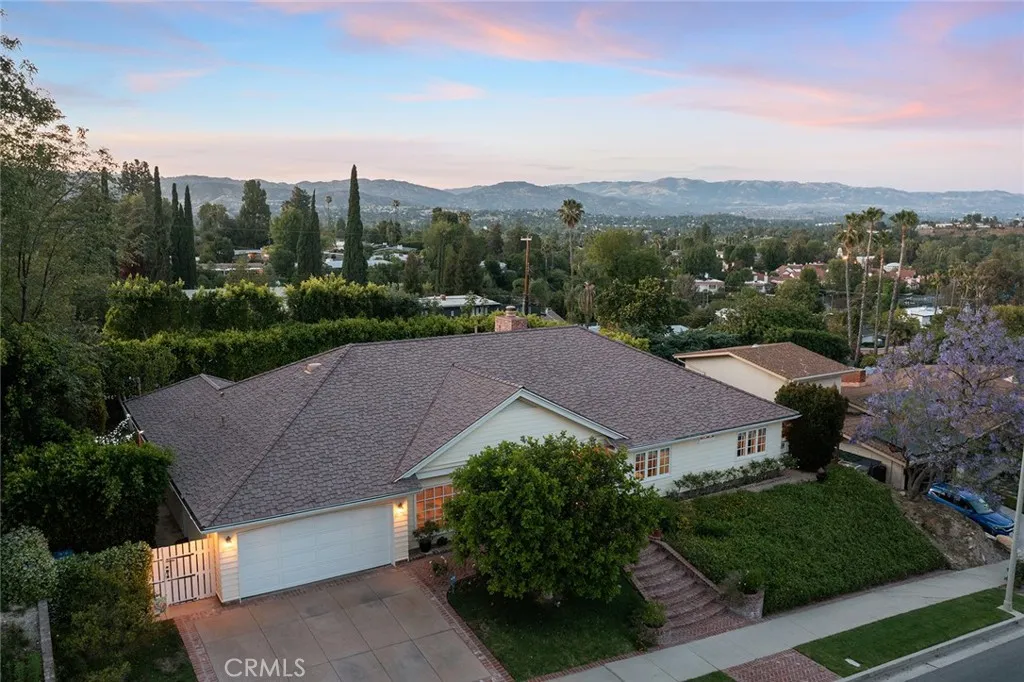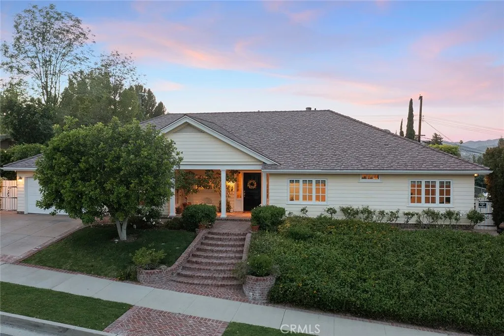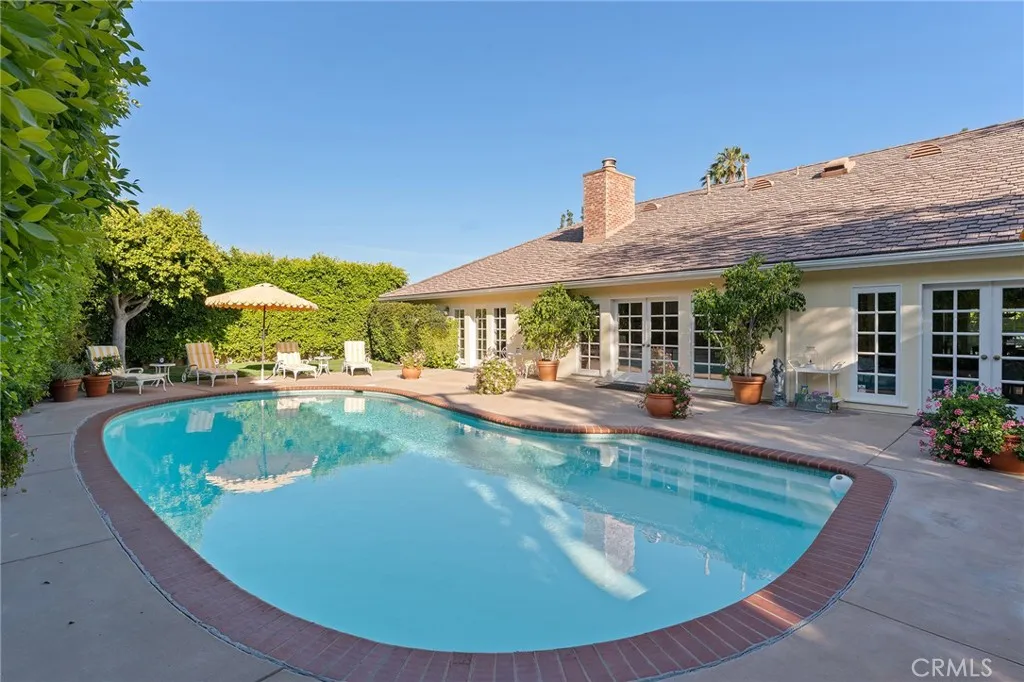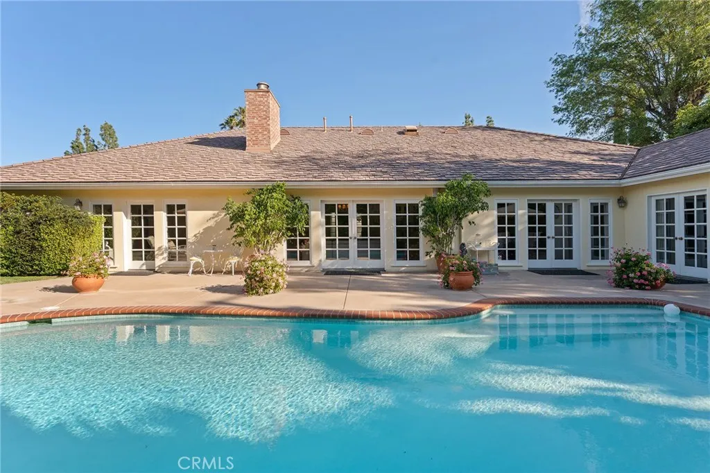 Picture perfect and extremely private single story pool home boasting incredible layout with 4 rare en-suite bedrooms! This Charles Du Bois meticulously upgraded property sits elevated above street level with 100 feet of impressive frontage and impeccable curb appeal including lush landscaping, driveway that leads to the 2-car attached garage, and brick front porch. Step inside to find a grand entry foyer that opens directly to the spacious living room flooded with natural light featuring high vaulted ceiling, French doors that open to the backyard, wood mantled tiled fireplace flanked by custom display cabinetry, and real wood flooring found throughout. A separate formal dining room can accommodate large dinner parties and has high vaulted ceiling and another set of French doors that open to the yard. The oversized kitchen has center island with second prep sink, stainless appliances including double ovens and 6-burner stove + griddle, custom pine wood cabinetry with pantry space, and separate breakfast nook. There are four well appointed bedrooms, each with their own private bathrooms and custom closets. One bedroom wing houses three of the bedroom suites with incredible extra wide hallway with several fantastic linen closets with built-ins. The luxurious primary suite has high vaulted ceiling, French door that opens to the yard, large walk-in closet with built-ins, and en-suite bathroom with dual vanities + makeup counter, bath tub, walk-in shower, and separate toilet room with bidet. The other two secondary bedrooms on the main wing each have full bathrooms with bath tubs and showers. The fourth bedroom is located on its own separate wing ideal for guests/office/flex space with an en-suite bathroom that can also be used as a pool bath, exterior access to a beautifully landscaped side yard, and French doors that open to the pool. The expansive laundry room has utility sink and custom storage cabinetry. There is also direct access to the finished 2-car garage with incredible attic storage space. The sprawling extremely private backyard features sparkling swimming pool, patio for outdoor dining, two grass lawns, large side yard adorned with beautiful landscaping and overhead string lights, and wraparound towering hedging that creates a truly private ambiance. Adjacent to Westfield Mall/Village, Calabasas Commons, Warner Center with the new Rams Village in development, local parks/hiking trails, & zoned for award-winning El Camino & Hale charter schools.