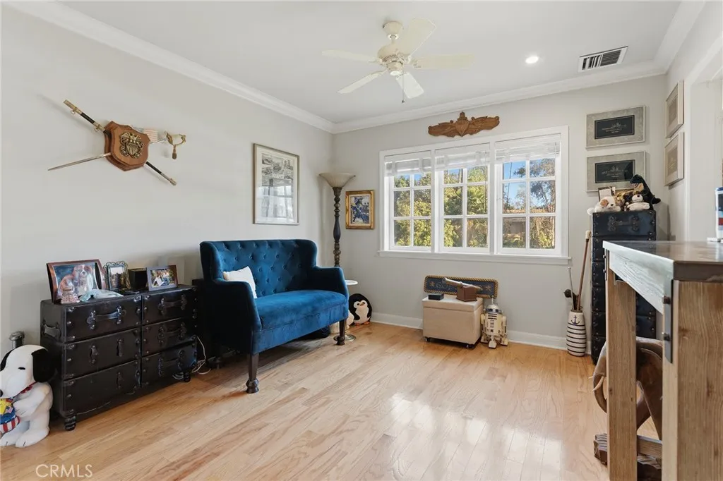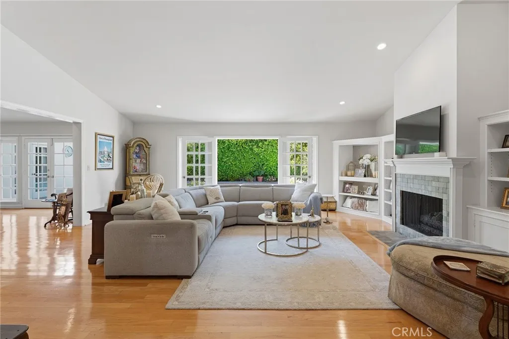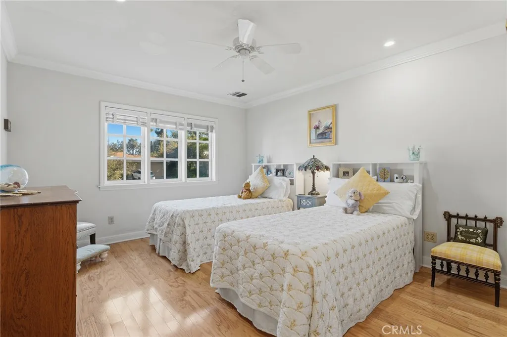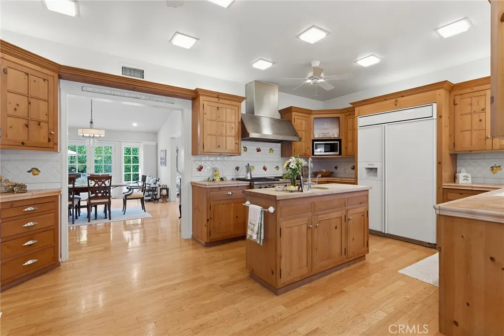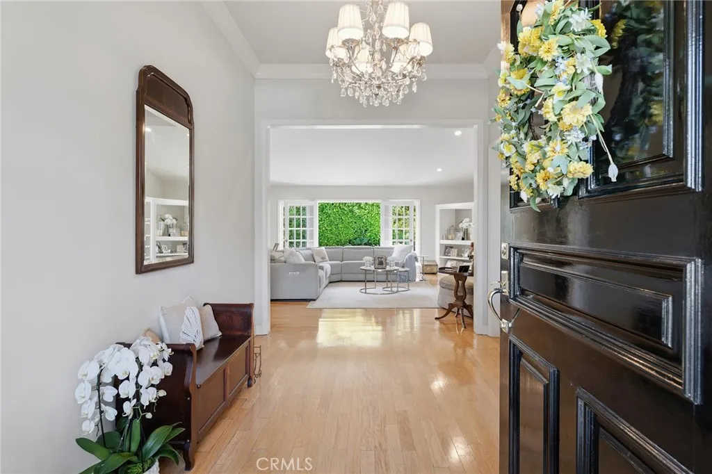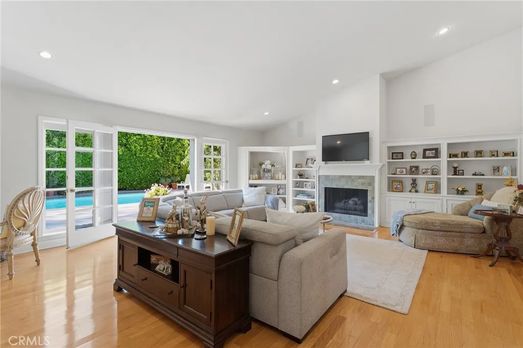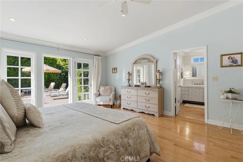 Picture perfect and extremely private single story pool home boasting incredible layout with 4 rare en-suite bedrooms! This Charles Du Bois meticulously upgraded property sits elevated above street level with 100 feet of impressive frontage and impeccable curb appeal including lush landscaping, driveway that leads to the 2-car attached garage, and brick front porch. Step inside to find a grand entry foyer that opens directly to the spacious living room flooded with natural light featuring high vaulted ceiling, French doors that open to the backyard, wood mantled tiled fireplace flanked by custom display cabinetry, and real wood flooring found throughout. A separate formal dining room can accommodate large dinner parties and has high vaulted ceiling and another set of French doors that open to the yard. The oversized kitchen has center island with second prep sink, stainless appliances including double ovens and 6-burner stove + griddle, custom pine wood cabinetry with pantry space, and separate breakfast nook. There are four well appointed bedrooms, each with their own private bathrooms and custom closets. One bedroom wing houses three of the bedroom suites with incredible extra wide hallway with several fantastic linen closets with built-ins. The luxurious primary suite has high vaulted ceiling, French door that opens to the yard, large walk-in closet with built-ins, and en-suite bathroom with dual vanities + makeup counter, bath tub, walk-in shower, and separate toilet room with bidet. The other two secondary bedrooms on the main wing each have full bathrooms with bath tubs and showers. The fourth bedroom is located on its own separate wing ideal for guests/office/flex space with an en-suite bathroom that can also be used as a pool bath, exterior access to a beautifully landscaped side yard, and French doors that open to the pool. The expansive laundry room has utility sink and custom storage cabinetry. There is also direct access to the finished 2-car garage with incredible attic storage space. The sprawling extremely private backyard features sparkling swimming pool, patio for outdoor dining, two grass lawns, large side yard adorned with beautiful landscaping and overhead string lights, and wraparound towering hedging that creates a truly private ambiance. Adjacent to Westfield Mall/Village, Calabasas Commons, Warner Center with the new Rams Village in development, local parks/hiking trails, & zoned for award-winning El Camino & Hale charter schools.
