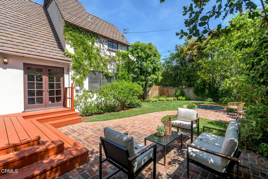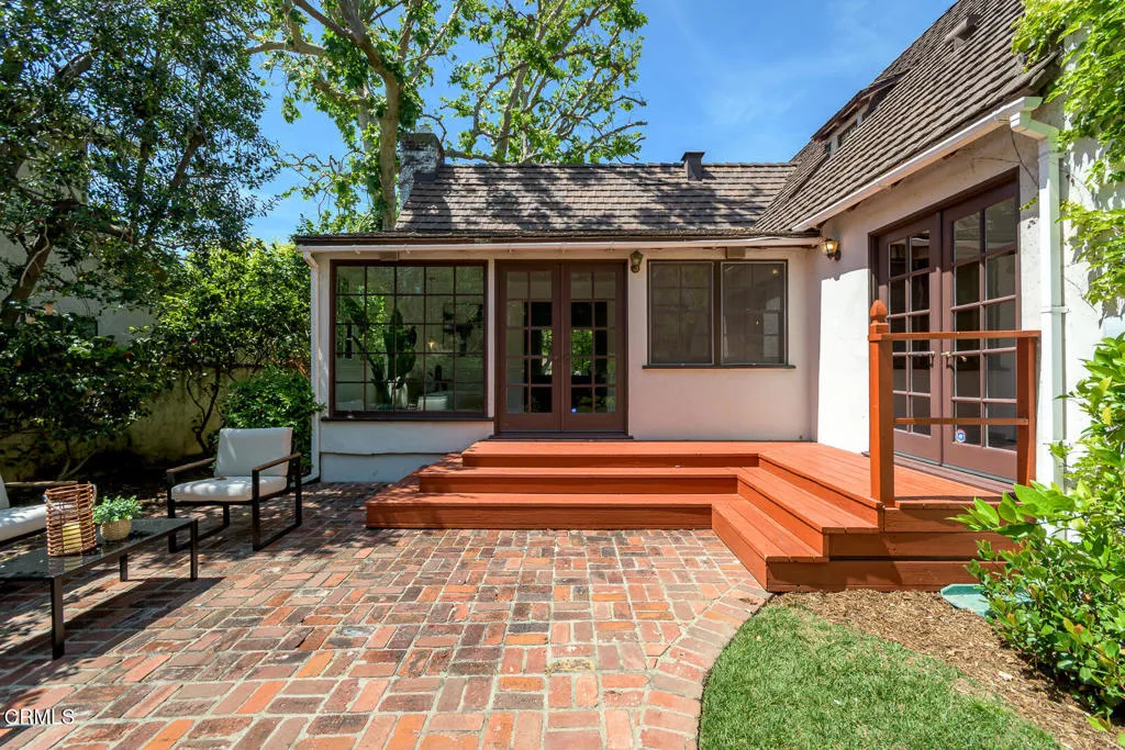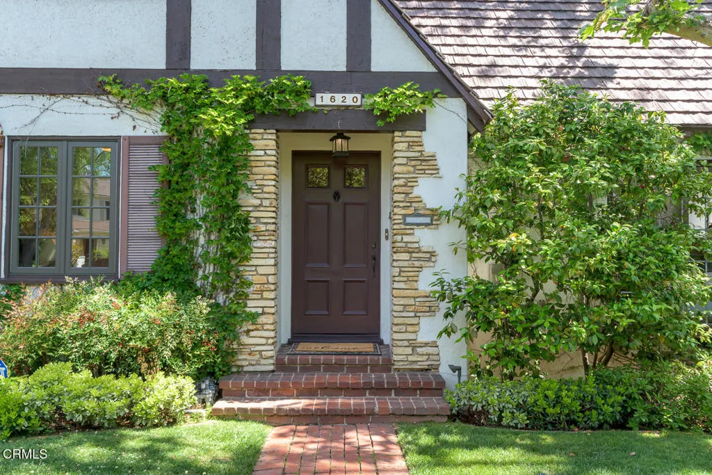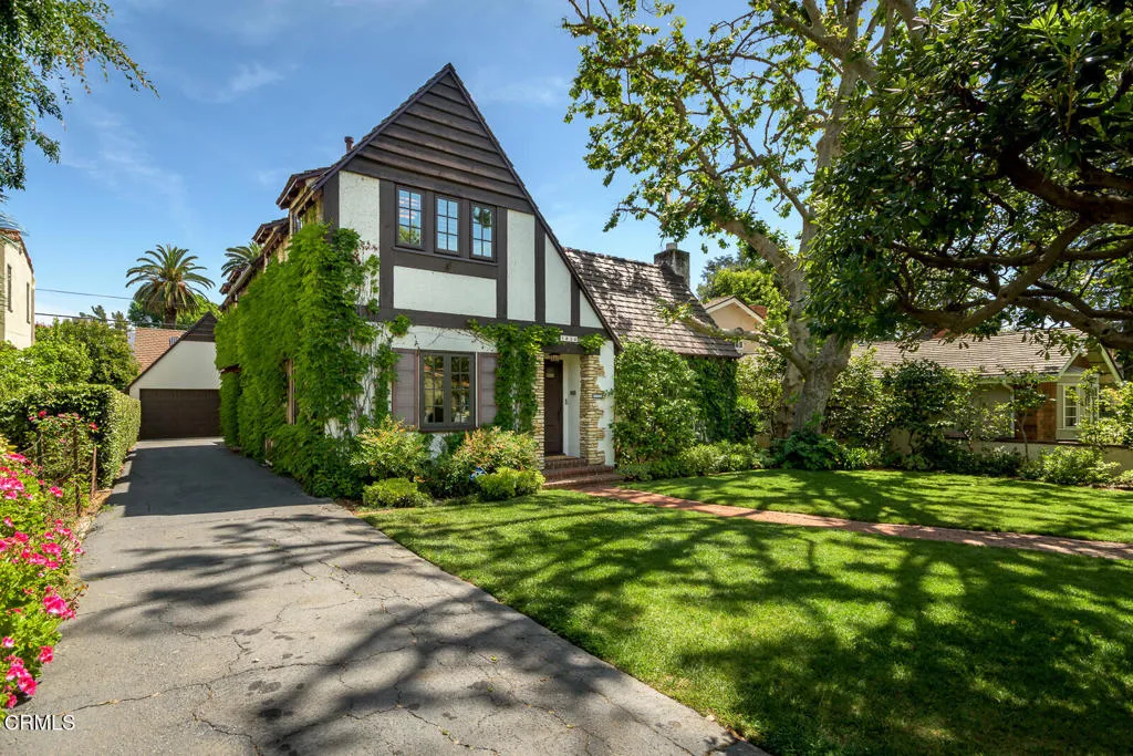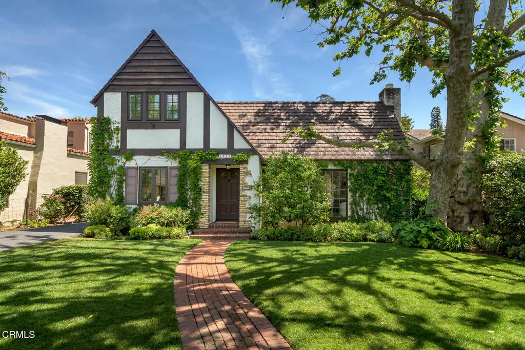 Charming English Tudor-style home in San Marino's Mission District with a sunlit layout and seamless indoor-outdoor flow. Set behind a gated brick wall, the property features a front lawn and a gently curving brick pathway leading to the entry, where mature landscaping creates a warm and inviting approach. Inside, a formal foyer opens to a spacious living room anchored by a fireplace, with a large picture window overlooking the front lawn and smaller windows flanking the fireplace that bring in natural light and architectural balance. The living room flows into a sunroom/family room wrapped in windows overlooking the backyard, where French doors and surrounding windows span much of the wall, bringing in natural light and views of the greenery outside while opening directly to the yard for a seamless indoor-outdoor connection. The formal dining room connects to both the sunroom and kitchen, offering an open yet defined space well suited for both everyday living and entertaining. The kitchen features a center island, abundant cabinetry, and a spacious breakfast nook with a built-in desk, shelving, and drawers, providing both functionality and flexible workspace. French doors from the kitchen lead to steps down to the backyard, reinforcing the home's natural connection between interior spaces and the outdoor setting. A main-level bedroom is located off the foyer, along with a three-quarter bath that also connects to the laundry room. The laundry room provides direct access to the driveway and a convenient connection to the kitchen, enhancing everyday ease. The driveway extends toward the rear of the property to a detached two-car garage, positioned within close proximity to the home. Upstairs, a window at the landing brings in natural light and a view of the driveway, creating a bright and welcoming transition to the upper level. A secondary bedroom is positioned to the left, with a hallway bathroom featuring dual sinks and a soaking tub to the right. The primary suite is located at the end of the hall and includes a bathroom with dual sinks, a separate shower and a soaking tub. The backyard features mature landscaping, open space, and an in-ground spa, offering a private and inviting outdoor setting for relaxation or casual gatherings. A home that blends classic character with everyday comfort in a desirable San Marino setting.