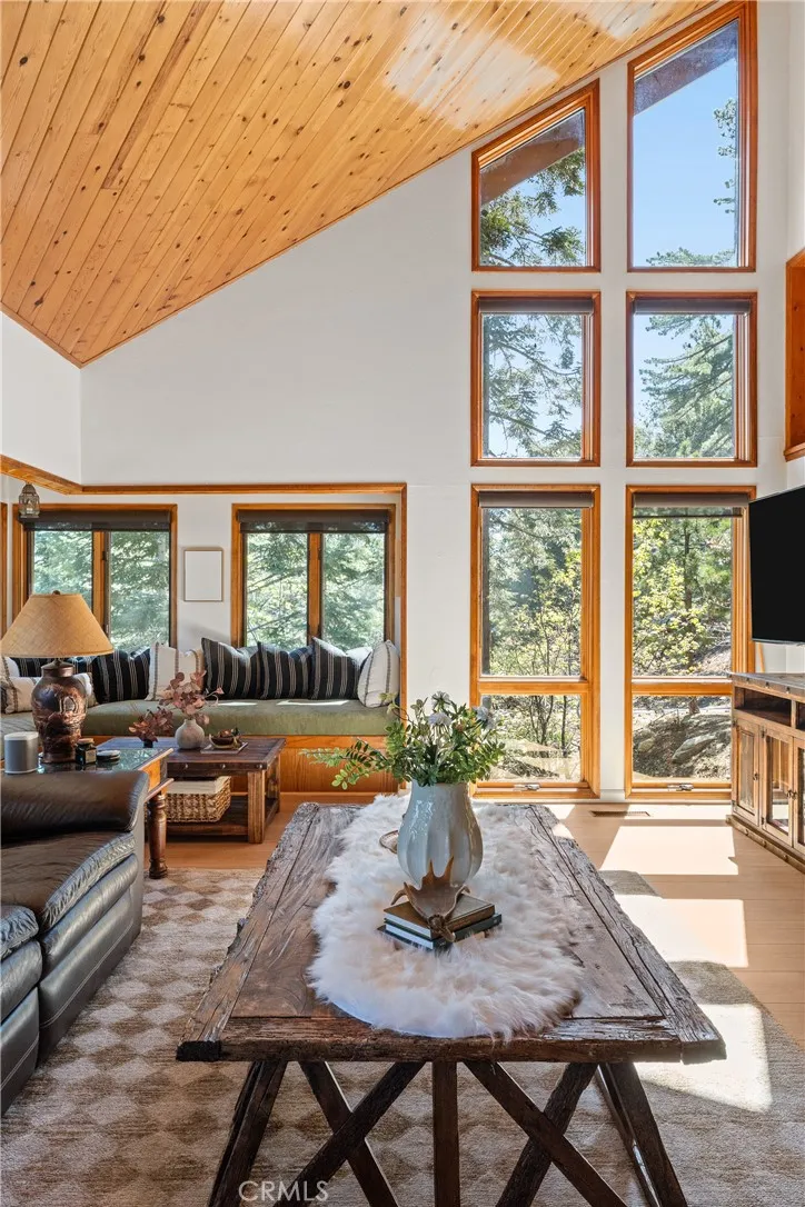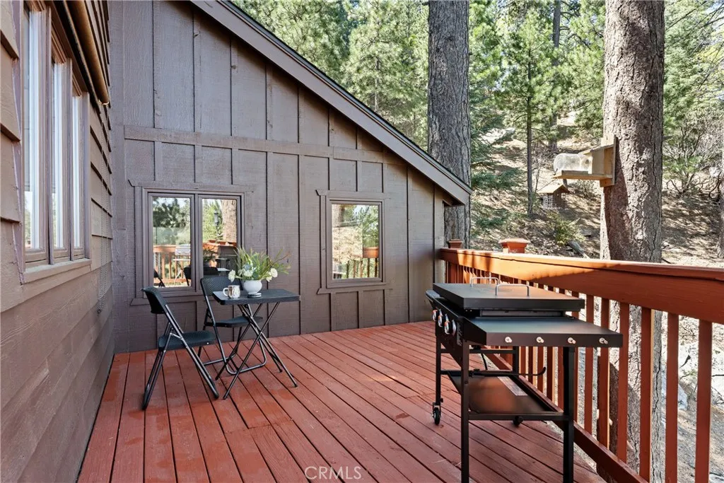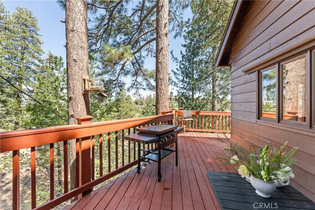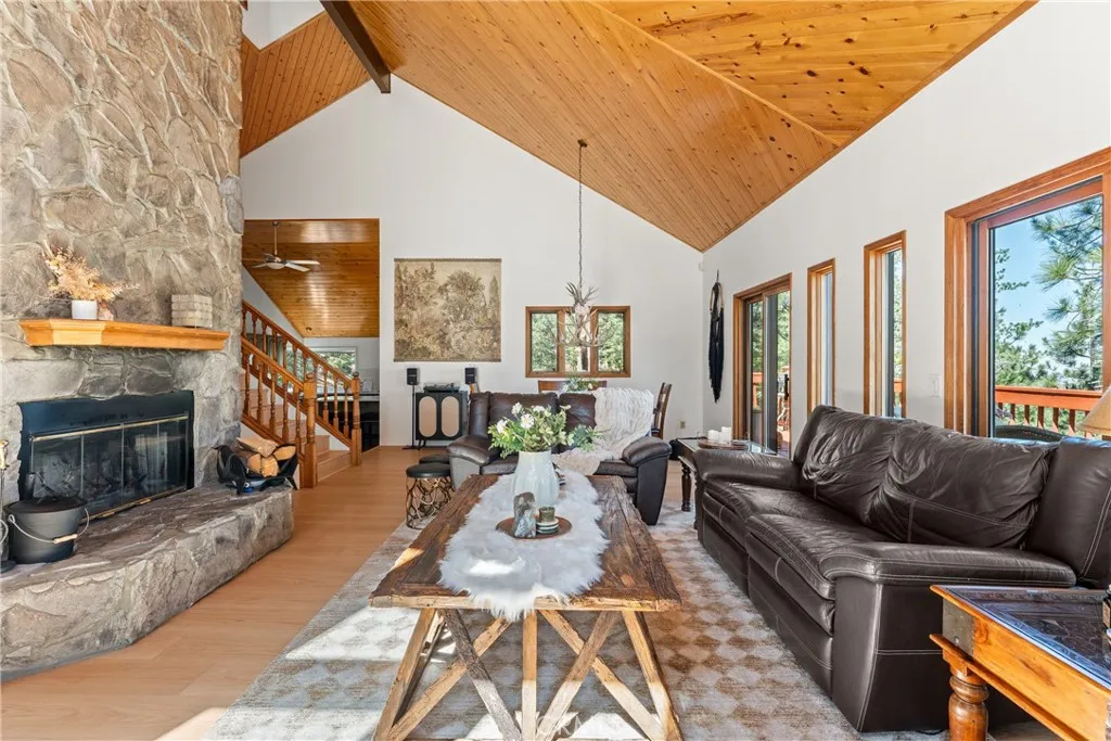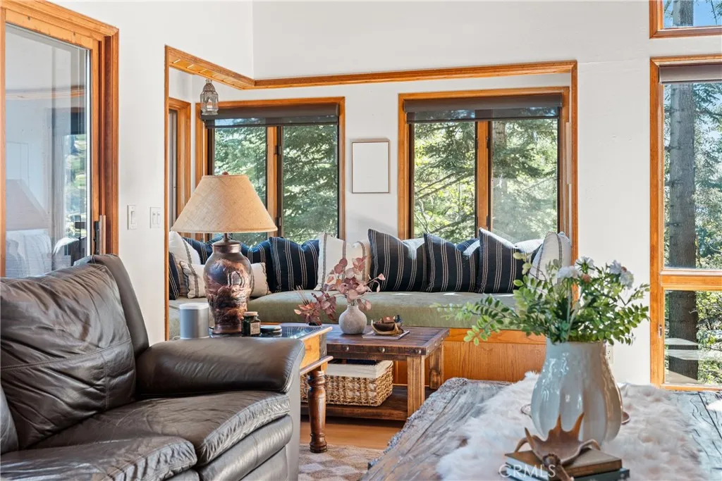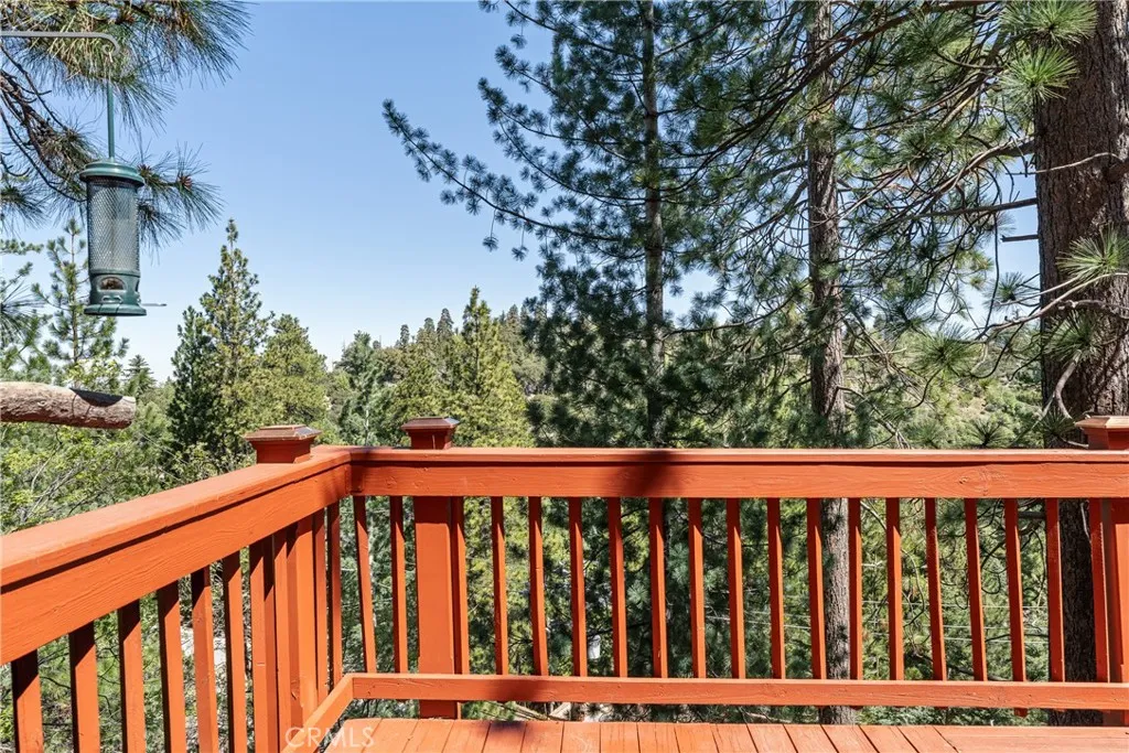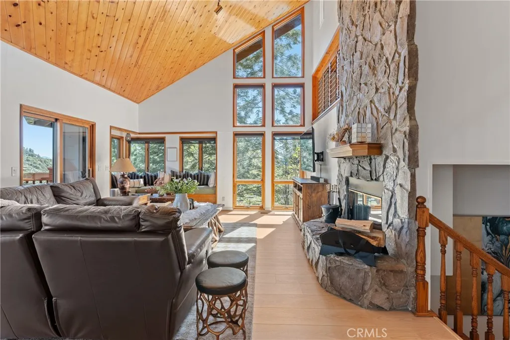 Lake Rights, level entry, and a rare private setting - this mountain retreat offers a unique sense of seclusion in Lake Arrowhead. Tucked away on a private road and surrounded by dramatic boulders and towering pines, this striking mountain home presents breathtaking ridge-line vistas. Thoughtfully designed to embrace its natural setting, the home features a unique, multi-level layout with soaring vaulted ceilings and an open-concept flow that invites both relaxation and connection. The entry level welcomes you with a charming foyer, a comfortable bedroom, and a bathroom - ideal for guests or easy main-level living. The heart of the home unfolds on the middle level, where a spacious living room is anchored by a wall of glass that brings the forest into your living room. A wood-burning fireplace adds warmth and ambiance, while a rare conversation nook creates the perfect space to gather and unwind. The light-filled kitchen has been tastefully updated and flows seamlessly into the dining area, with a nearby 3/4 bathroom to make every day hosting and living easy. Direct access to an expansive wrap-around deck offers a true “treehouse” experience with sweeping mountain views. The lower level provides two private bedroom suites, each with its own en-suite bathroom and access to a second deck, creating another peaceful retreat immersed in nature. Additional highlights include a whole-home automatic generator, air conditioning, fiber internet, updated flooring throughout, multiple parking areas, and dual access from both Fairway Dr or the private road. Located just minutes from the private golf course and a short drive to Lake Arrowhead Village. This property offers a unique opportunity to own a private mountain retreat where architecture and nature come together in perfect harmony.