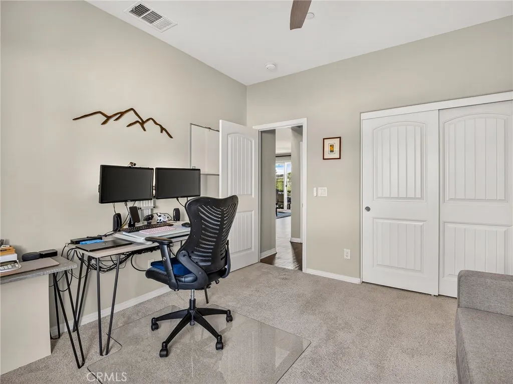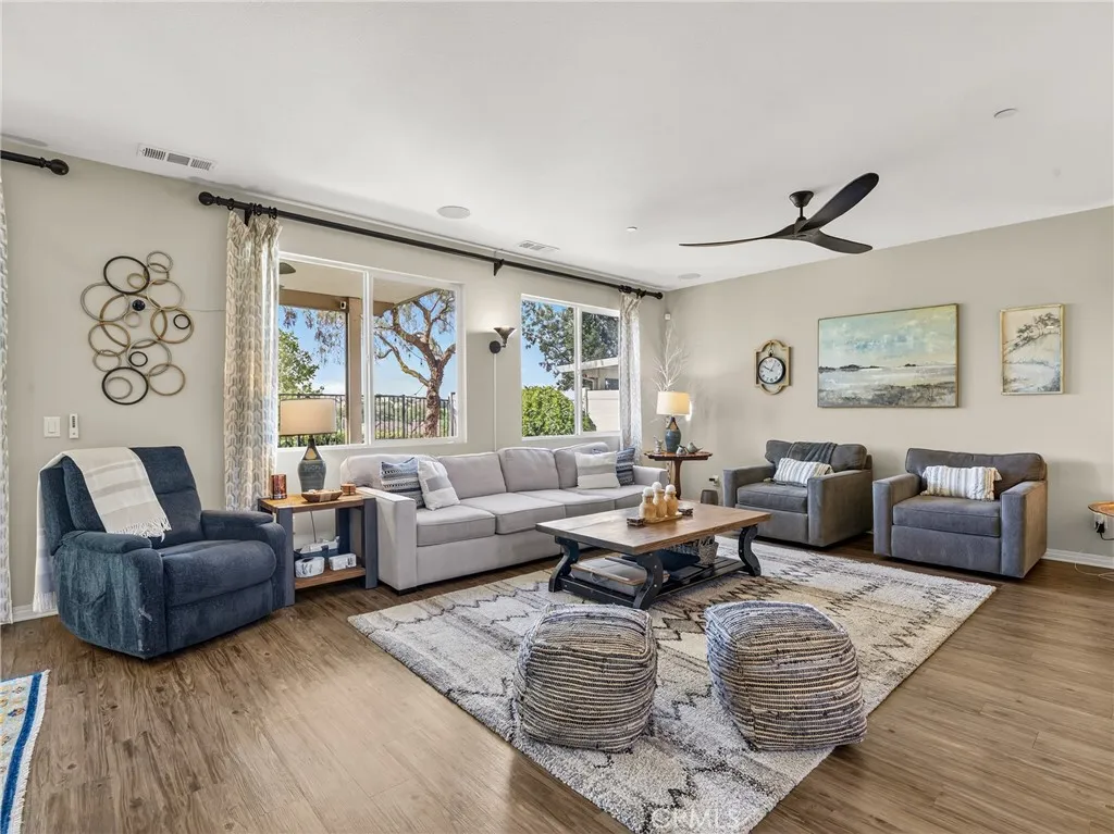Tucked into the established Fairway Canyon community in Beaumont, this stunning 5-bed, 3-bath Solar home offers expansive canyon views and is perfect for families searching for affordability, access to nature, and amenities for all ages. The open-plan main floor features 10' ceilings, a chef's kitchen with large island and walk-in pantry, and a flexible downstairs suite with Murphy bed that’s perfect for guests or remote work. The primary suite offers a beautiful new tiled shower with frameless entry and custom barn door. The remaining 2 bedrooms are a good size and the second bathroom has dual sinks, tub and shower. Step outside to a fully covered patio, included spa, and low-maintenance xeriscape yard, all overlooking rolling hills. Owned solar and a full smart home system are included. Low HOA fees cover high-speed internet, fitness center, resort-style pools, splash pad, and event space. The new Summerwind Trails TK–8 school, 20 miles of trails, and several parks are all within easy walking distance. The washer/dryer and fridge stay with the home.