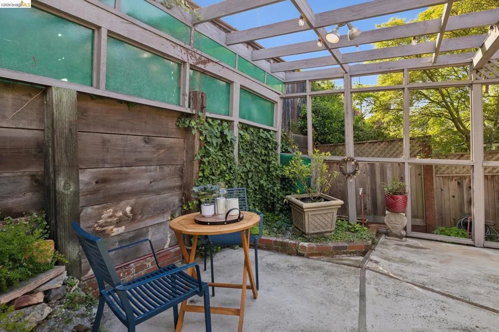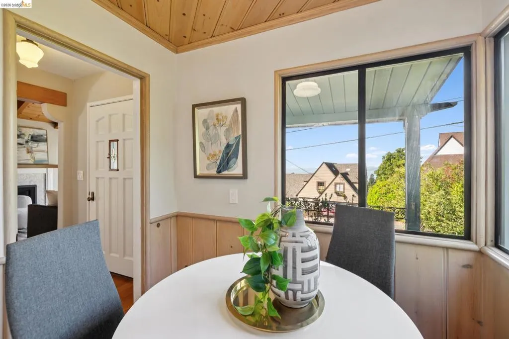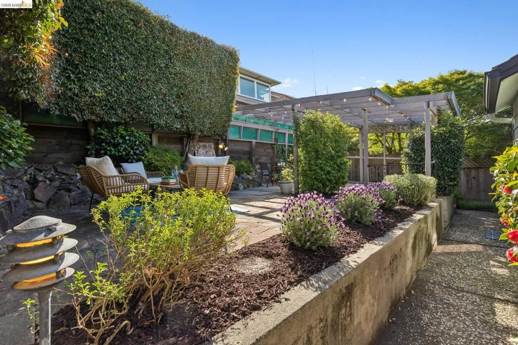 Step into storybook charm in this 2 bed, 2 bath Tudor Cottage, perfectly situated in one of Kensington’s most coveted neighborhoods—where tree-lined streets, Bay views, and a neighborhood village center meet everyday convenience. The sun-drenched living room features a beautiful vaulted, wood-beamed ceiling, built-in shelves, and a custom-designed fireplace hearth with gas insert, all framed by a stunning view of the Golden Gate Bridge. The updated kitchen has quartz counters yet maintains the home’s period character with a charming breakfast nook with built-ins and a lovely view of the SF Bay, perfect for morning coffee or evening sunsets. The primary bedroom has a luxurious ensuite bath added in 2016, showcasing a custom sink from Italy and elegant Moroccan-style marble tile, creating a boutique-hotel feel. The tranquil backyard has two patio areas, a pergola with lights, and thoughtful landscaping for relaxing and entertaining. Everyday comfort is enhanced by a spacious laundry room and a garage with ample storage, while the brickwork driveway adds timeless curb appeal. Located just one block from Kensington Elementary and moments from the shops and restaurants along Arlington, this home also offers easy access to Tilden Nature Area trails for hiking and outdoor recreation. The trailhead for Ye Olde School Trail, offering beautiful views of Wildcat Canyon, is just up the road. Come home to breathtaking views and the rejuvenating peace of Tilden Park nearby.