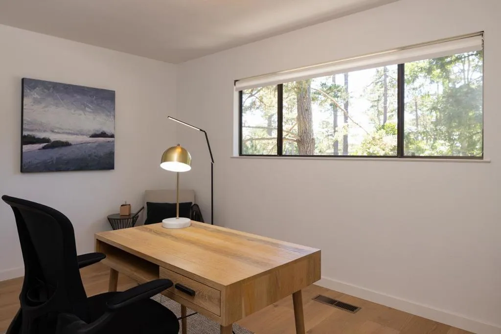 This beautifully updated single-level home feels warm and easy from the moment you arrive. Offering 3 bedrooms and 2.5 baths, the layout flows naturally with a formal living room, separate dining room, and a comfortable family room with wood-burning fireplace just off the kitchen, perfect for everyday living and gathering. The remodeled kitchen features quartz countertops, a Moroccan tile backsplash, new cabinetry, an island, and an induction stove, blending style with function. Wide plank oak hardwood floors run throughout, while natural light fills the home, creating a bright, inviting feel. The primary suite is a peaceful retreat with a remodeled bath, including a curbless shower, dual vanities, and quartz finishes. Additional baths have been tastefully updated. Set on a spacious 12,600 sq ft lot, the sunny backyard offers a paver patio, new fencing, and room to relax or entertain. An oversized 2-car garage (~550 sq ft) adds flexibility. Ideally located near Pebble Beach trails with ocean views, world-class golf, dining, and easy Hwy 1 access.