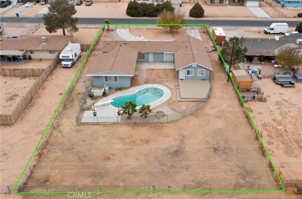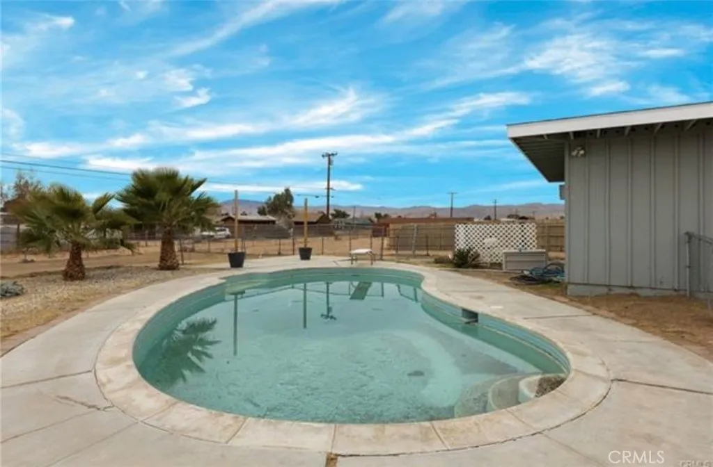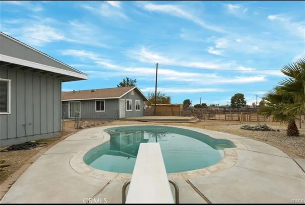 Welcome to this charming pool home in Apple Valley, situated on nearly half an acre of land. This property offers space, privacy, and a distinctive architectural character that is rarely found in the area. Step inside a warm and inviting living room featuring vaulted wood-beam ceilings, tongue-and-groove wood paneling, and a stunning floor-to-ceiling stone fireplace that creates a beautiful focal point for the home The open floor plan flows seamlessly into the dining area and kitchen, creating a comfortable layout for everyday living and entertaining. The kitchen offers ample cabinetry, modern appliances, and a breakfast bar overlooking the dining space, while large windows fill the home with natural light The spacious primary suite includes a private retreat area and built in closet storage, offering flexibility for a sitting room, home office, or additional living space Step outside to your own backyard oasis featuring an in-ground pool with a diving board, perfect for cooling off during warm High Desert days. The expansive lot provides plenty of room for RV parking, outdoor recreation, gardening, or future customization. Additional highlights include luxury vinyl plank flooring, updated bathrooms with granite countertops, a large outdoor deck, ceiling fans, and a two-car garage. Conveniently located near schools, shopping, and major roads, this home offers the perfect blend of comfort, character, and desert living.