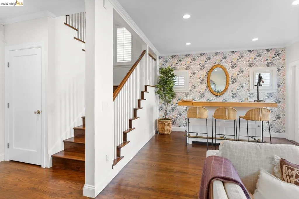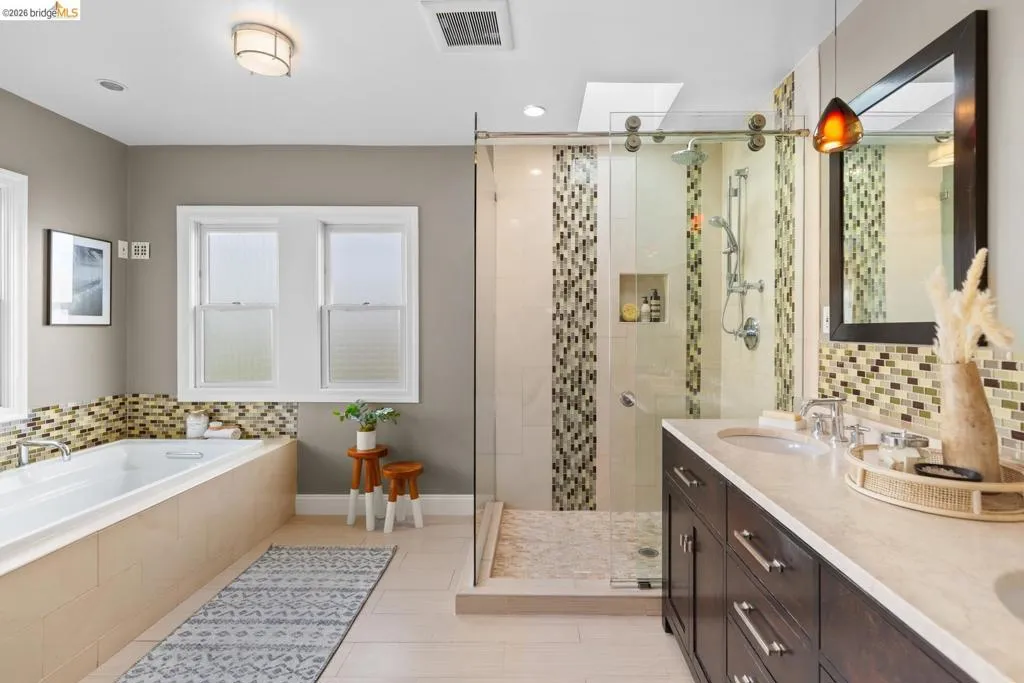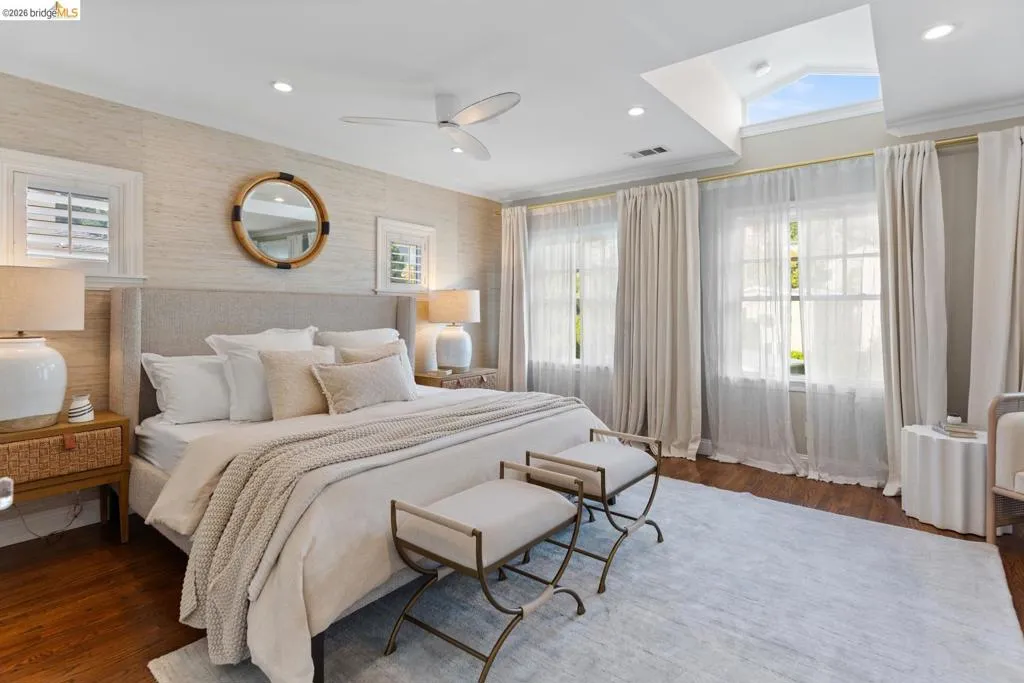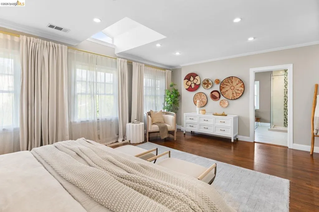 Elegant and extensively updated, this stunning and turn-key Rockridge home offers the perfect blend of luxury, comfort, and modern design. A seamless open floor plan connects the sophisticated living room with fireplace to a spacious dining area and a beautifully renovated chef’s kitchen featuring state-of-the-art appliances, stone countertops, custom cabinetry, vaulted ceilings with skylights, and an expansive island with breakfast bar. The main level includes two bright bedrooms, a stylish hall bath, and a serene primary suite overlooking the gardens, complete with a spa-inspired bath, soaking tub, separate shower, and generous walk-in closet. The lower level is designed for both relaxation and entertaining, with a large family room, built-in bar, and French doors opening to terraced decks and large level lawn areas for effortless indoor-outdoor living. An additional office or guest room, bedroom, and full bath provide flexibility for today’s lifestyle. Impeccably upgraded with new roof, electrical, plumbing, solar panels, EV charger, and outdoor heating and lighting. A garage and long driveway offer ample parking. Ideally located near Chabot Elementary, College Avenue shops, cafés, and easy commuter access - this is refined Rockridge living at its best.