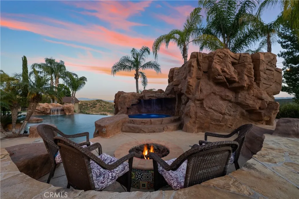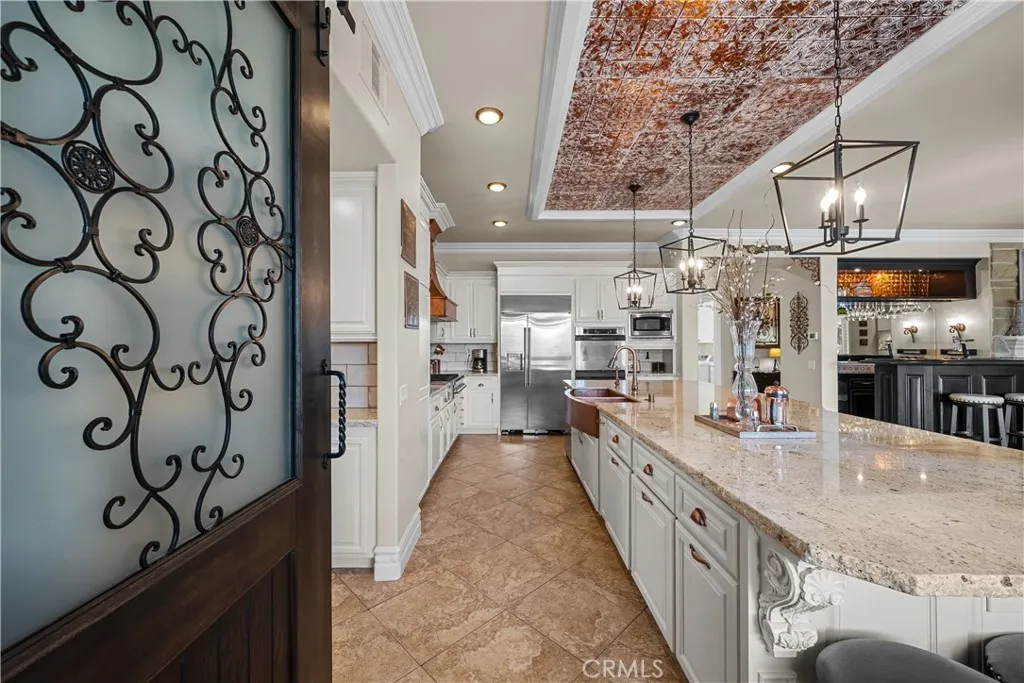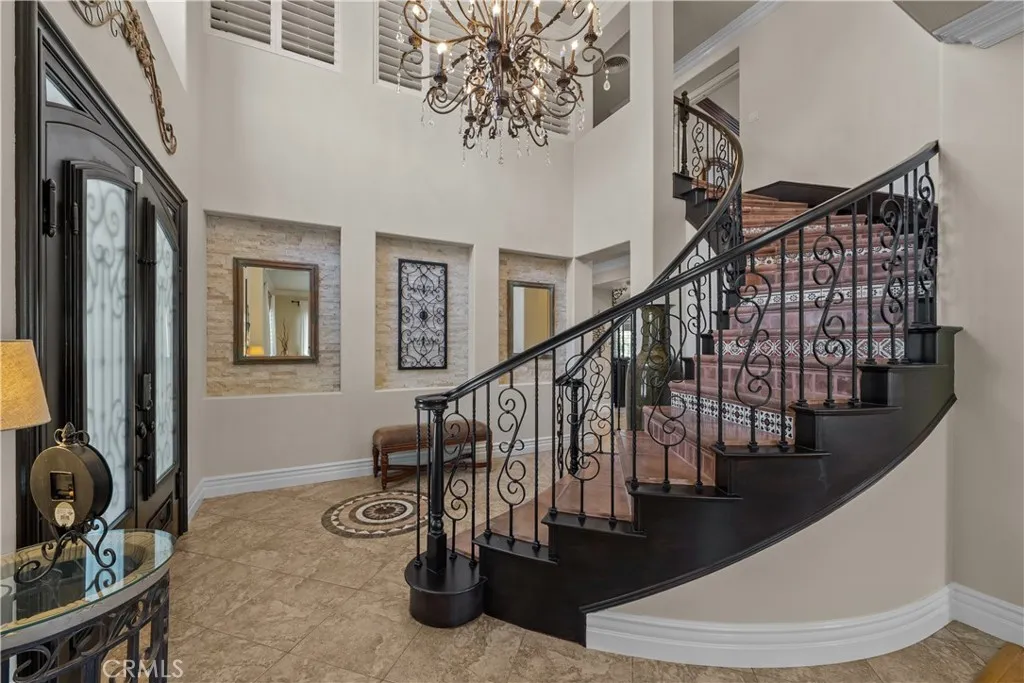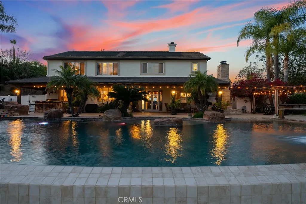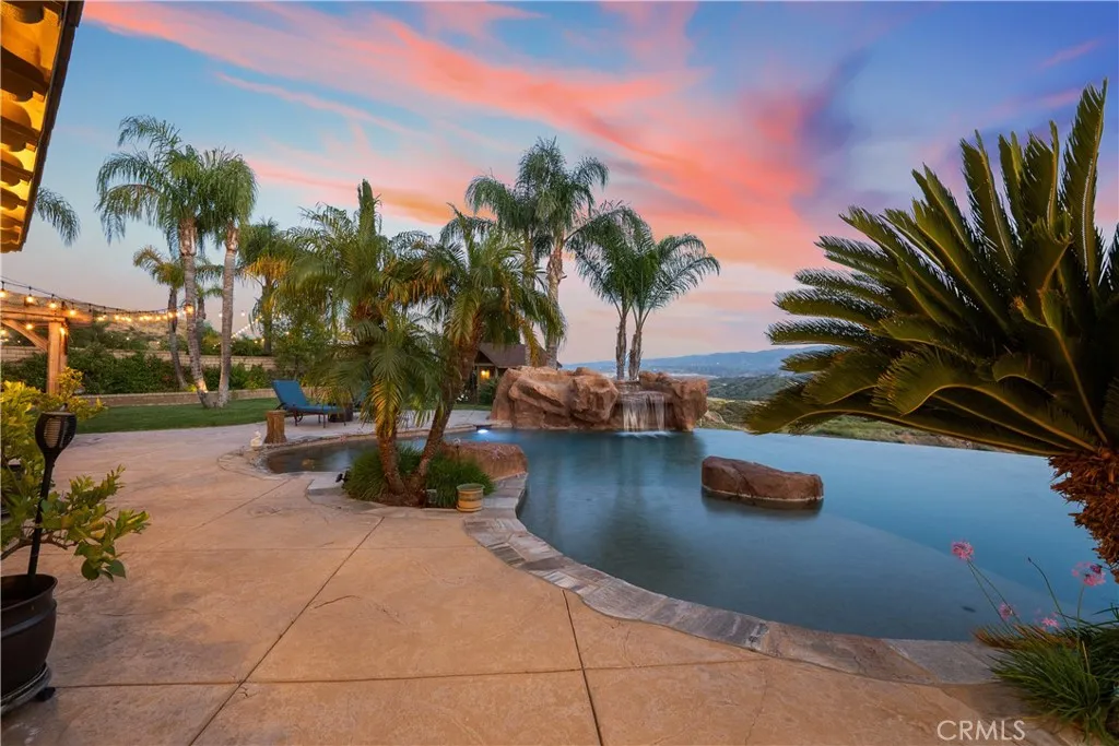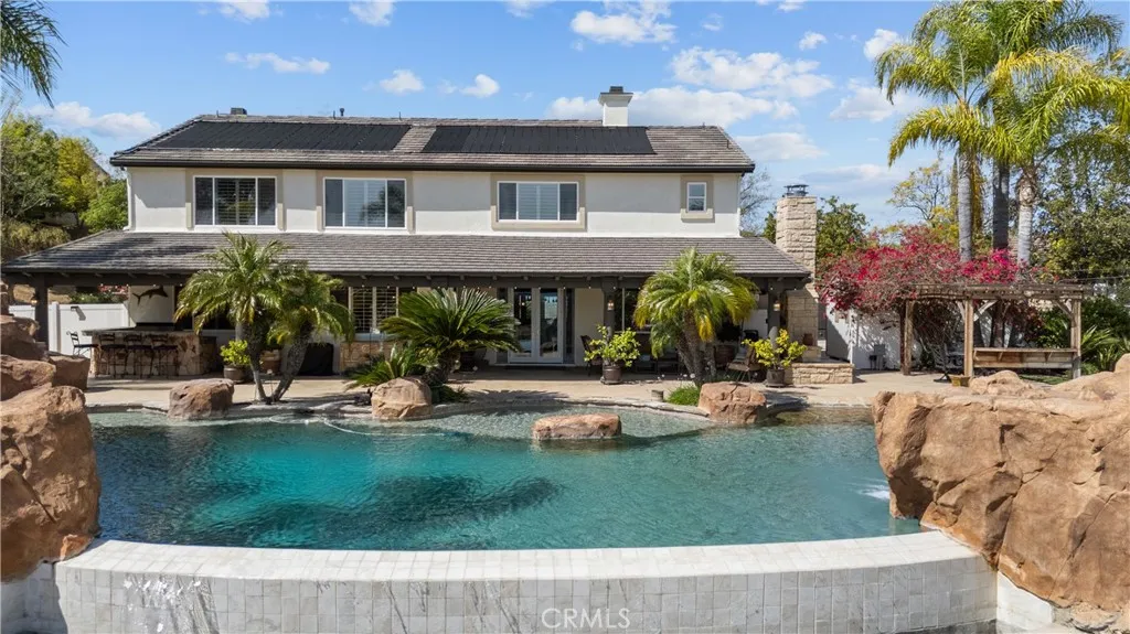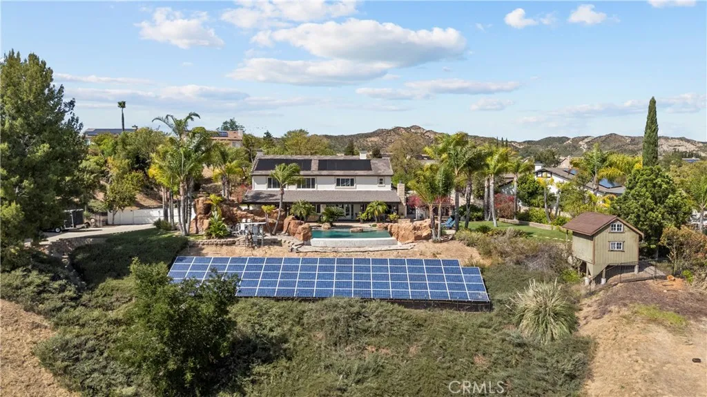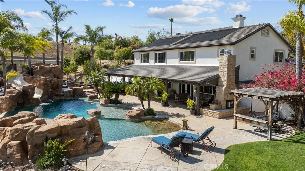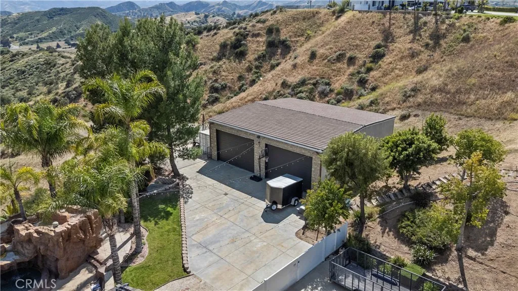A rare offering within the exclusive Wild Horse Track—where privacy, scale, and design converge, and opportunities are few and far between. Set across more than three acres, this estate is a masterclass in intentional living. From the moment you arrive, custom iron doors, an intricate mosaic entry, and a glowing chandelier create a memorable first impression. Inside, every detail has been curated. A dramatic Spanish-tiled staircase, rich wood flooring, plantation shutters, and extensive crown molding create a timeless blend of warmth and sophistication. At the heart of the home, a one-of-a-kind chef’s kitchen becomes both a showpiece and gathering place—featuring a copper inlaid ceiling, artisan copper hood, pendant lighting, farmhouse sink, granite surfaces, and an expansive island. The space flows effortlessly into a refined family room with a custom entertainment center, ambient lighting, fireplace, and reading nook. The layout balances function and flexibility. The original main-floor bedroom has been converted into a private office adjacent to a full bath, offering versatility for guests or future bedroom use. Upstairs, the loft has a closet added and is currently being used as an additional bedroom. The primary suite serves as a private retreat with sweeping mountain and city light views, dual walk-in closets, and a spa-inspired bath. An additional en-suite bedroom adds comfort and convenience. Outdoors, the experience transforms into a private resort. A saltwater Pebble Tec infinity pool with beach entry, waterfalls, rock slide, grotto spa, and sauna creates a setting that rivals luxury destinations. Entertaining is effortless with a covered outdoor living area, built-in BBQ bar, fireplace, and expansive seating positioned to capture breathtaking views. The fully permitted 2,500 sq. ft. RV garage with upper-level storage is complemented by a 4-car garage and generous additional parking. The grounds also include a lofted playhouse and utility structures. Enhanced with paid solar, pool solar, and whole-house WhisperFlow fans, the home delivers luxury and efficiency. No HOA. Close to freeway access, Castaic Lake, and top local schools—yet a world apart.