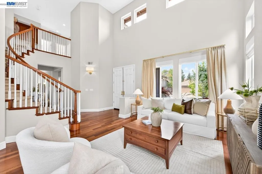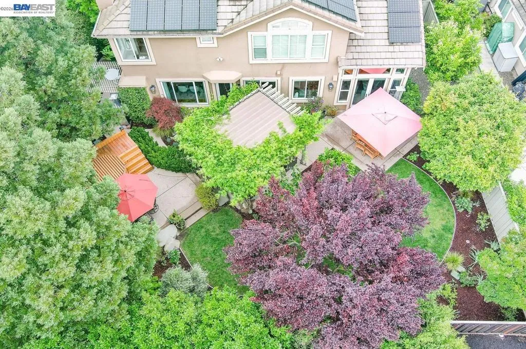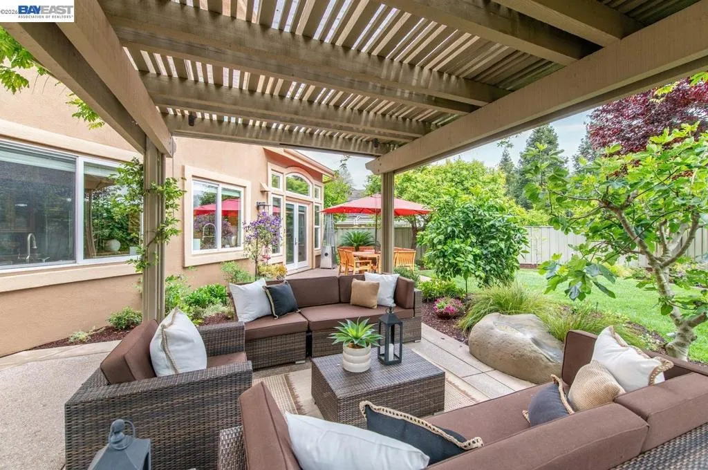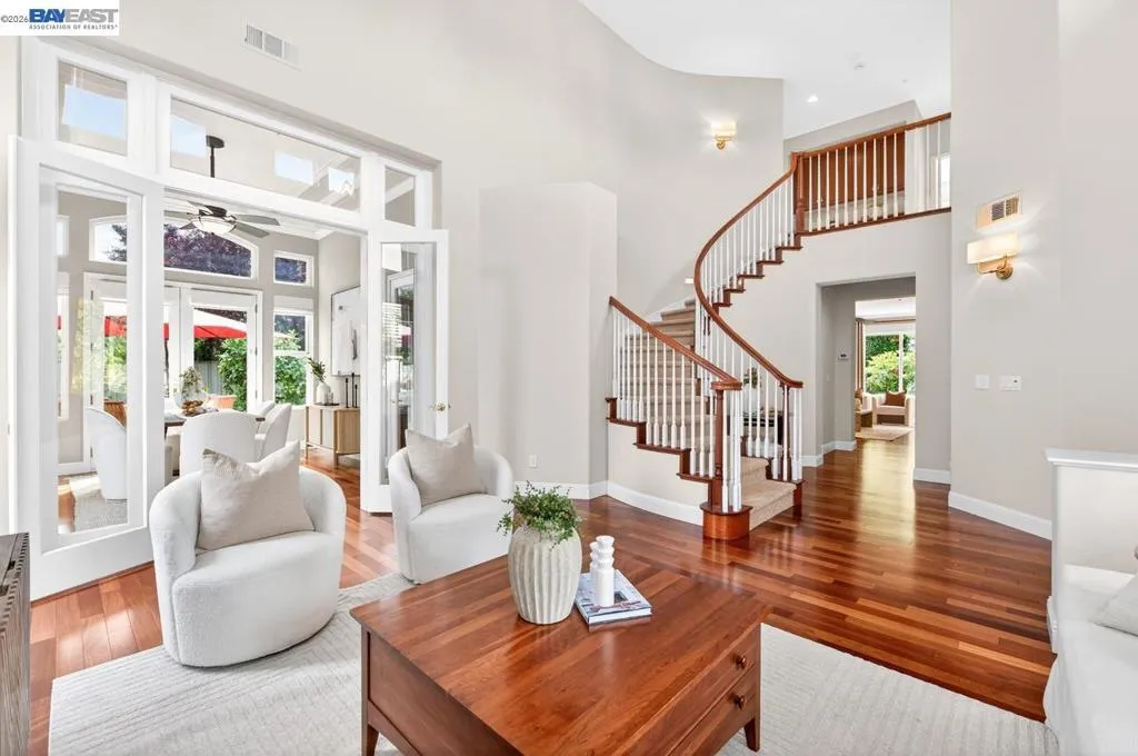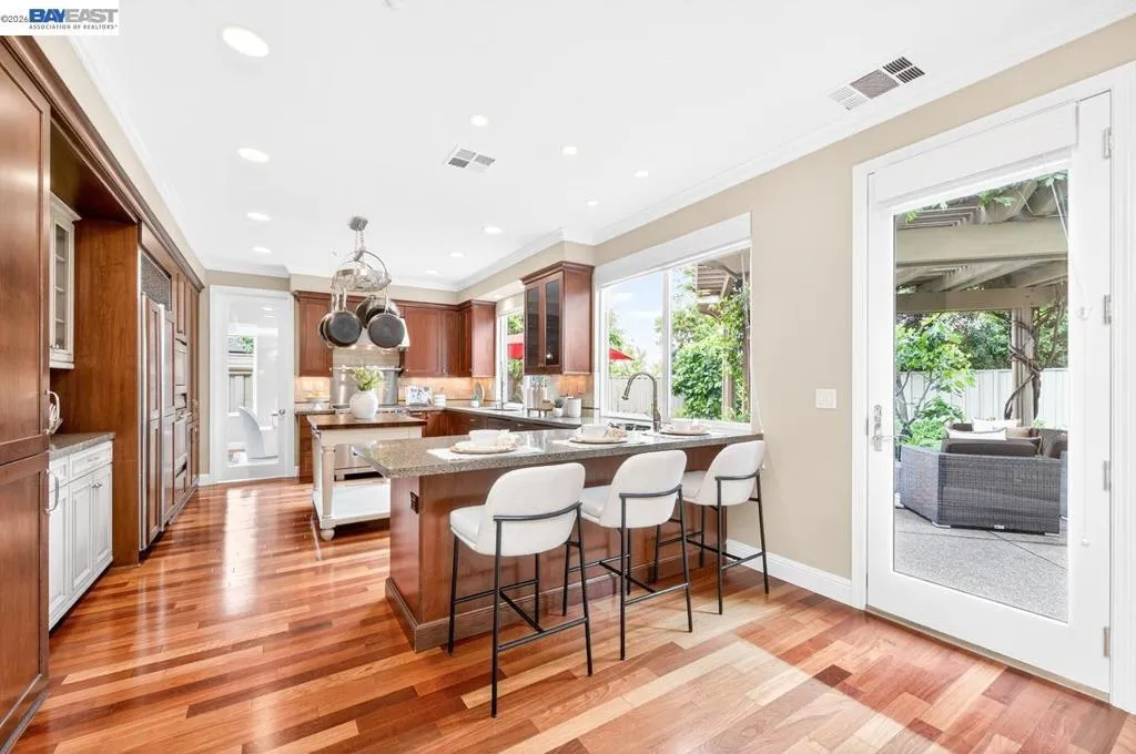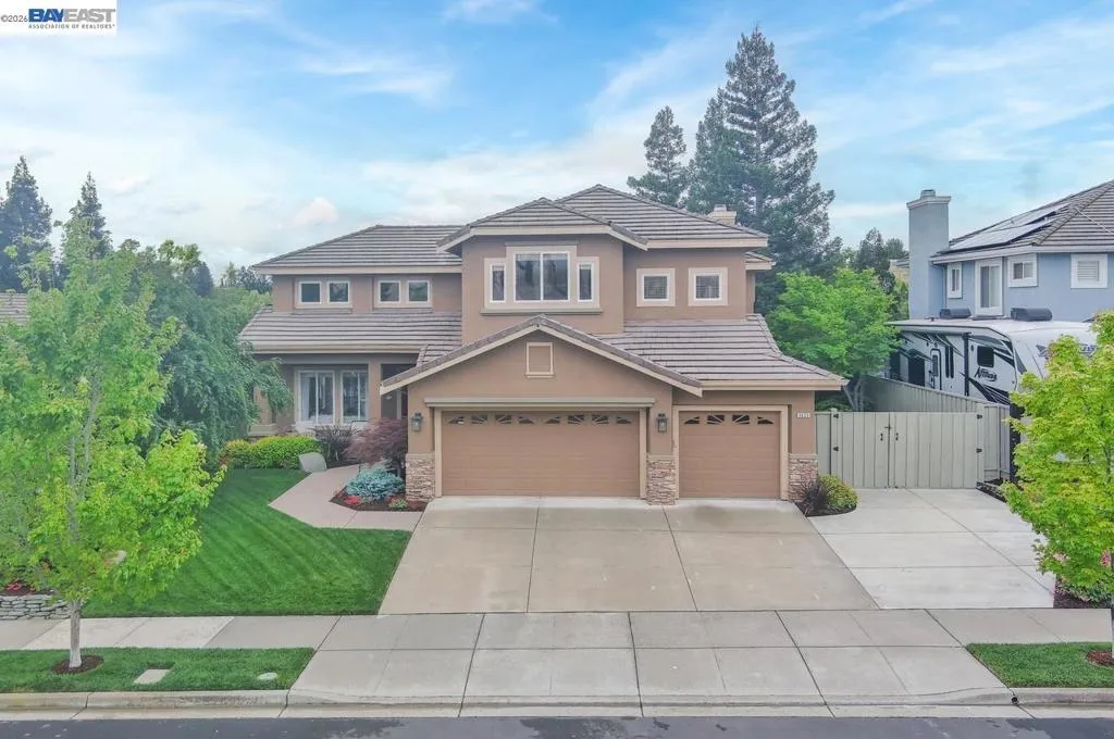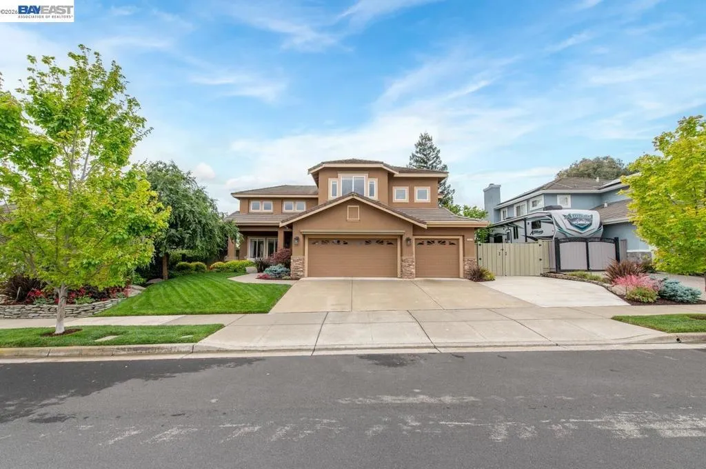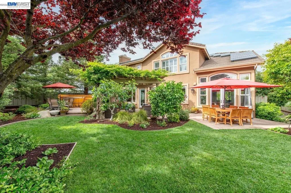Experience luxury living! Stunning Livermore home featuring 4 bedrooms, bonus 5th-bed/loft/media room, 3.5 baths, and additional main level en-suite with bath. From front to back customized landscaping to modern Wolf and Sub-Zero kitchen appliances, you will love it all! Soaring ceilings, abundant natural light, and rich Brazilian cherry floors create a warm, bright and inviting atmosphere throughout. A grand carpeted staircase with elegant cherry wood spindles makes a striking first impression upon entry. The formal dining room showcases a beautiful coffered ceiling and French doors that open seamlessly to the backyard, perfect for indoor-outdoor entertaining. The chef’s kitchen is thoughtfully designed with Hallmark and Brookhaven cabinets, dual ovens, stone countertops, and beautiful butcher block island. Highlighting a new designer-inspired main bedroom bath retreat- a spa-like stone shower with dual heads and double vanity & custom lighting. The backyard is an entertainer’s dream with tranquil fountain, covered seating, raised cedar hot tub, and a convenient side yard access and 30-amp breaker and sewer dump. Fruit trees include lemon, grapefruit, and fig! Water efficient irrigation! Custom landscaping LED lighting with Kichler fixtures -Wi-Fi controlled! Hunter Douglas Shades and custom drapes! Overhead garage storage, workbench and cabinets included! Complete with a 3-car garage. Solar for energy efficiency! SunPower Solar 6.2 KWh-owned system.