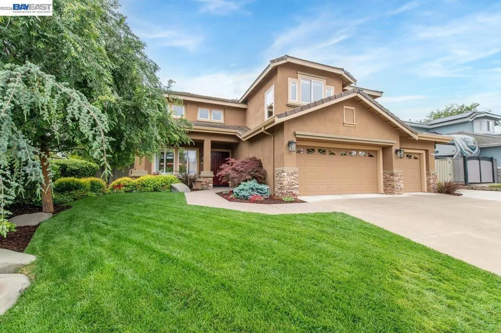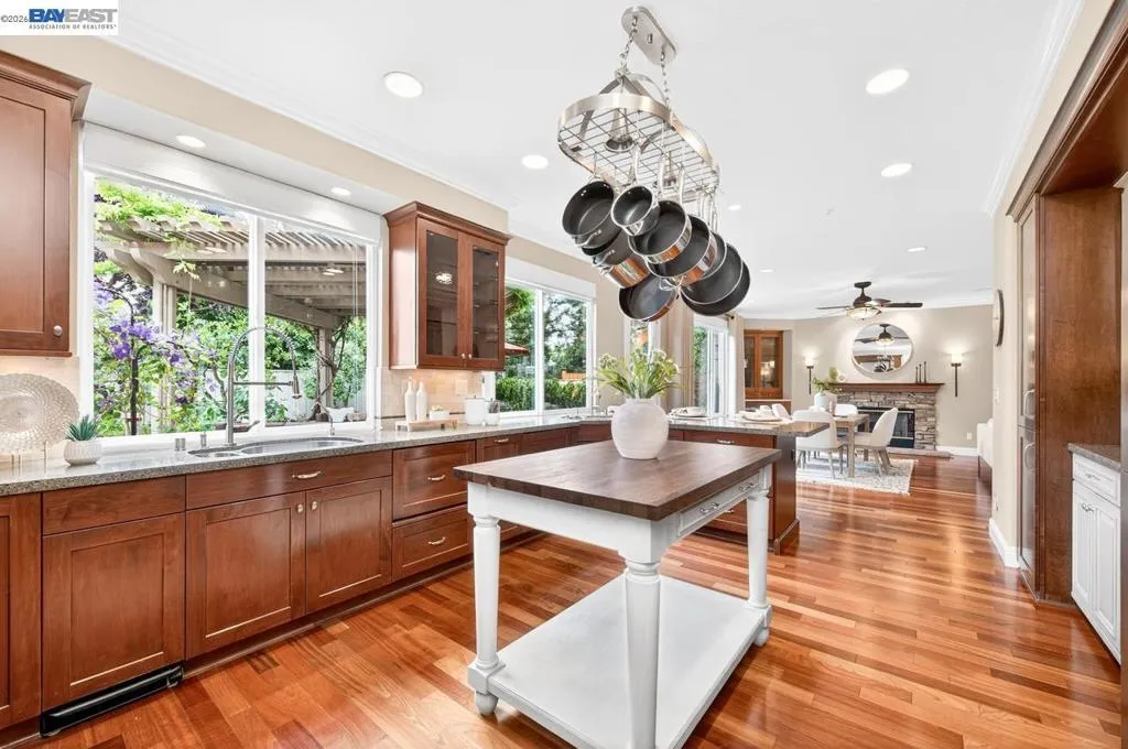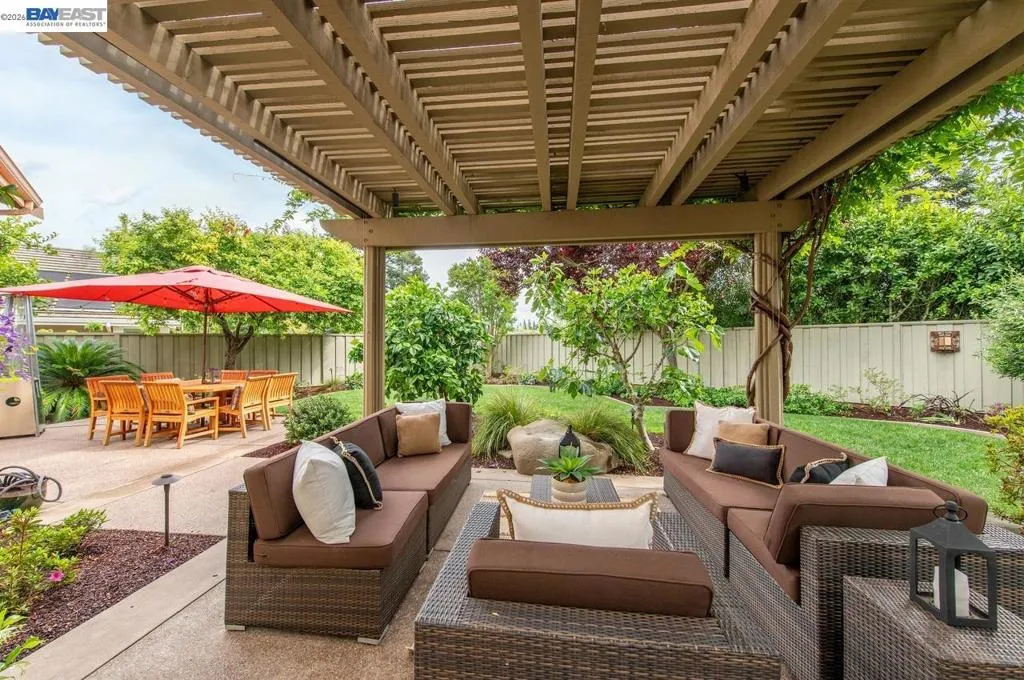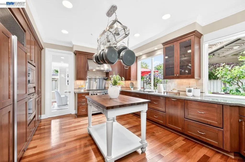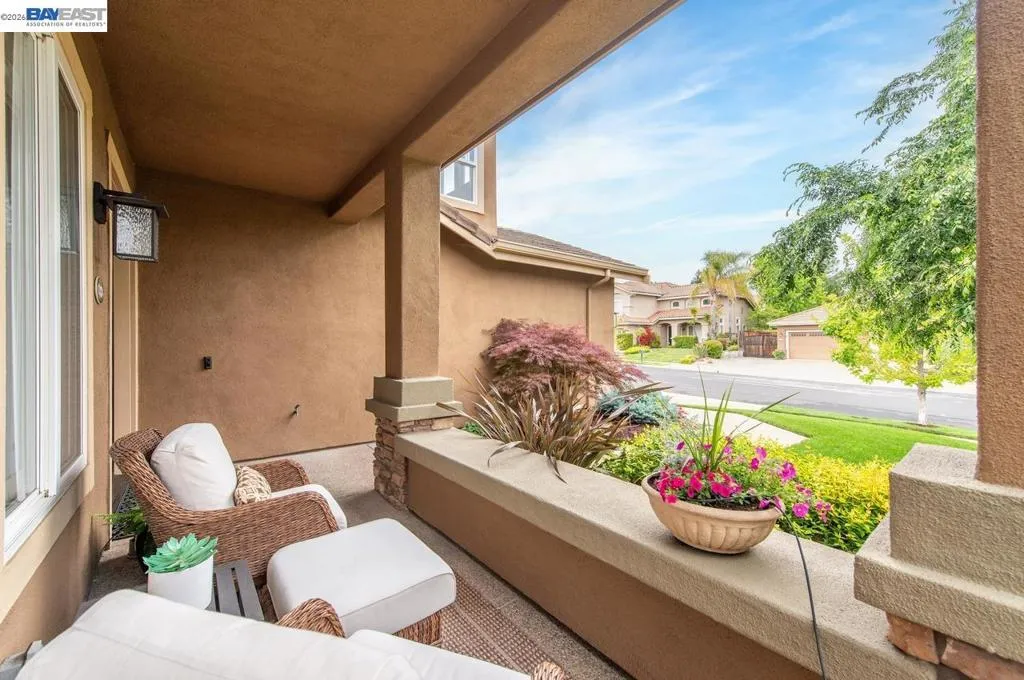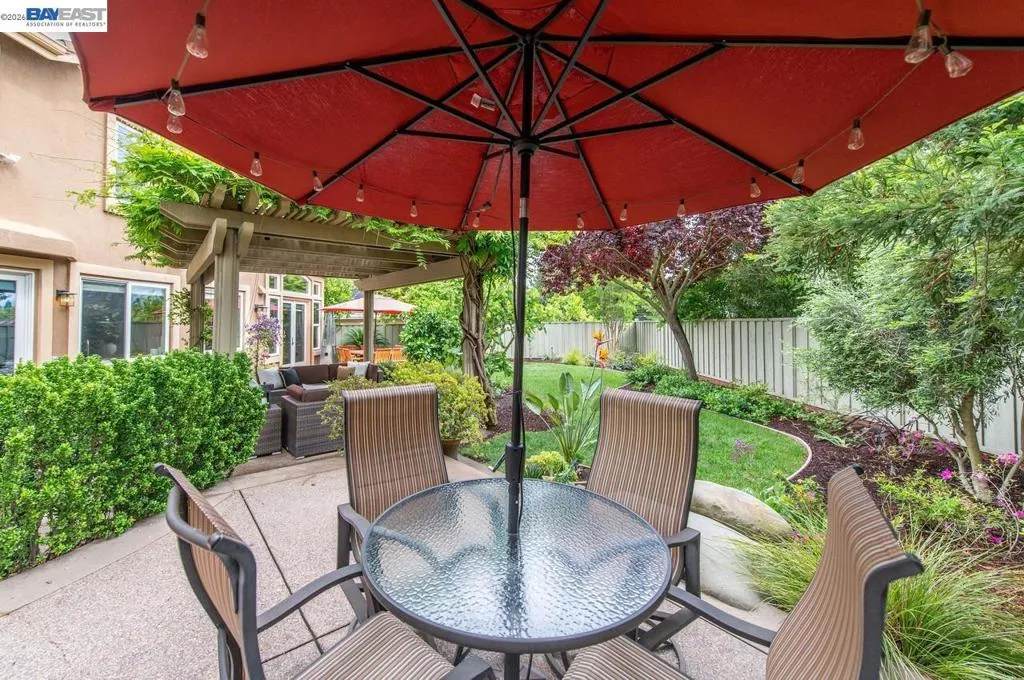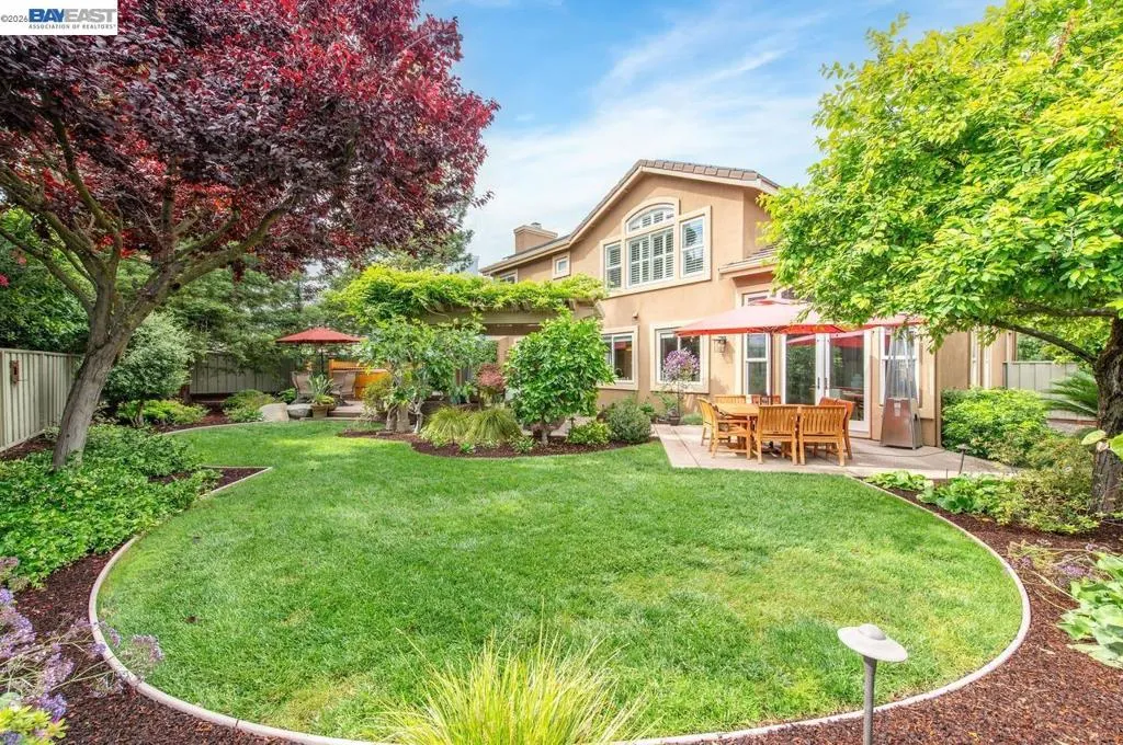Experience luxury living! Stunning Livermore home featuring 4 bedrooms, bonus 5th-bed/loft/media room, 3.5 baths, and additional main level en-suite with bath. From front to back customized landscaping to modern Wolf and Sub-Zero kitchen appliances, you will love it all! Soaring ceilings, abundant natural light, and rich Brazilian cherry floors create a warm, bright and inviting atmosphere throughout. A grand carpeted staircase with elegant cherry wood spindles makes a striking first impression upon entry. The formal dining room showcases a beautiful coffered ceiling and French doors that open seamlessly to the backyard, perfect for indoor-outdoor entertaining. The chef’s kitchen is thoughtfully designed with Hallmark and Brookhaven cabinets, dual ovens, stone countertops, and beautiful butcher block island. Highlighting a new designer-inspired main bedroom bath retreat- a spa-like stone shower with dual heads and double vanity & custom lighting. The backyard is an entertainer’s dream with tranquil fountain, covered seating, raised cedar hot tub, and a convenient side yard access and 30-amp breaker and sewer dump. Fruit trees include lemon, grapefruit, and fig! Water efficient irrigation! Custom landscaping LED lighting with Kichler fixtures -Wi-Fi controlled! Hunter Douglas Shades and custom drapes! Overhead garage storage, workbench and cabinets included! Complete with a 3-car garage. Solar for energy efficiency! SunPower Solar 6.2 KWh-owned system.