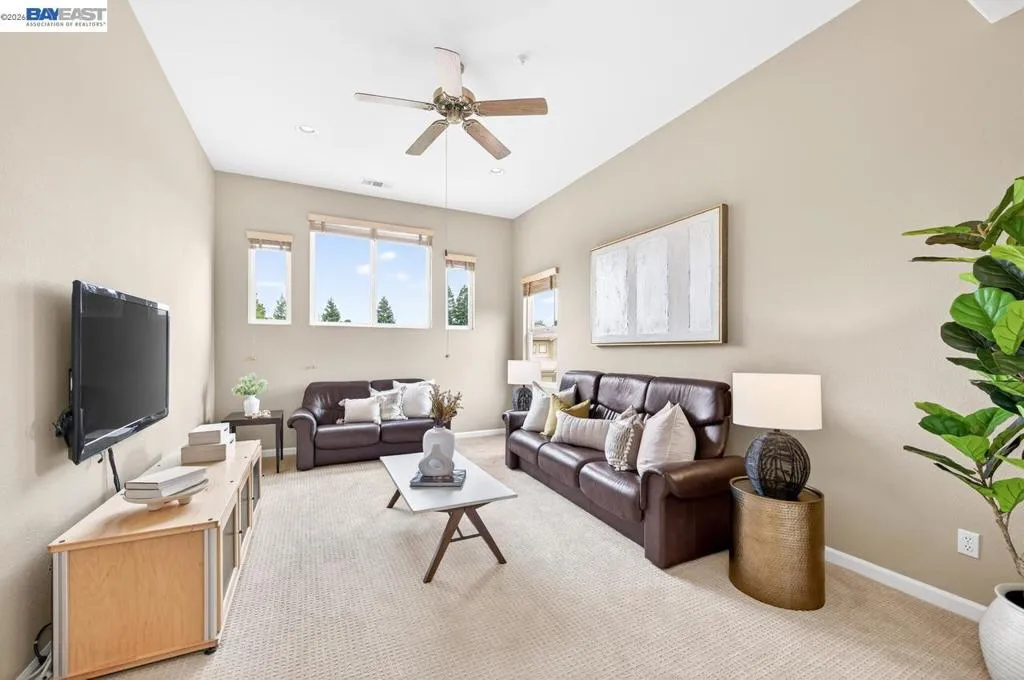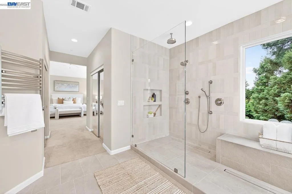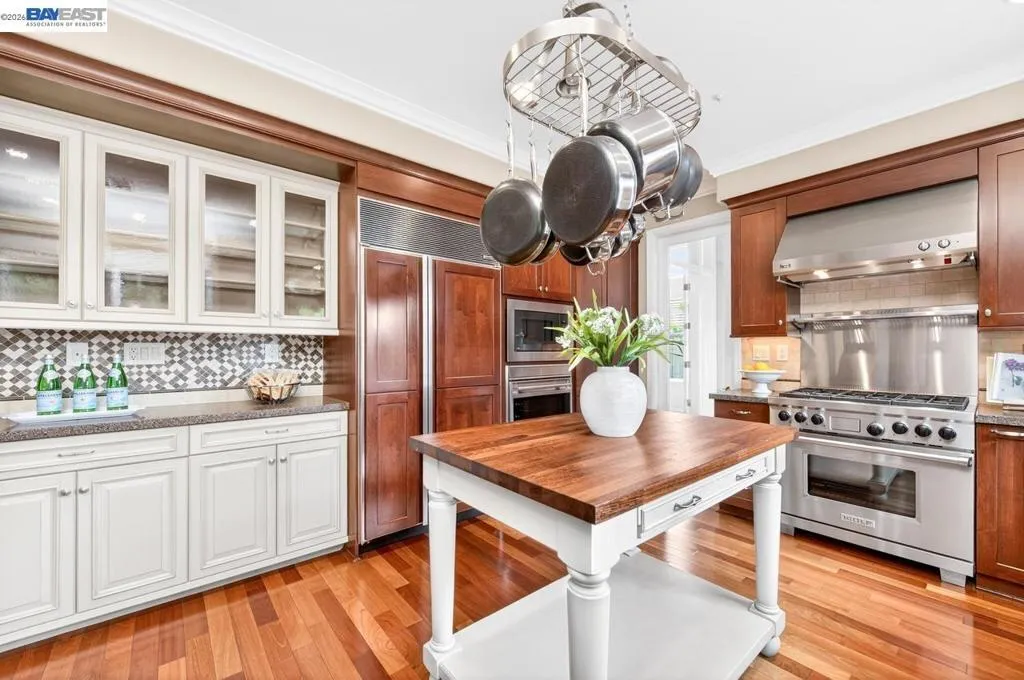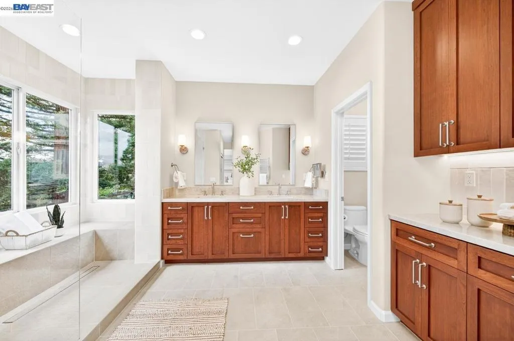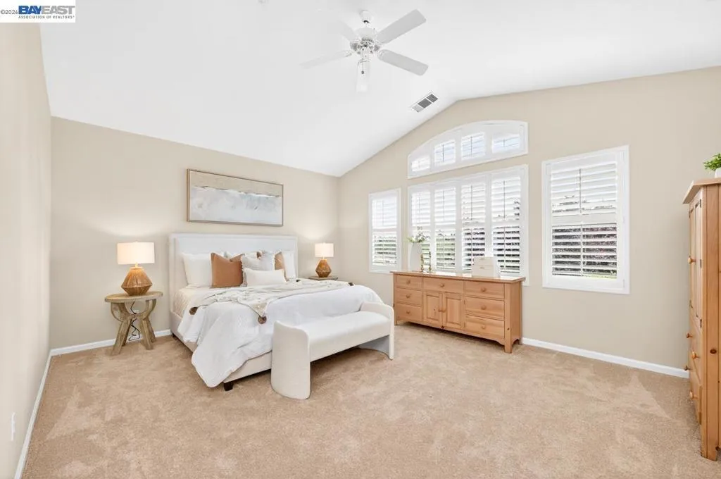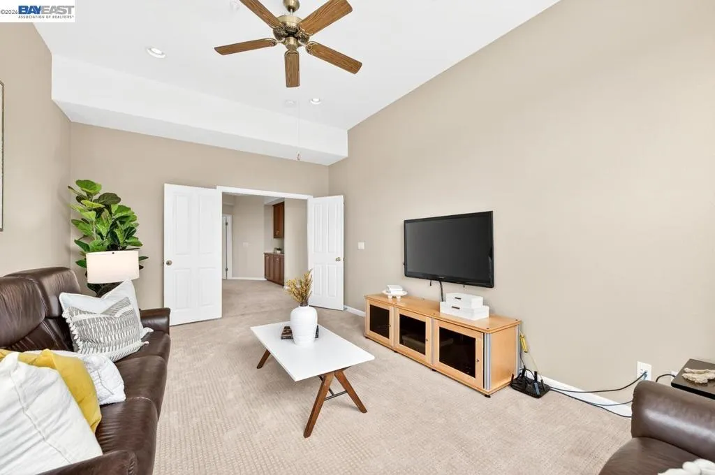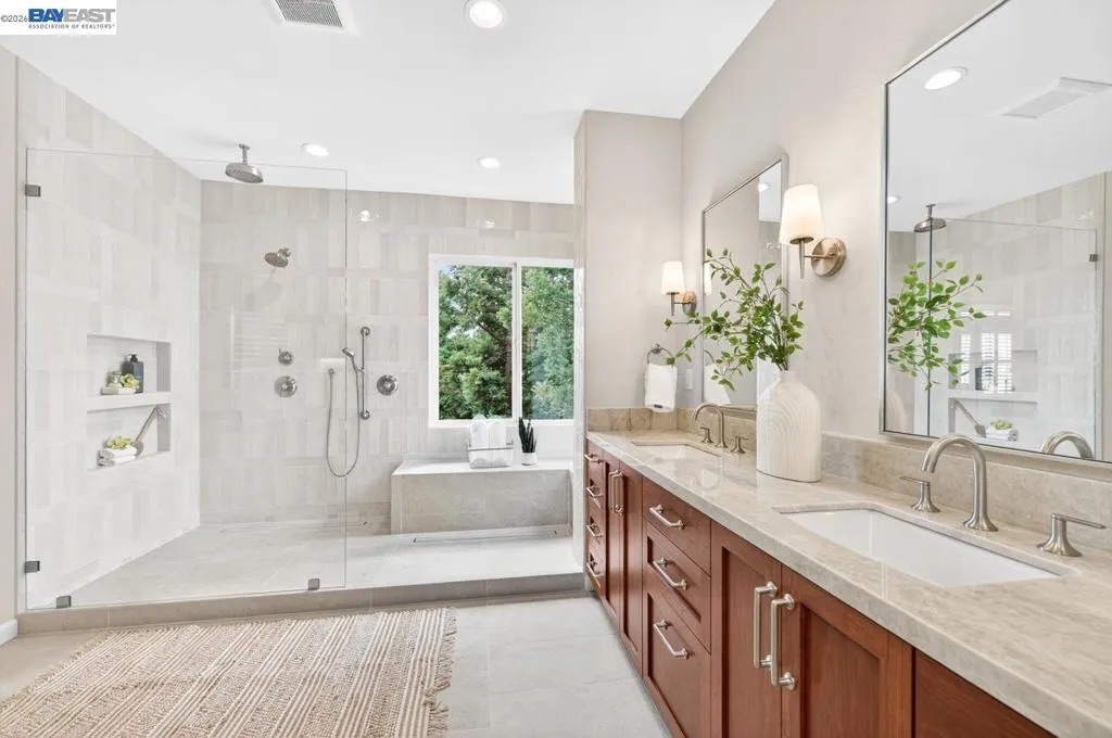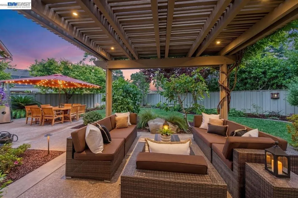 Experience luxury living! Stunning Livermore home featuring 4 bedrooms, bonus 5th-bed/loft/media room, 3.5 baths, and additional main level en-suite with bath. From front to back customized landscaping to modern Wolf and Sub-Zero kitchen appliances, you will love it all! Soaring ceilings, abundant natural light, and rich Brazilian cherry floors create a warm, bright and inviting atmosphere throughout. A grand carpeted staircase with elegant cherry wood spindles makes a striking first impression upon entry. The formal dining room showcases a beautiful coffered ceiling and French doors that open seamlessly to the backyard, perfect for indoor-outdoor entertaining. The chef’s kitchen is thoughtfully designed with Hallmark and Brookhaven cabinets, dual ovens, stone countertops, and beautiful butcher block island. Highlighting a new designer-inspired main bedroom bath retreat- a spa-like stone shower with dual heads and double vanity & custom lighting. The backyard is an entertainer’s dream with tranquil fountain, covered seating, raised cedar hot tub, and a convenient side yard access and 30-amp breaker and sewer dump. Fruit trees include lemon, grapefruit, and fig! Water efficient irrigation! Custom landscaping LED lighting with Kichler fixtures -Wi-Fi controlled! Hunter Douglas Shades and custom drapes! Overhead garage storage, workbench and cabinets included! Complete with a 3-car garage. Solar for energy efficiency! SunPower Solar 6.2 KWh-owned system.