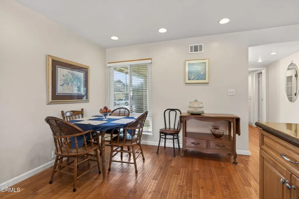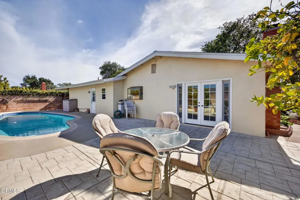 Welcome to this sunny East Ventura single-story pool home offering 4 bedrooms, 2.5 baths, and 1,577 sq. ft. of comfortable living space on a spacious, level lot. This home is special and has been loved and well taken care of for many years. The remodeled kitchen combines modern style with practical functionality. Granite countertops provide a sleek and durable workspace, while recessed lighting and a bay window brightens the room and highlights every detail. The warm wood laminate flooring complements the abundant wooden cabinetry, offering plenty of storage for all your culinary essentials. A spacious kitchen island serves as both a prep area and a casual gathering spot, and the charming breakfast nook is perfect for enjoying morning coffee or family meals. This inviting kitchen is designed for both everyday comfort and effortless entertaining. The natural light-filled living room features a raised-hearth stone fireplace and French doors framing a view of backyard. The attached two car garage is very spacious and will certainly satisfy. The dedicated 1/2 bath is perfect for direct entry from the swimming pool. The backyard is perfect for entertaining, with stamped concrete patios, deep blue, in ground pool, mature landscaping, fruit trees and plenty of room to enjoy the outdoors. The private primary bedroom includes mirrored closet door, a dedicated shower, toilet and sink. The dual-pane windows throughout the home provide plenty of natural sunlight, energy efficiency and quiet comfort. The large and wide driveway may be used for R.V parking or to park additional cars. This fine home blends indoor comfort with outdoor living, making it a true Ventura gem. In close proximity to parks, schools, transportation, shopping and highways. Just a short drive to Ventura Beaches, Downtown or a short commute to Santa Barbara or Los Angeles.