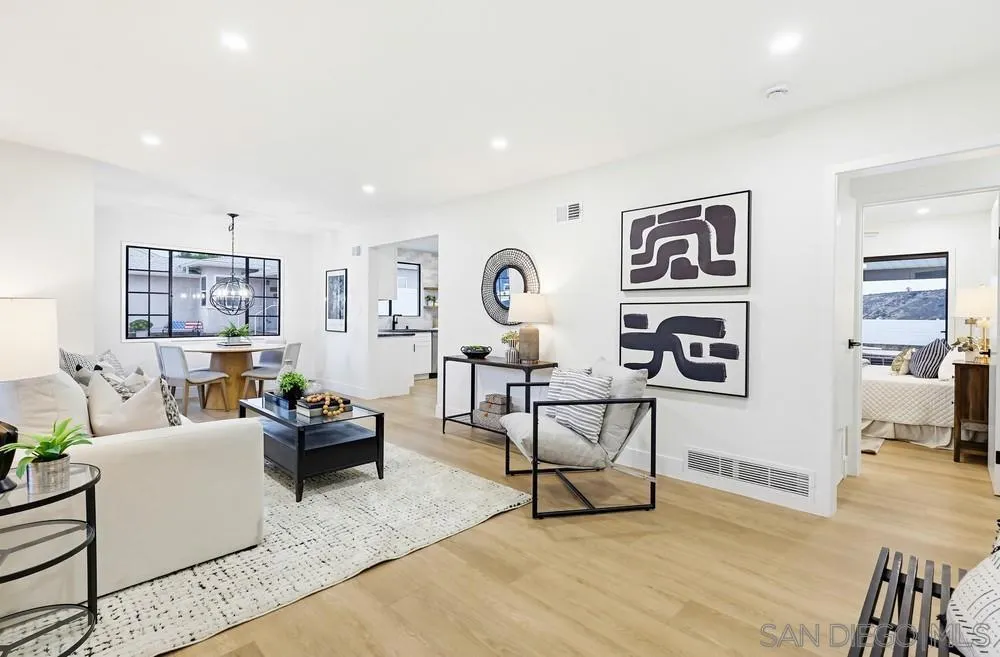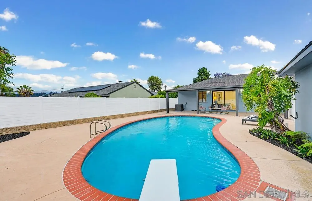 Turnkey and thoughtfully remodeled, this single-level Allied Gardens residence is centered around its standout feature, a spacious private sparkling pool that defines the home’s indoor-outdoor lifestyle and creates the ultimate setting for entertaining or relaxing year-round. A cozy front porch with seating adds a warm and inviting first impression,perfect for morning coffee. Inside, your home is filled with natural light and anchored by a stylish kitchen featuring white shaker cabinetry, sleek countertops, stainless steel appliances, and a classic subway tile backsplash. The living and dining areas connect seamlessly, creating an easy flow for everyday living. Bedrooms are well-proportioned, including a primary suite with direct access to the backyard, offering seamless connection to the pool and patio. Both bathrooms have been updated with modern finishes, including custom vanities, matte black fixtures, and designer tile work. The backyard is designed for enjoyment, featuring an expansive patio, covered outdoor living space, and a large, private pool that serves as the focal point of the home. The fully fenced yard enhances privacy and usability. A detached 2-car garage and extended driveway provide ample parking and potential for ADU conversion. Ideally located near Admiral Baker Golf Course and Allied Gardens Park and Recreation Center, and just minutes to Mission Valley and Fashion Valley Mall, this home has it all.