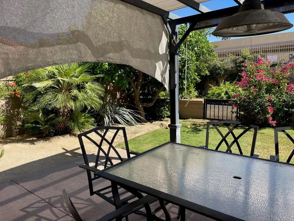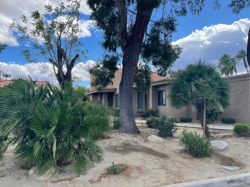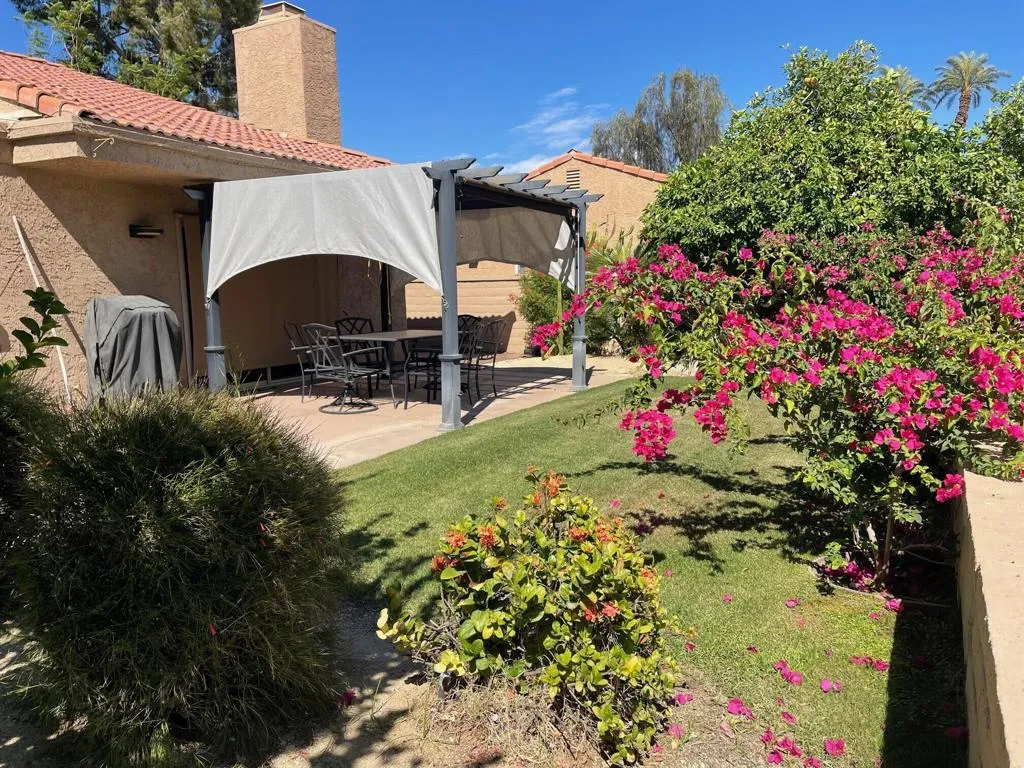 Light and bright with great views and privacy. Front yard is maintenance-free desert landscaping with huge pine trees while the south facing rear yard is beautifully landscaped with green lawn and colorful bougainvillea. Kitchen and baths were remodeled several years ago. Dual pane windows and sun shades make the home so comfortable whether you're looking for lots of desert sunshine or the peace and quiet of a shady bit of paradise. Atrium was opened up to the third bedroom making a lovely office or den area