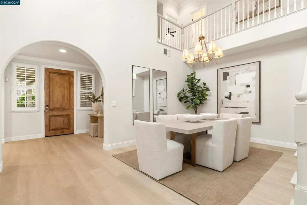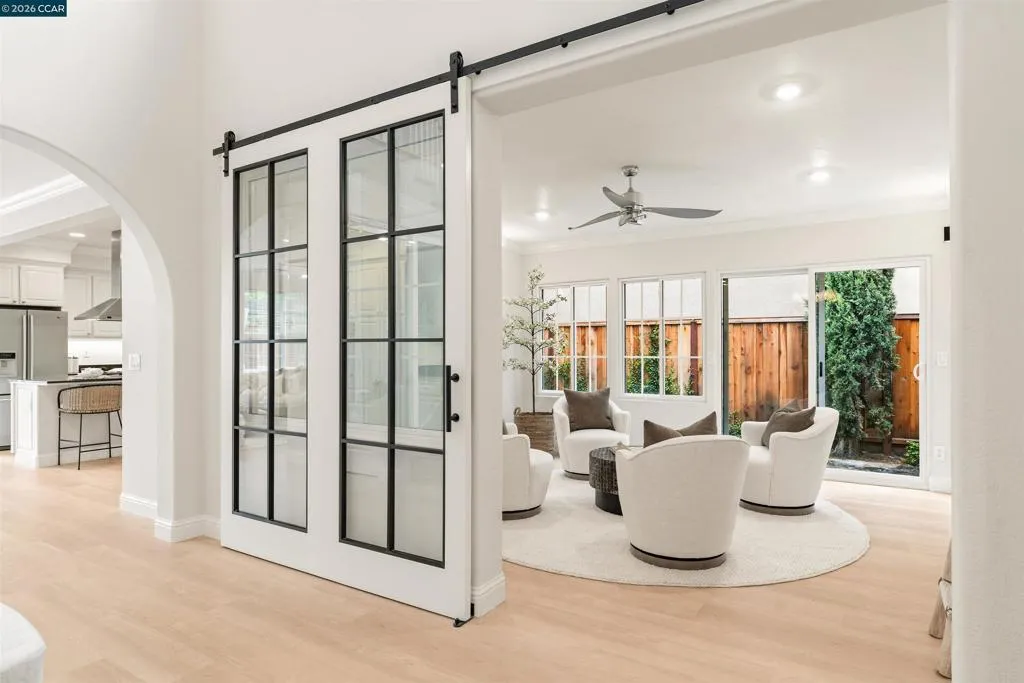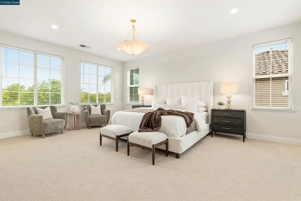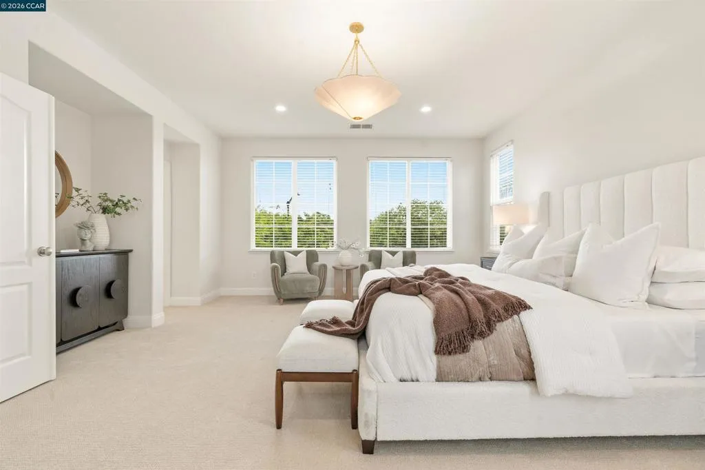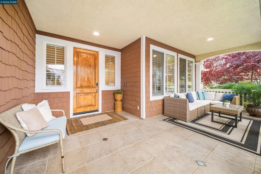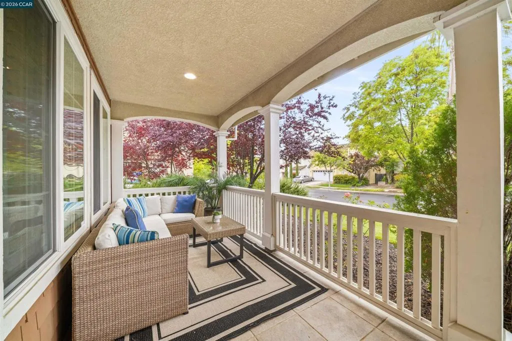 Welcome to this beautifully updated North-facing home in the highly sought-after Windemere Community of San Ramon, offering approximately 3,500 sq ft of thoughtfully designed living space on a 0.13-acre lot. Featuring 5 beds + office & 3 full baths, this home provides exceptional flexibility for modern living. From the charming front porch to the light-filled interiors, this home blends comfort and modern elegance throughout. Discover new flooring, plush new carpet, fresh interior paint, and stylishly updated light fixtures. Step into a bright and airy interior filled with natural light and soaring ceilings. The inviting living room features a cozy fireplace, creating a warm and welcoming atmosphere, while the formal dining room offers an elegant space perfect for gatherings and entertaining. The heart of the home is the spacious kitchen, featuring freshly painted cabinetry, a large center island with stovetop & sleek drop hood. Equipped with stainless steel appliances including built-in double ovens, built-in microwave, & refrigerator with ice maker. The kitchen opens seamlessly to the adjacent family room & an enclosed courtyard, now a versatile sunroom or extended dining space, complete with sliding farmhouse-style doors for added charm & flexibility. The main level offers a convenient bedroom & full bath, ideal for guests or multigenerational living. Additionally, the 3rd car garage has been thoughtfully converted into a bonus bedroom or private office, perfect for today’s work-from-home lifestyle. Upstairs, enjoy a dramatic walkway overlook & built-in hallway storage. The expansive primary suite is filled with natural light & offers a peaceful retreat, complemented by a luxurious bath with dual walk-in closets, a soaking tub with jets, stall shower, & dual sink vanity with abundant lighting. Three additional bedrooms & a sizable guest bath with dual sink vanities complete the upper level. Step outside to a low-maintenance backyard designed for entertaining. Highlights include a built-in outdoor kitchen with a premium Viking appliance package, featuring a grill, warming drawer, griddle, dual sinks, & built-in refrigerator, alongside a paved patio & a stylish pergola with privacy curtains for year-round enjoyment. Additional features include electrical solar and water softener system for enhanced everyday comfort. Conveniently located near top schools, shops, restaurants, parks, trails, & freeway access.