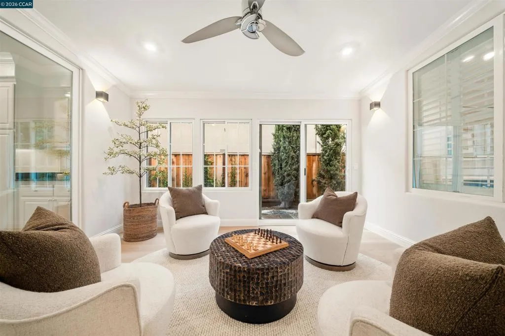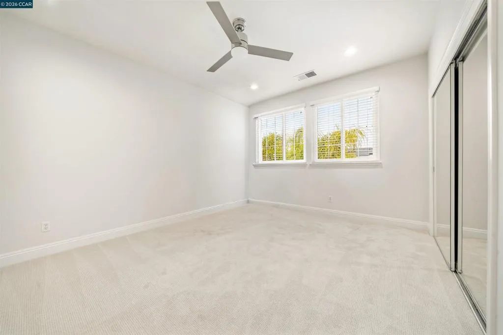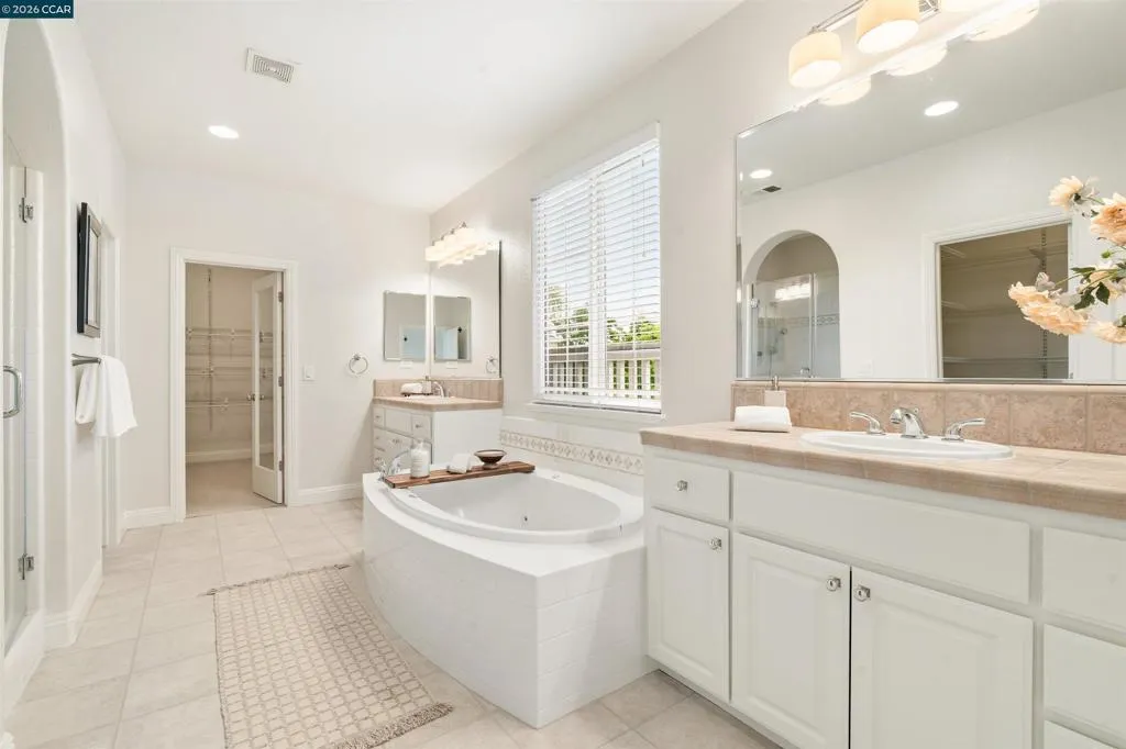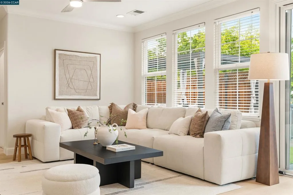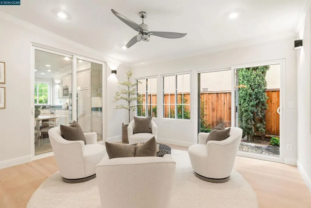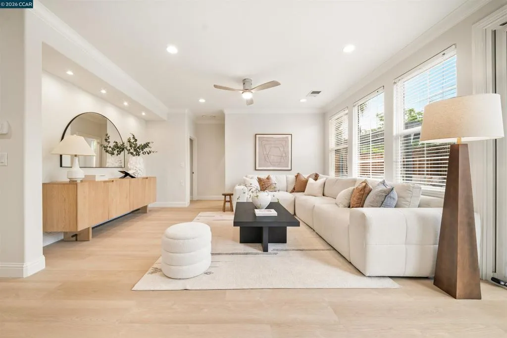 Welcome to this beautifully updated North-facing home in the highly sought-after Windemere Community of San Ramon, offering approximately 3,500 sq ft of thoughtfully designed living space on a 0.13-acre lot. Featuring 5 beds + office & 3 full baths, this home provides exceptional flexibility for modern living. From the charming front porch to the light-filled interiors, this home blends comfort and modern elegance throughout. Discover new flooring, plush new carpet, fresh interior paint, and stylishly updated light fixtures. Step into a bright and airy interior filled with natural light and soaring ceilings. The inviting living room features a cozy fireplace, creating a warm and welcoming atmosphere, while the formal dining room offers an elegant space perfect for gatherings and entertaining. The heart of the home is the spacious kitchen, featuring freshly painted cabinetry, a large center island with stovetop & sleek drop hood. Equipped with stainless steel appliances including built-in double ovens, built-in microwave, & refrigerator with ice maker. The kitchen opens seamlessly to the adjacent family room & an enclosed courtyard, now a versatile sunroom or extended dining space, complete with sliding farmhouse-style doors for added charm & flexibility. The main level offers a convenient bedroom & full bath, ideal for guests or multigenerational living. Additionally, the 3rd car garage has been thoughtfully converted into a bonus bedroom or private office, perfect for today’s work-from-home lifestyle. Upstairs, enjoy a dramatic walkway overlook & built-in hallway storage. The expansive primary suite is filled with natural light & offers a peaceful retreat, complemented by a luxurious bath with dual walk-in closets, a soaking tub with jets, stall shower, & dual sink vanity with abundant lighting. Three additional bedrooms & a sizable guest bath with dual sink vanities complete the upper level. Step outside to a low-maintenance backyard designed for entertaining. Highlights include a built-in outdoor kitchen with a premium Viking appliance package, featuring a grill, warming drawer, griddle, dual sinks, & built-in refrigerator, alongside a paved patio & a stylish pergola with privacy curtains for year-round enjoyment. Additional features include electrical solar and water softener system for enhanced everyday comfort. Conveniently located near top schools, shops, restaurants, parks, trails, & freeway access.