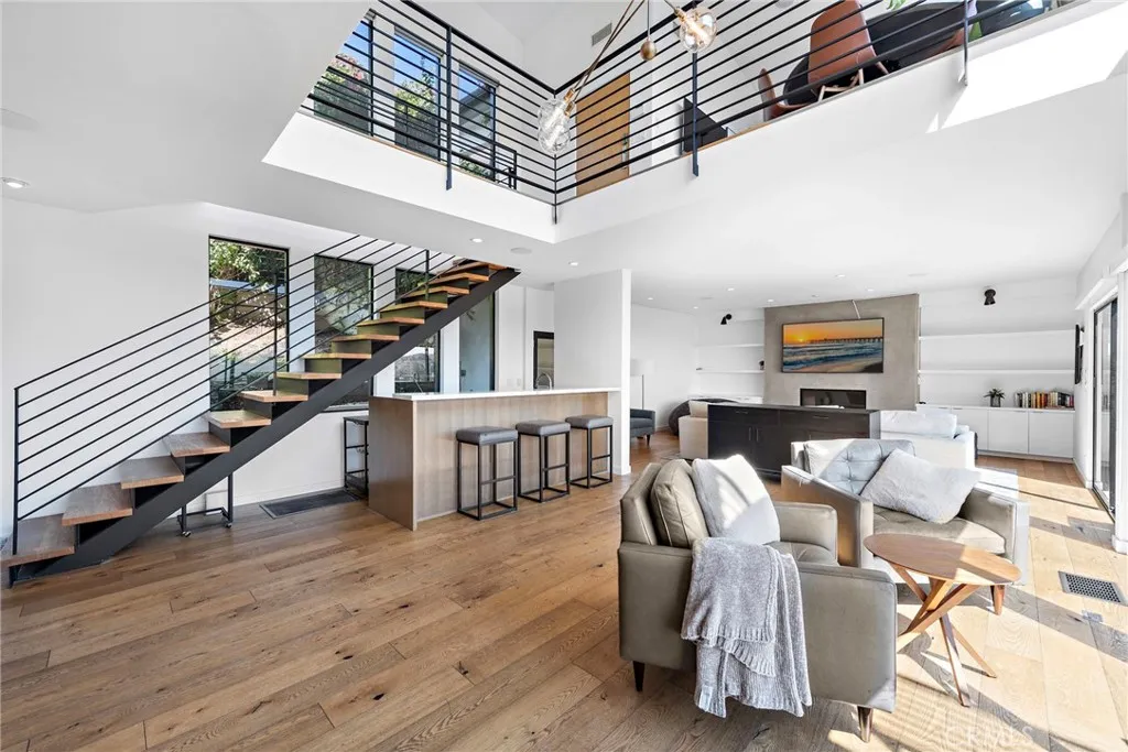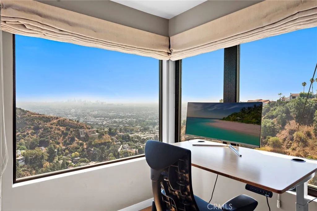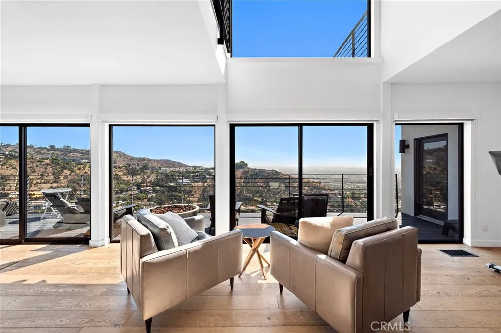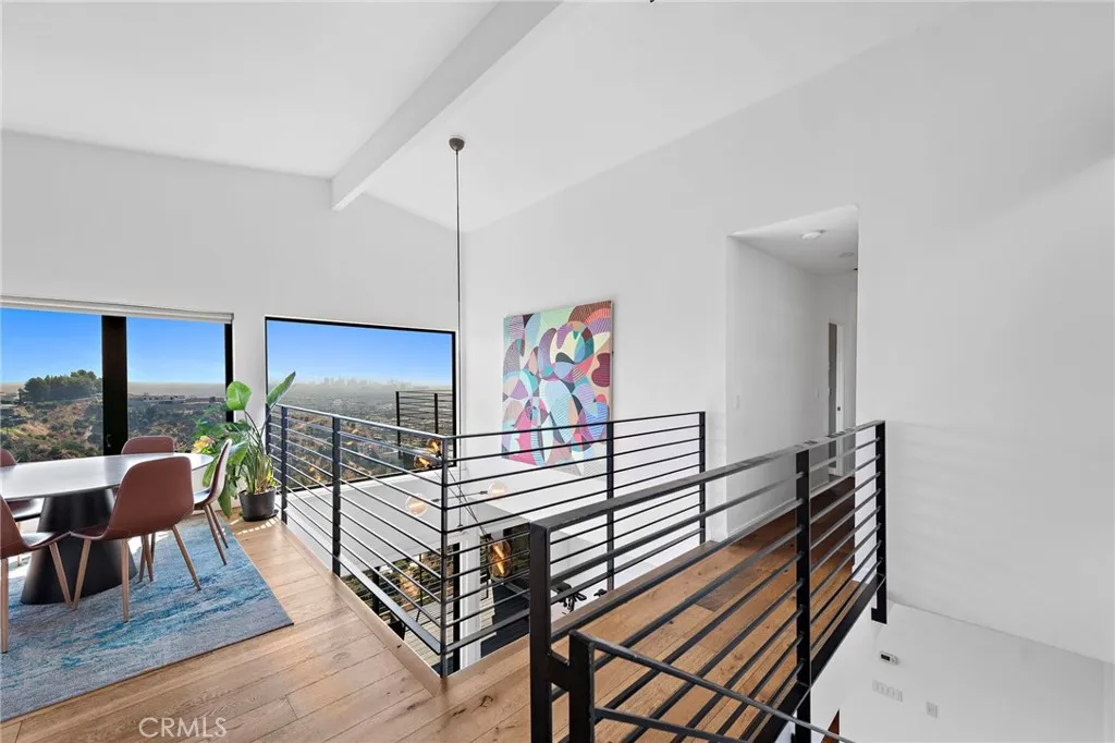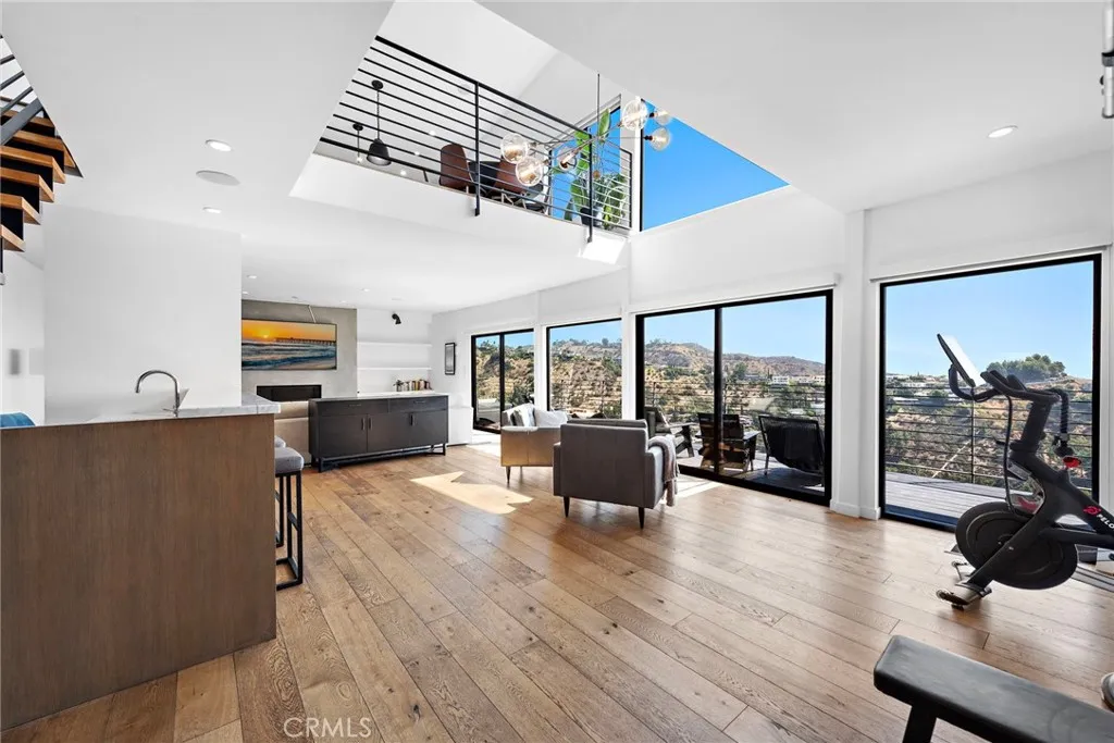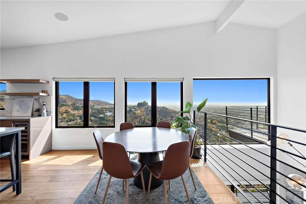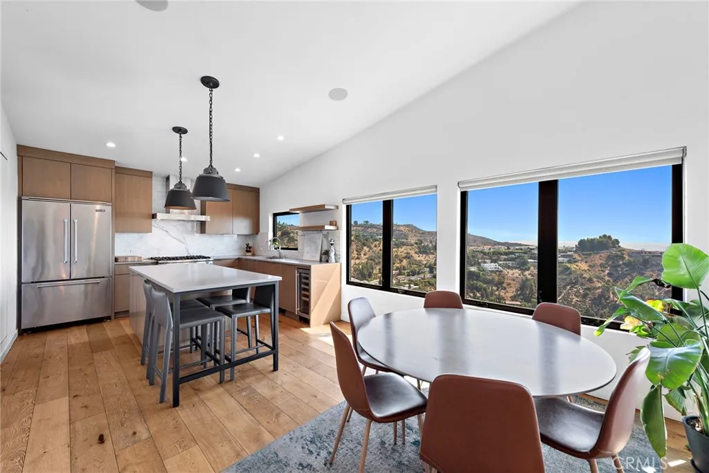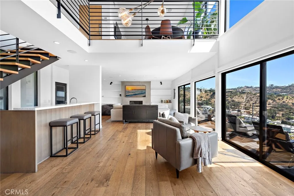 Nestled in the Hollywood Hills, sits this beautifully designed home with breathtaking views of the city below. Despite its secluded and private setting, this is just moments away from the vibrant energy the city has to offer. Having the perfect balance between tranquility and urban convenience, the home allows you to retreat into your own world while still being minutes from the heart of LA's most iconic destinations. The open-concept design invites seamless entertaining with its wet bar, fireplace, and soaring ceilings. The interiors feature oak floors and Caesarstone countertops adding warmth and texture, while panoramic views provide a stunning backdrop. With Viking appliances, a spacious island with seating, and a charming dining nook, this kitchen is perfect for the gourmet chef or casual cook. The primary suite features a corner window framing spectacular views, a walk-in closet, private balcony, and a bathroom with both a soaking tub and a walk-in shower. The front deck, complete with a fire pit, offers the perfect perch to enjoy the glittering LA skyline.