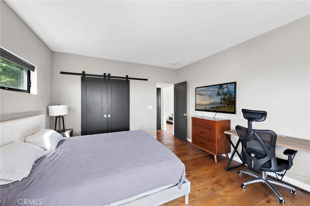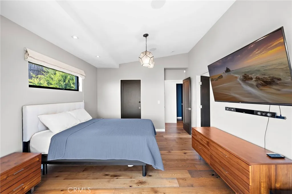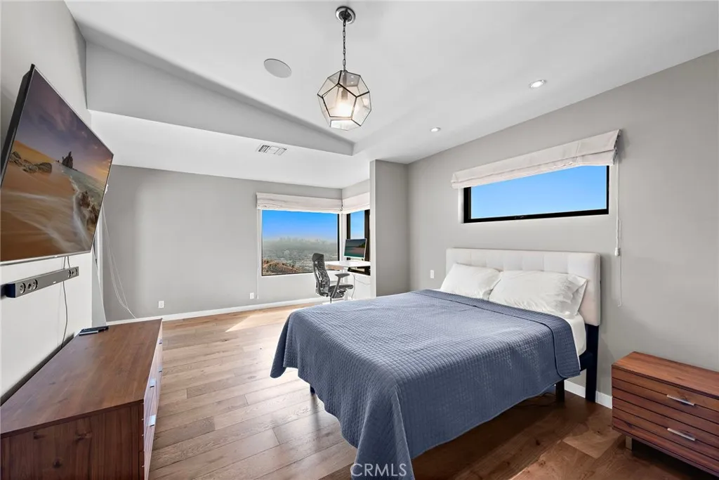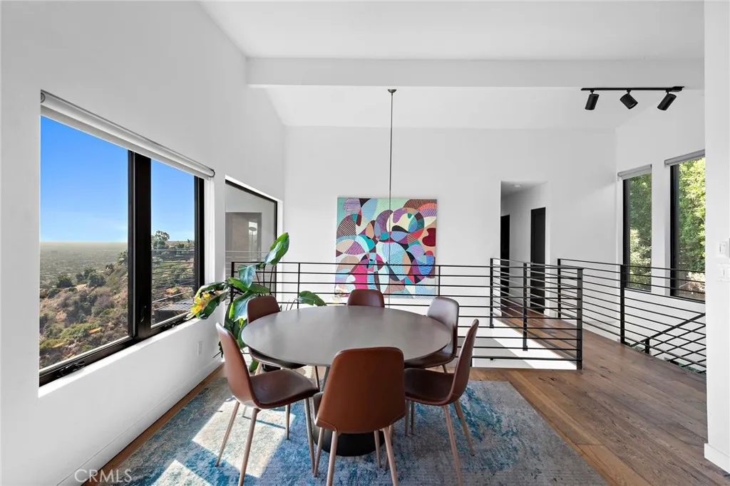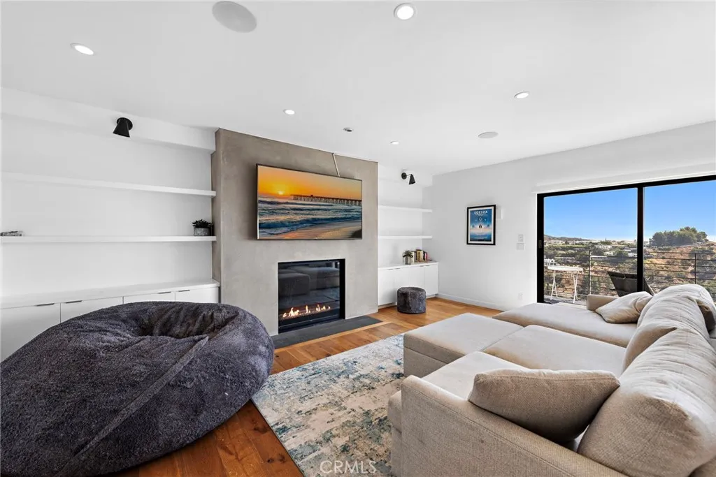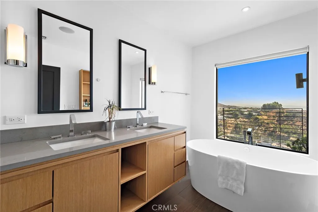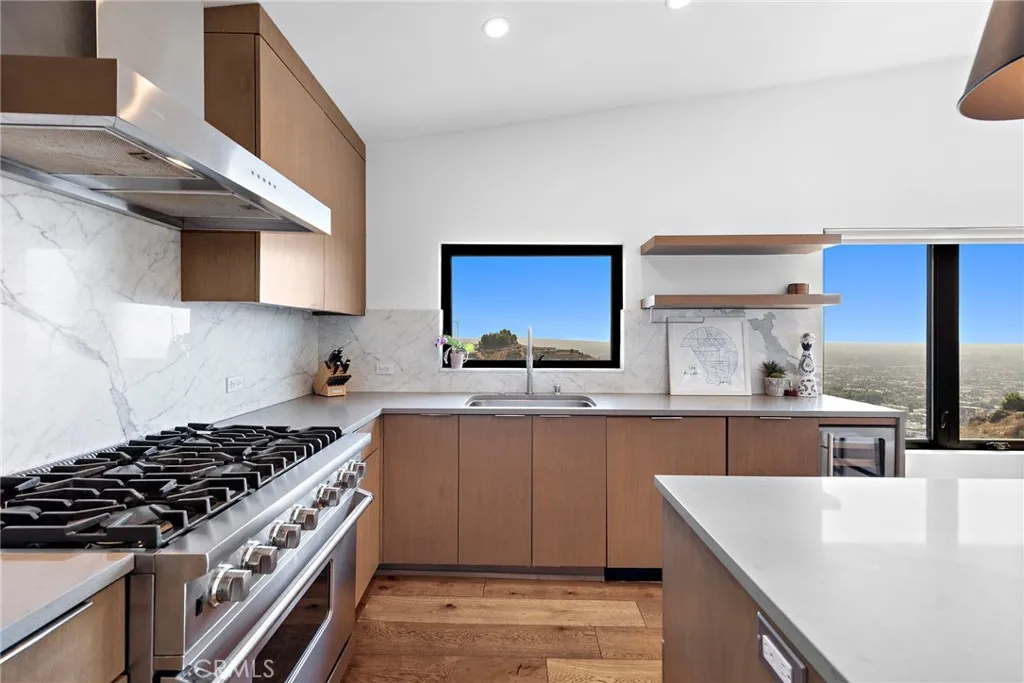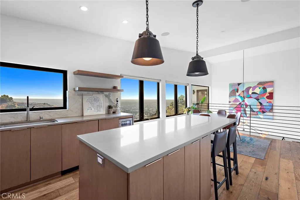 Nestled in the Hollywood Hills, sits this beautifully designed home with breathtaking views of the city below. Despite its secluded and private setting, this is just moments away from the vibrant energy the city has to offer. Having the perfect balance between tranquility and urban convenience, the home allows you to retreat into your own world while still being minutes from the heart of LA's most iconic destinations. The open-concept design invites seamless entertaining with its wet bar, fireplace, and soaring ceilings. The interiors feature oak floors and Caesarstone countertops adding warmth and texture, while panoramic views provide a stunning backdrop. With Viking appliances, a spacious island with seating, and a charming dining nook, this kitchen is perfect for the gourmet chef or casual cook. The primary suite features a corner window framing spectacular views, a walk-in closet, private balcony, and a bathroom with both a soaking tub and a walk-in shower. The front deck, complete with a fire pit, offers the perfect perch to enjoy the glittering LA skyline.