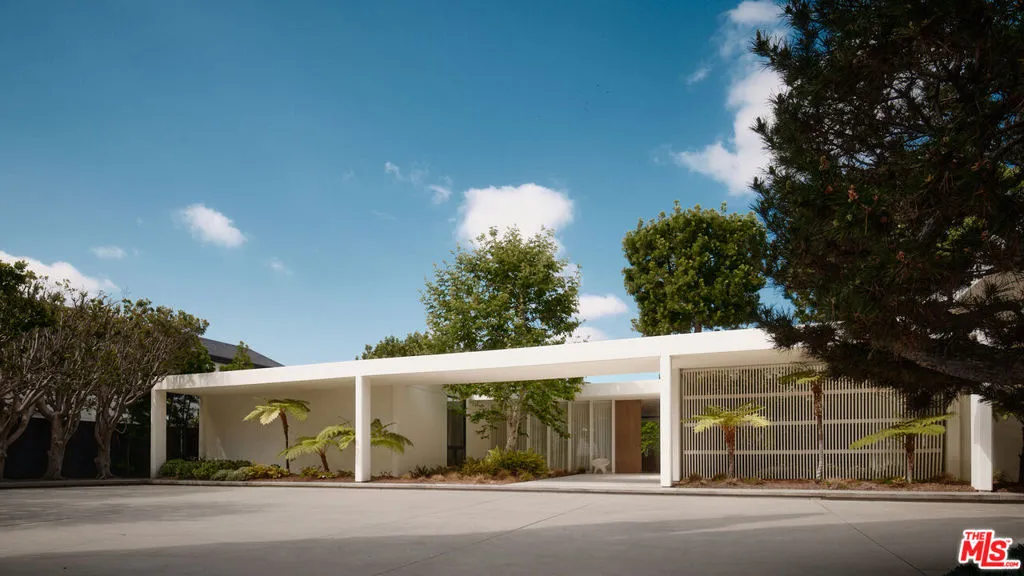 Discreetly nestled behind gates sits this light and bright iconic one-story mid-century home situated on a spectacular 27,800 sf lot. Designed in 1961 by Daniel Dworsky, the man behind Bradley's International Terminal at LAX, UCLA's Drake Stadium and the Federal Reserve Bank in Los Angeles. This flawless floor plan with high ceilings throughout was gutted and reimagined by Waldo Fernandez and has all the finishes appropriate for today's lifestyle. A double-door entry welcomes you into this 4-bedroom, 5-bath home, plus an attached gym/guest room. Floor-to-ceiling glass flanks the formal dining area, and the original double-sided fireplace anchors the living room and family room. Great walls for art, open floor plan, and terrazzo and hardwood floors compliment this extremely rare offering. A separate full bar and gourmet kitchen are perfect for large scale entertaining. Walls of glass overlook a park-like backyard, stunning pool, and outdoor kitchen.