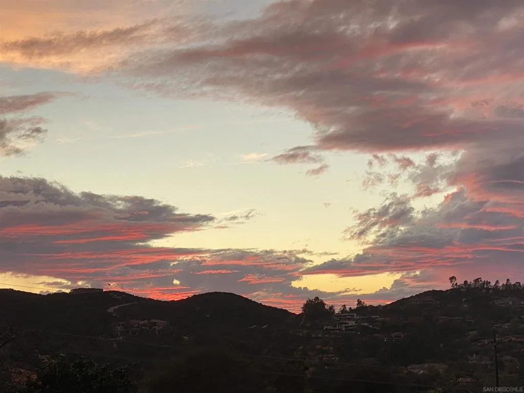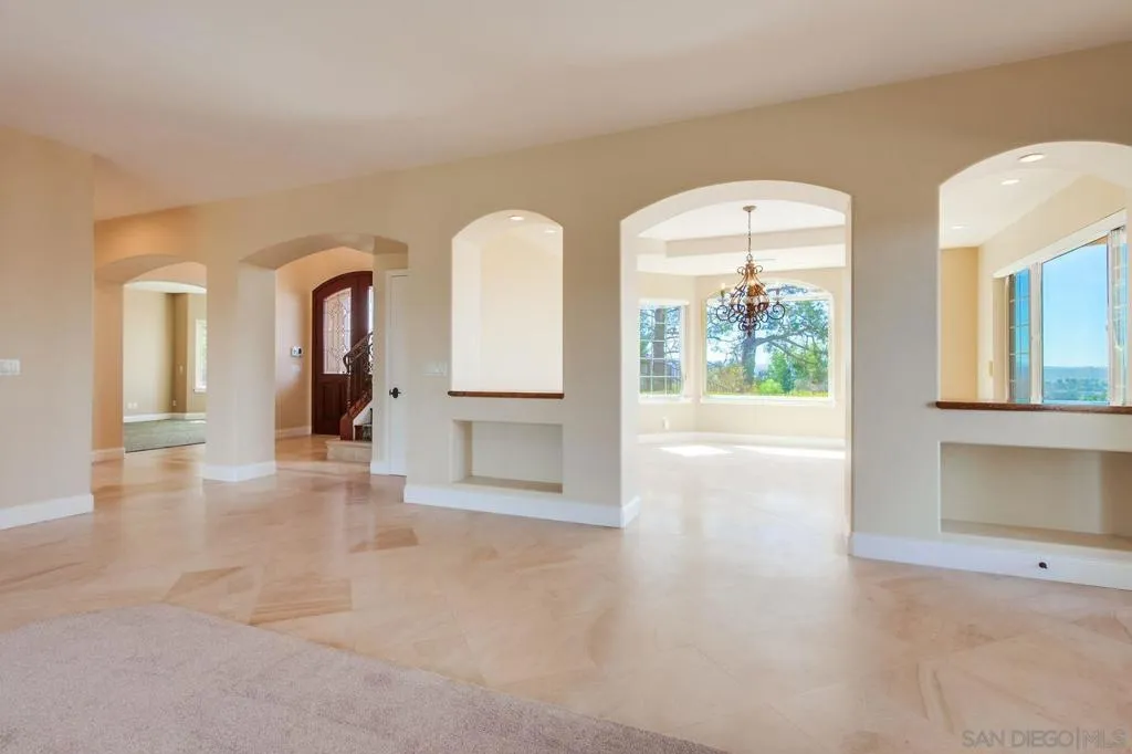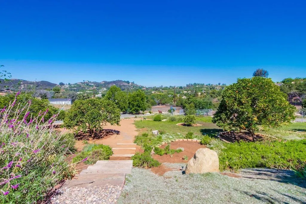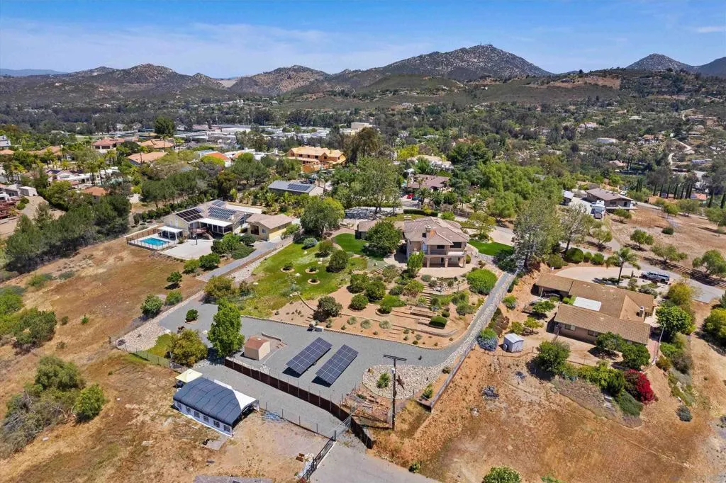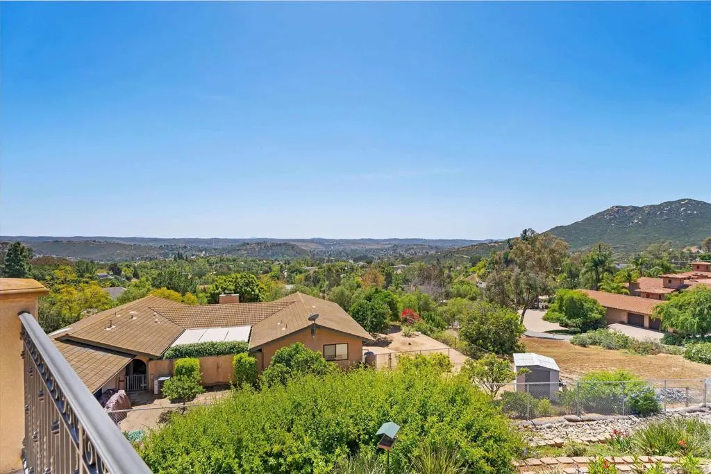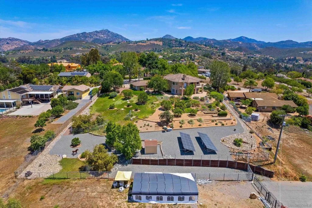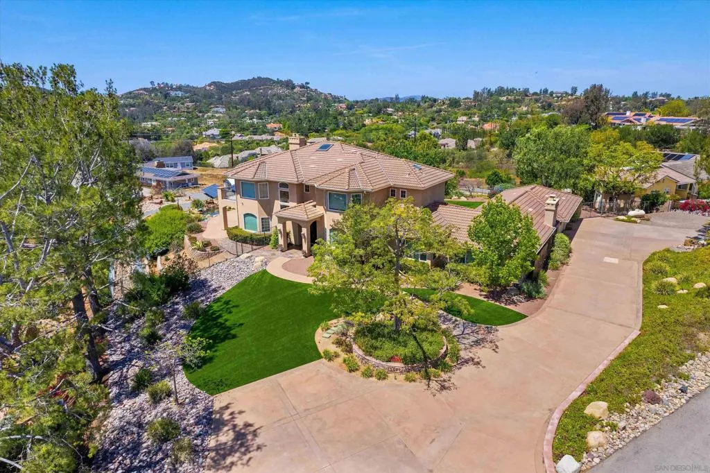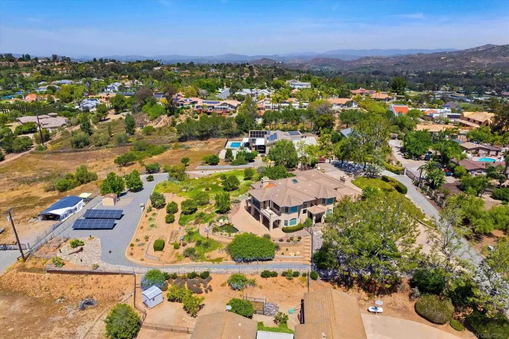 Constructed in 2004, this Mediterranean estate sits on 1.37 elevated acres in Poway with panoramic hill and valley views from virtually every room. The 5,595 sq ft residence includes a fully independent one-bedroom guest flat, a three-car garage, owned solar panels with Enphase battery backup, and grounds that encompass an ornamental koi pond, citrus orchard, terraced gardens, outdoor kitchen and gas fire pit. The level of craftsmanship, systems infrastructure, and thoughtful design throughout is exceptional. The chef's kitchen centers on a massive blue-green granite island with Miele appliances throughout, including built-in column refrigerator and freezer, a hand-carved range hood above an LP gas cooktop, and an artist-painted tile backsplash mural. The formal dining room wraps on three sides with curved windows framing unobstructed hill and valley views. A sweeping curved wrought iron staircase anchors the limestone entry foyer. Upstairs, the master suite includes a sitting room with fireplace and wet bar, a wraparound private terrace, an imported Rosso marble bath with soaking tub positioned before a bank of hill-view windows, a travertine walk-in shower, and a walk-in closet. Secondary bedrooms each have private baths and walk-in closets. A stone LP gas fire pit and citrus grove complete the outdoor program. A broad motor court accommodates eight or more vehicles. The wine cellar features 400-plus bottle redwood racking, dual built-in wine refrigerators, and a secondary storage room accessed through a speak-easy door.