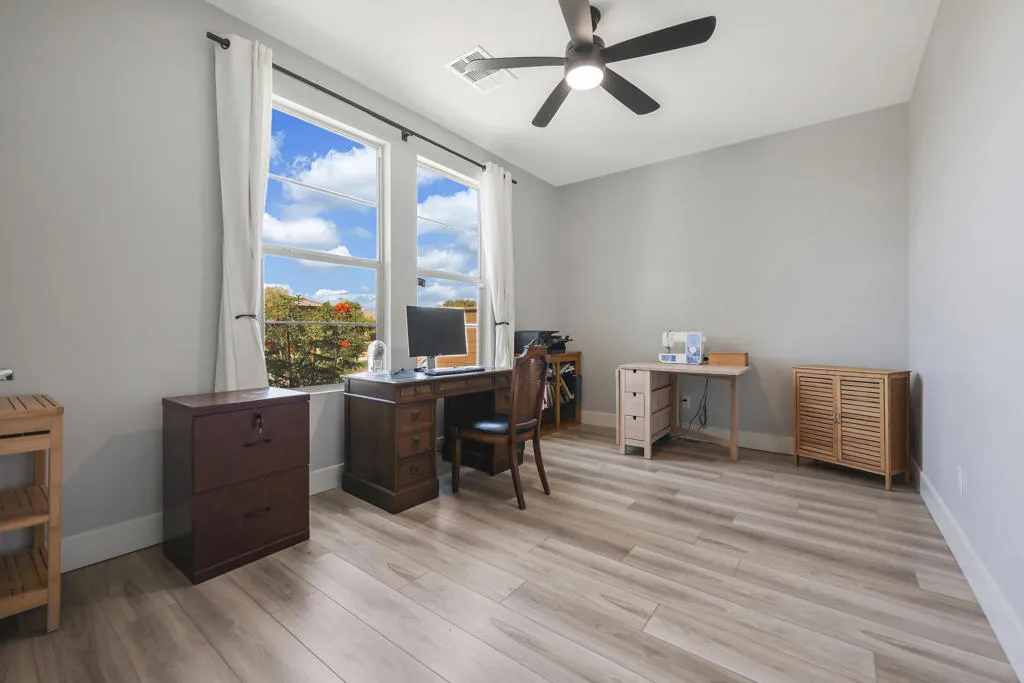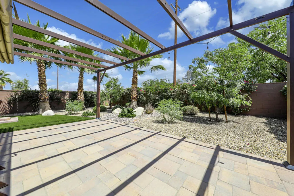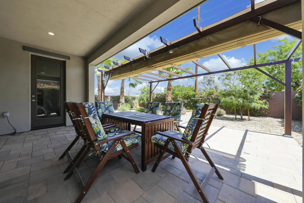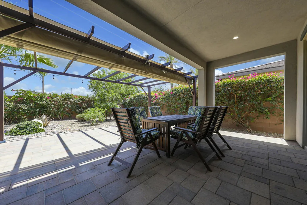 Highly desirable Affirm floor plan with an open-concept design, perfectly suited for both everyday living and entertaining. The beautifully appointed kitchen features quartz countertops, a custom backsplash, a large center island, and upgraded soft-close cabinetry throughout.Enjoy seamless indoor-outdoor living with a multi-sliding glass door that opens to a covered patio with an extended retractable awning, providing additional shade and comfort--ideal for relaxing or hosting. The backyard is thoughtfully finished with paver hardscaping, professionally designed mature landscaping, and low-maintenance artificial turf for year-round appeal. This flexible layout offers two bedrooms plus a spacious den, well-suited for a home office, media room, or guest space. Additional highlights include an energy-efficient tankless water heater and a stylish primary bathroom featuring dual vanity sinks, a framed mirror, a custom shower with bench seating, and a walk-in closet. Located within the sought-after 55+ section of Trilogy, this home offers a refined balance of comfort and resort-style living. An optional Polo Club membership provides access to the clubhouse, state-of-the-art fitness center, resort and lap pools, tennis and pickleball courts, an indoor golf simulator, and dining at June Hill's Table, along with a full calendar of social offerings.