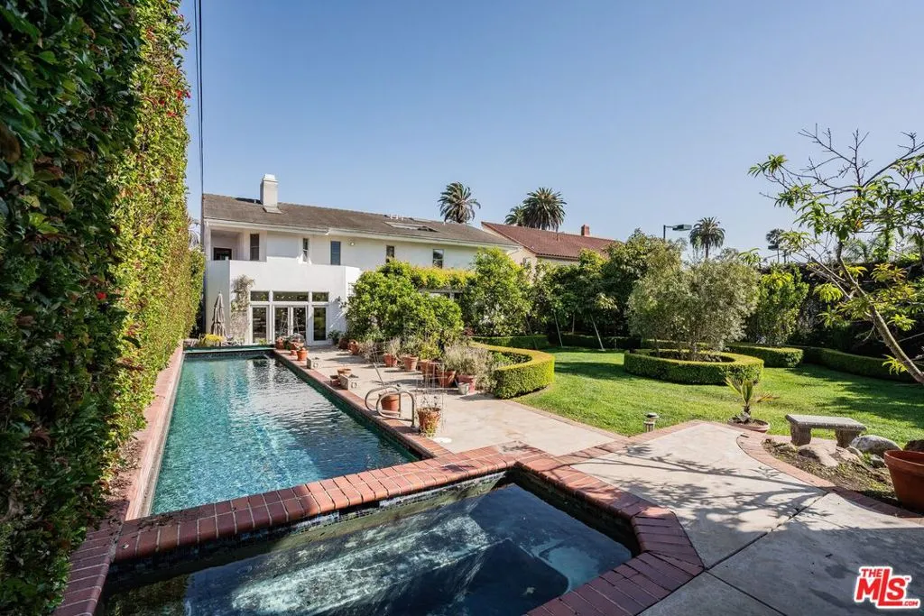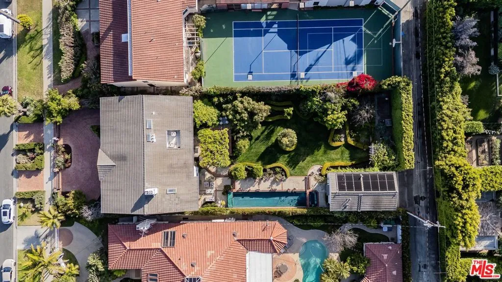 143 Marguerita Ave presents an exceptional opportunity on one of Santa Monica's most desirable streets, just four properties from Ocean Avenue, on an expansive, tennis-court-sized 14,626 sq ft lot along a wide, palm-tree-lined street. This beautifully appointed 6-bedroom, 8-bath ocean-view residence spans nearly 5,900 sq ft of elegant living space, designed for both grand entertaining and everyday comfort. Highlights include a dramatic entry with a sweeping staircase, over-scale light-filled formal living and dining rooms with soaring ceilings, and a thoughtfully designed floor plan with multiple en-suite bedrooms. The main level features a wood-paneled library or office and separate staff or guest quarters. The chef's kitchen, remodeled within the last six years, showcases marble countertops, custom cabinetry, and premium Sub-Zero and La Cornue appliances, opening to a bright breakfast area and spacious family room overlooking the grounds. Upstairs, the expansive primary suite offers a private retreat with ocean views and an oversized walk-in closet and dressing room area, complemented by three additional bedrooms. Some bathrooms offer the opportunity for a buyer to update and personalize them to their taste. The private resort-style backyard is a true sanctuary with mature landscaping, numerous fruit trees, and lush high hedging providing total privacy. It features a lap pool, hot tub, and a separate pool house with a sauna and shower, along with multiple areas for outdoor dining and lounging, including a pergola-covered patio. A detached guest house at the rear of the lot with its own entrance and garage adds flexibility and value, while the main house offers a 3-car subterranean garage with substantial storage. Additional features include hardwood flooring throughout most of the home, three fireplaces, central HVAC, central vacuum, and a well-maintained concrete shingle roof, all just moments from the beach, renowned restaurants, Palisades Park, premier shopping in the heart of Santa Monica, and the iconic Santa Monica Pier.
