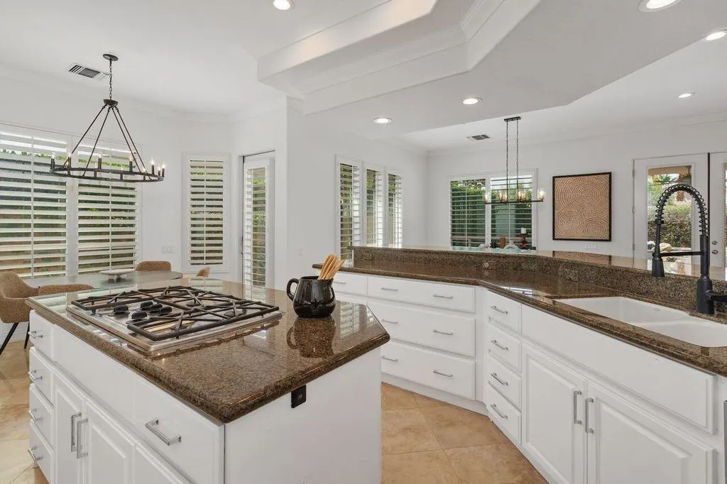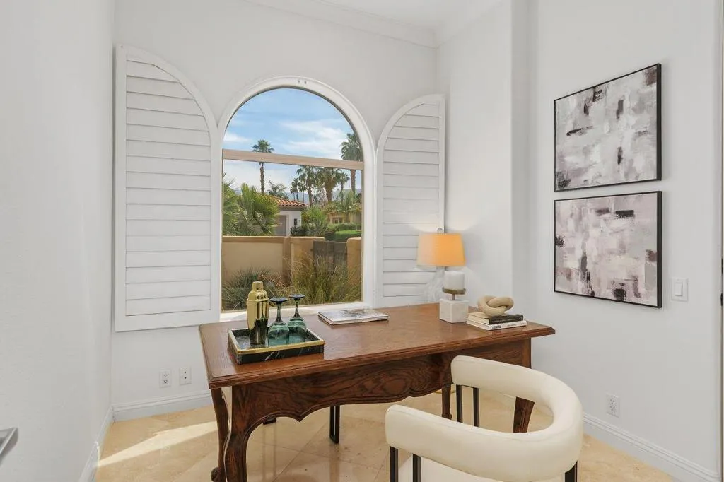 This 10+ stunning home has it all! One of the most desirable gated communities in Rancho Mirage with the most incredible Mountain and Star gazing views with plenty of privacy. Between El Paseo ''Rodeo Drive of the Desert'' & The River with shopping & restaurants galore! Also, nearby tennis & Pickleball courts, bike & walking trails, and the Omni- Rancho Las Palmas Golf & Resort. Through the private courtyard gates, you will find your own paradise! Double glass entry doors, top quality smooth stucco finish, solid 2x6 Construction, soaring 10' to 12' ceilings w/crown molding, 8ft solid core doors, exquisite custom light fixtures & fans, wide open floor plan w/walls of glass everywhere you look! Chef's dream kitchen with professional stainless built-in refrigerator & appliances, center island cook top, huge sit-down Island bar and breakfast nook with French door access to the backyard pool area. Elegant dining rm is a part of the greatroom design perfect for entertaining! 3 bedrooms plus an enclosed office. Generous primary suite with a spa-like bath with a tub & a separate shower, & large walk-in closet. 2 Generous guest bedrooms and baths. And a small office off the 2nd guest bedroom or 2nd entry from Garage. Laundry rm w/sink & storage. Expansive patio has outdoor entertaining w/tv, dining & firepit conversation area with Stunning Mountain Views! Large grassy areas in backyard, side yard and front courtyard. Waterfall saltwater Pool & Spa. Staged Furnishings available on separate contract. Low HOA of $195.00