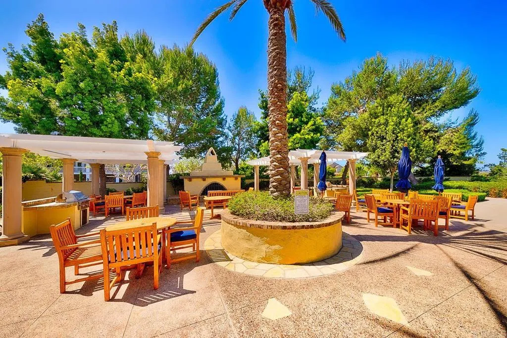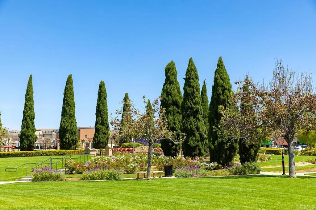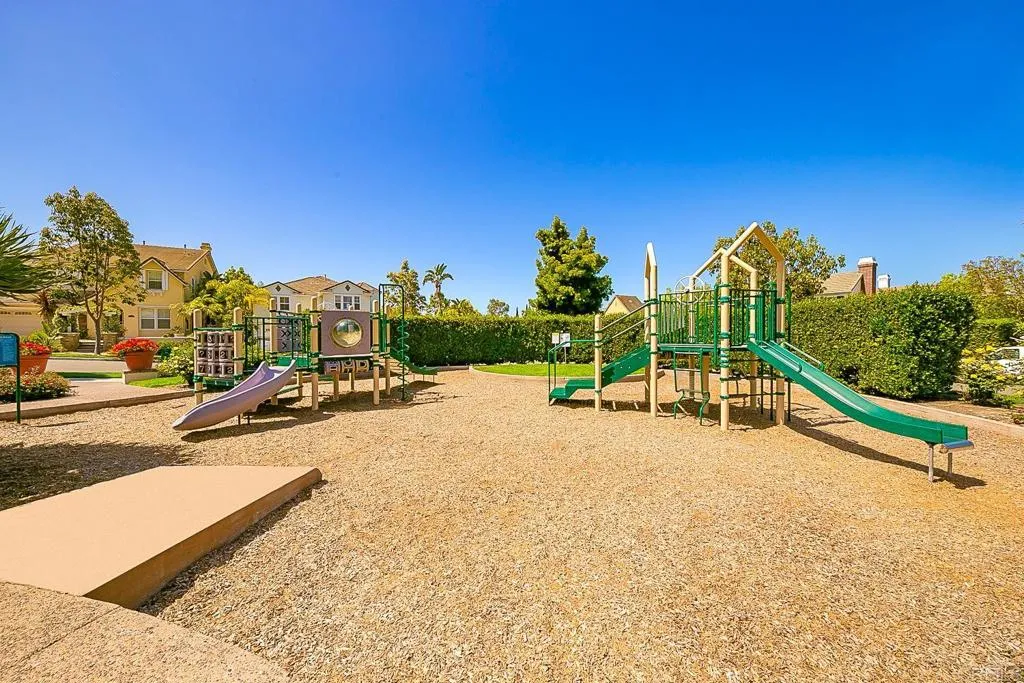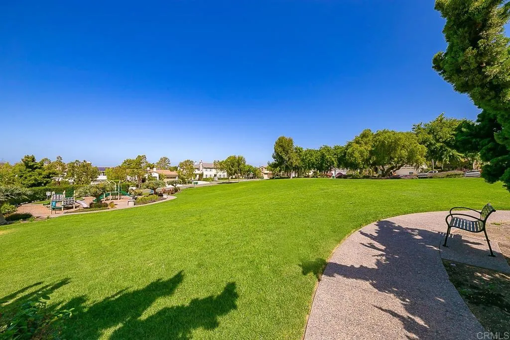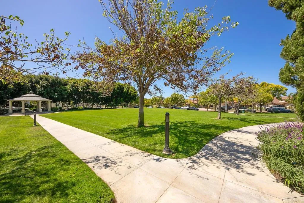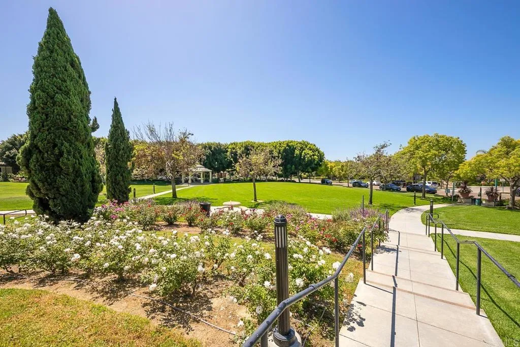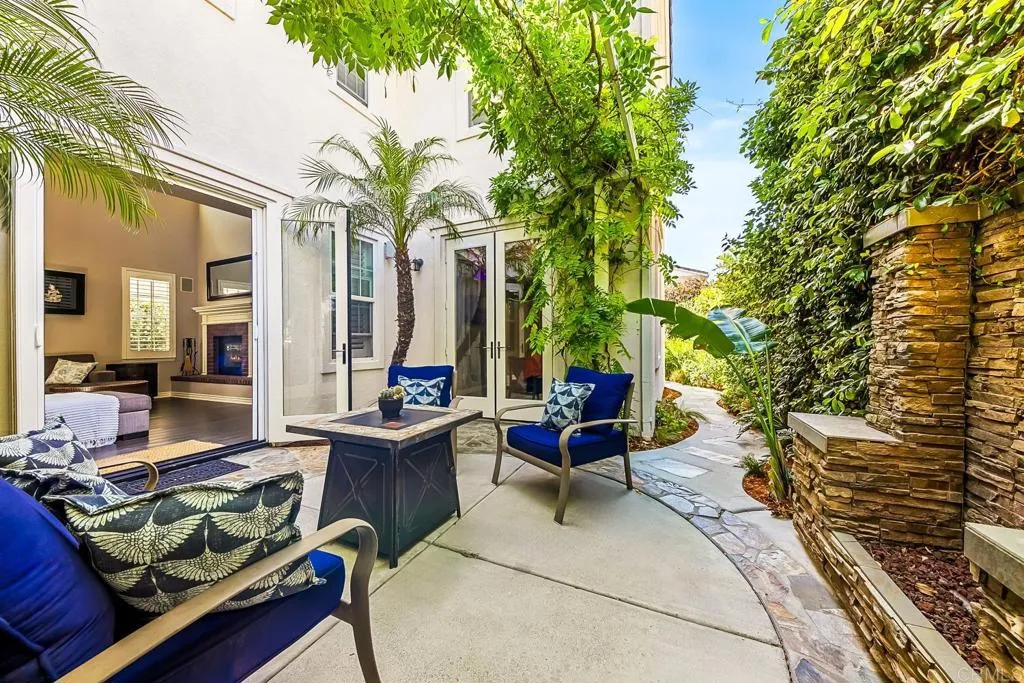 Paradise found - literally - on Paradise Road in Carlsbad's Bressi Ranch. Traditional-elevation with storybook charm, this residence sits across from one of Bressi Ranch's eight community parks and greets you with a wisteria-draped front porch and cheerful red door. Inside, an open main-level floor plan features soaring ceilings, a built-in media center anchoring the family room, and a chef's kitchen with white shaker cabinetry, granite counters, stainless appliances, and a sunny bay-window breakfast nook. A full bedroom and bath on the main level - ideal for guests or multi-generational living. French doors open to a private pergola-shaded courtyard wrapped in wisteria and jasmine. Upstairs, bathroom cabinetry has been freshly painted crisp white to match the kitchen below, bringing the whole home together. Two-car garage with storage. Stroll to the resort-style Bressi Ranch clubhouse, pool and spa, Trader Joe's, Pizza Port, Yoga Six, and the shops and dining of Bressi Village. Minutes to Alga Norte Park, Poinsettia Elementary, Pacific Ridge School, Carlsbad beaches, and Legoland.