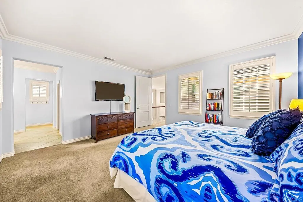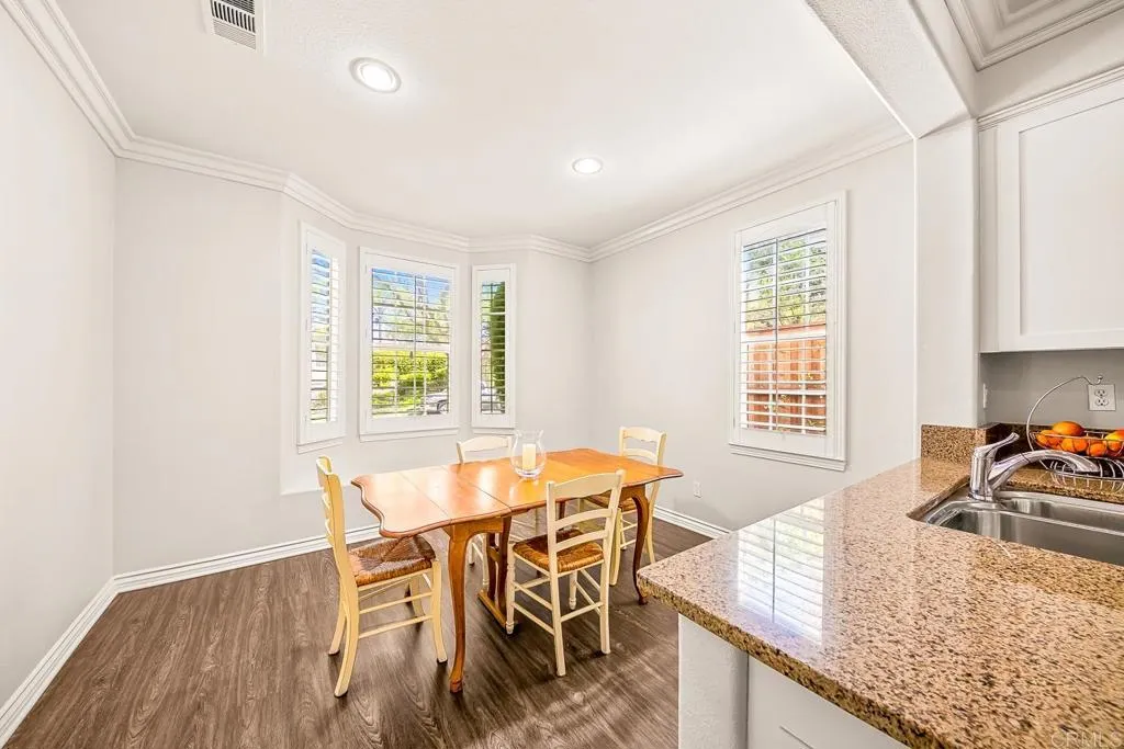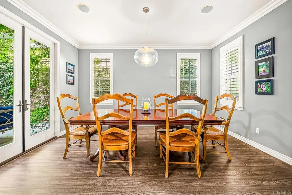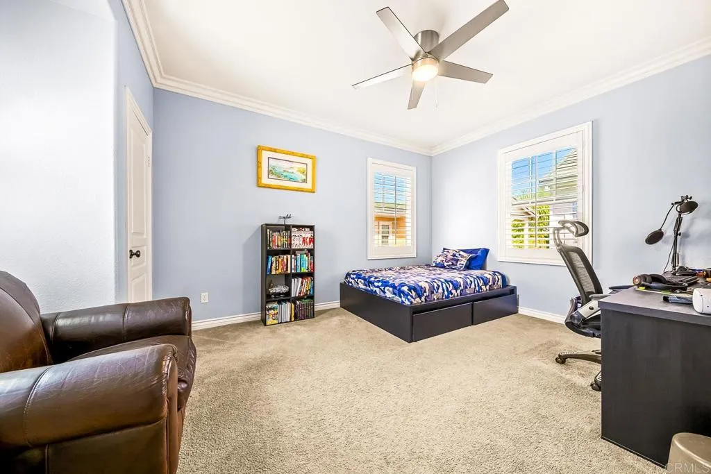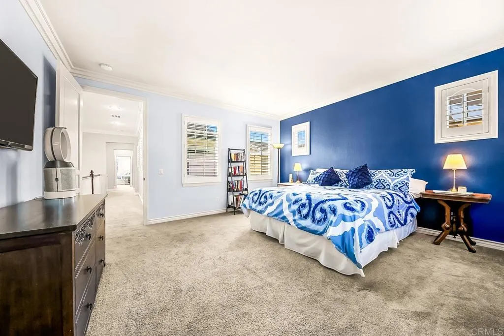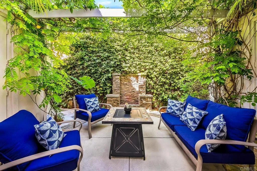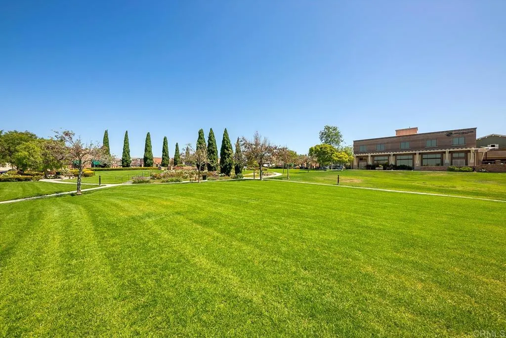 Paradise found - literally - on Paradise Road in Carlsbad's Bressi Ranch. Traditional-elevation with storybook charm, this residence sits across from one of Bressi Ranch's eight community parks and greets you with a wisteria-draped front porch and cheerful red door. Inside, an open main-level floor plan features soaring ceilings, a built-in media center anchoring the family room, and a chef's kitchen with white shaker cabinetry, granite counters, stainless appliances, and a sunny bay-window breakfast nook. A full bedroom and bath on the main level - ideal for guests or multi-generational living. French doors open to a private pergola-shaded courtyard wrapped in wisteria and jasmine. Upstairs, bathroom cabinetry has been freshly painted crisp white to match the kitchen below, bringing the whole home together. Two-car garage with storage. Stroll to the resort-style Bressi Ranch clubhouse, pool and spa, Trader Joe's, Pizza Port, Yoga Six, and the shops and dining of Bressi Village. Minutes to Alga Norte Park, Poinsettia Elementary, Pacific Ridge School, Carlsbad beaches, and Legoland.
