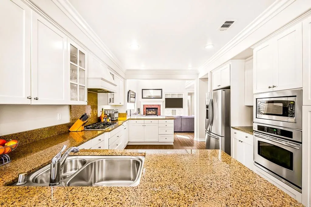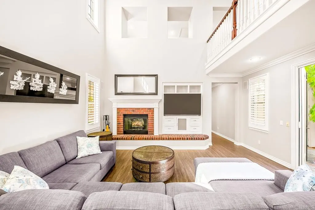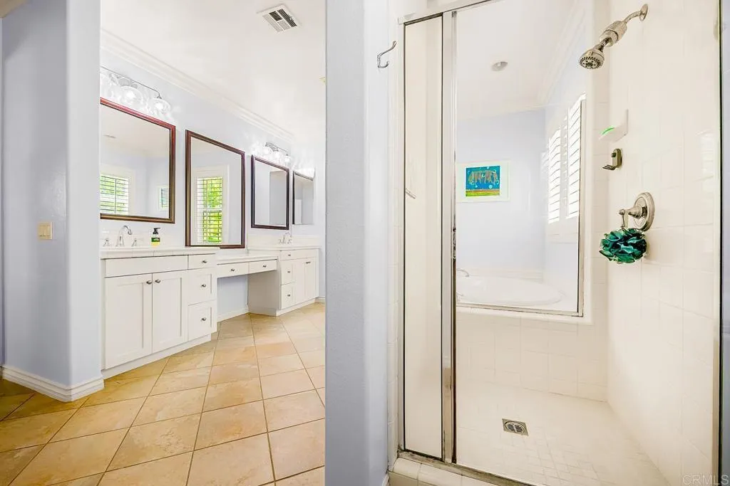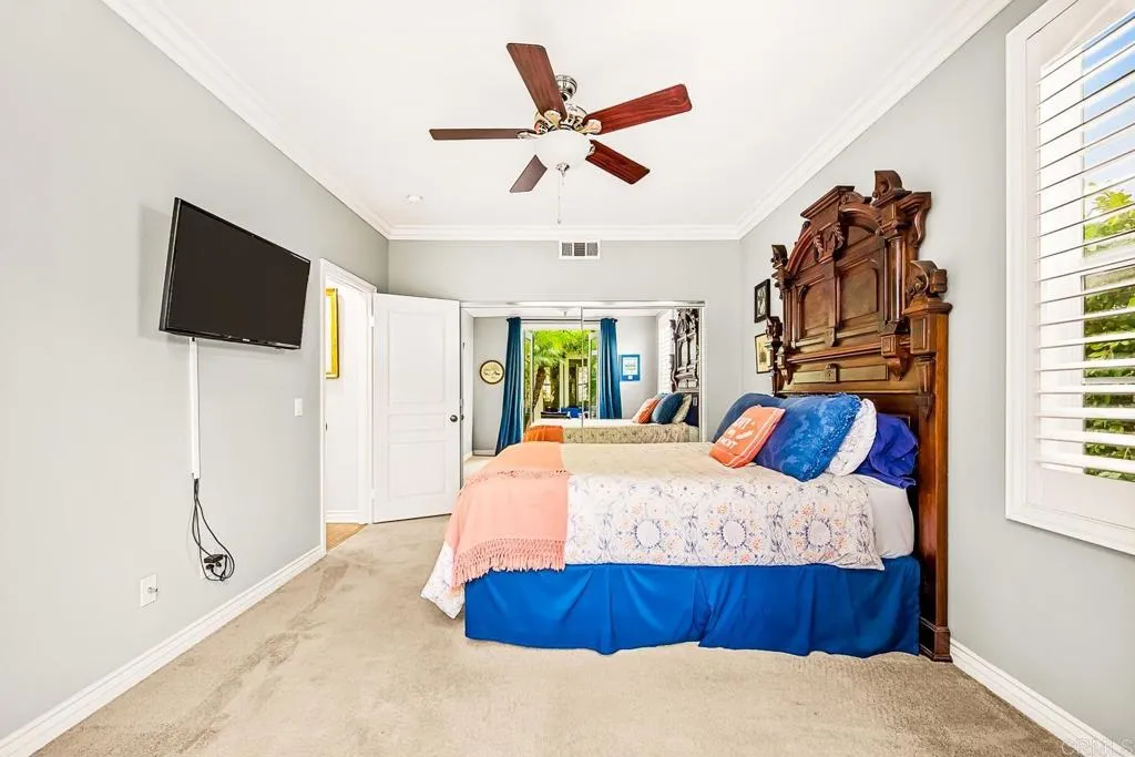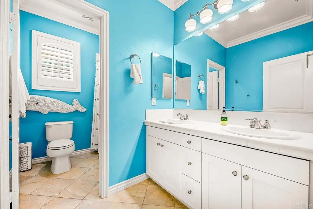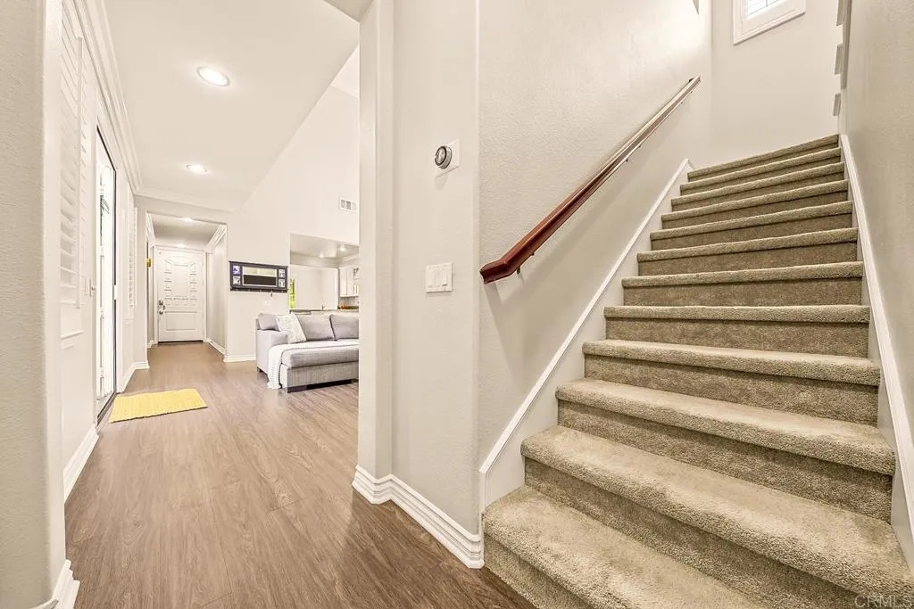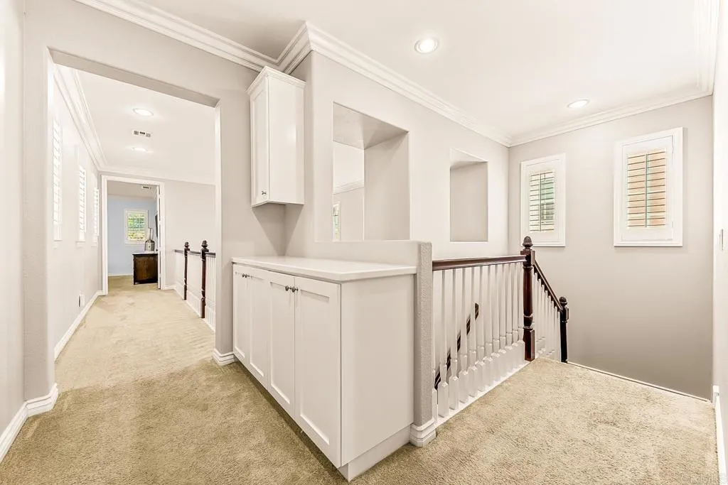 Paradise found - literally - on Paradise Road in Carlsbad's Bressi Ranch. Traditional-elevation with storybook charm, this residence sits across from one of Bressi Ranch's eight community parks and greets you with a wisteria-draped front porch and cheerful red door. Inside, an open main-level floor plan features soaring ceilings, a built-in media center anchoring the family room, and a chef's kitchen with white shaker cabinetry, granite counters, stainless appliances, and a sunny bay-window breakfast nook. A full bedroom and bath on the main level - ideal for guests or multi-generational living. French doors open to a private pergola-shaded courtyard wrapped in wisteria and jasmine. Upstairs, bathroom cabinetry has been freshly painted crisp white to match the kitchen below, bringing the whole home together. Two-car garage with storage. Stroll to the resort-style Bressi Ranch clubhouse, pool and spa, Trader Joe's, Pizza Port, Yoga Six, and the shops and dining of Bressi Village. Minutes to Alga Norte Park, Poinsettia Elementary, Pacific Ridge School, Carlsbad beaches, and Legoland.