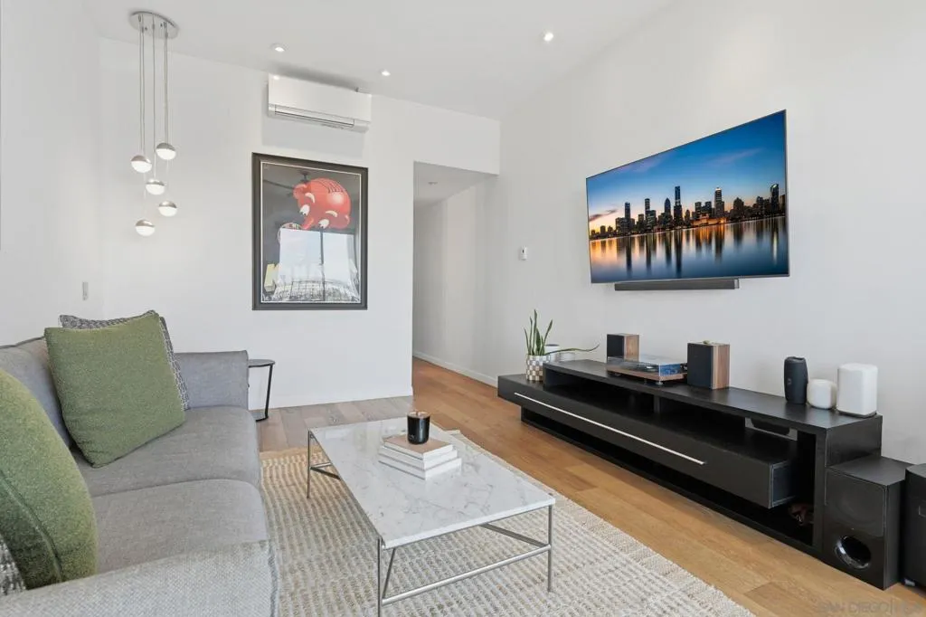 This beautifully remodeled townhome offers a bright, airy interior with a modern design. Fully renovated in 2018, the home features a stunning kitchen with light oak custom cabinetry, quartz countertops, and stainless steel appliances. High-end finishes are showcased throughout, including walnut flooring, a modern staircase, and thoughtfully upgraded bathrooms with quartz counters, tiled showers and custom cabinetry. Other features include upstairs laundry area, modern light fixtures, wine storage, & tiled fireplaces in both the living room and primary bedroom. Step outside to your private balcony and take in sweeping water and city skyline views—perfect for relaxing or entertaining. Additional features include dual pane windows, added air conditioning, new roof, & two underground assigned parking spaces. Ideally located just minutes from the 5 freeway, downtown, and the beach, this home seamlessly blends style, comfort, and convenience.
