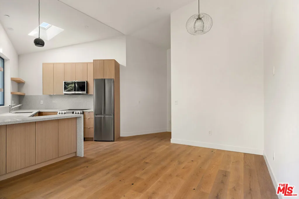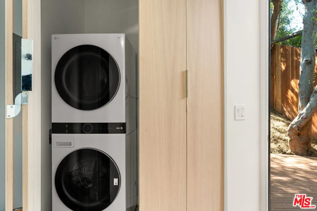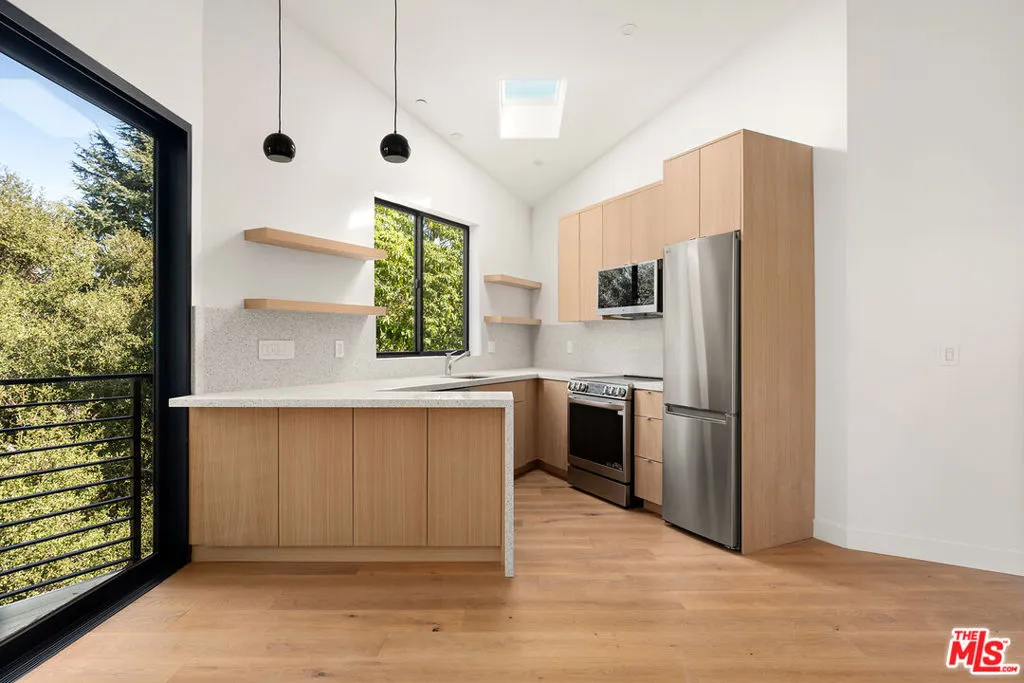 Enjoy serene hillside living in this brand-new architectural ADU surrounded by lush greenery and natural light. This thoughtfully designed 1-bedroom, 1-bath retreat features high ceilings, wide-plank oak floors, and designer finishes throughout. The open-concept kitchen boasts custom white oak cabinetry, terrazzo-inspired quartz counters, open shelving, and premium stainless steel appliances. Oversized glass sliders open to a private deck nestled among mature trees, perfect for morning coffee or evening relaxation. The bedroom includes custom built-in closets and an en-suite bath with a walk-in shower, floating vanity, and warm wood tones for a spa-like feel. Additional highlights in-unit washer & dryer, and a private entry with a striking modern orange door. Tucked away for privacy yet close to everything, this peaceful hideaway offers the perfect blend of modern design and natural tranquility.