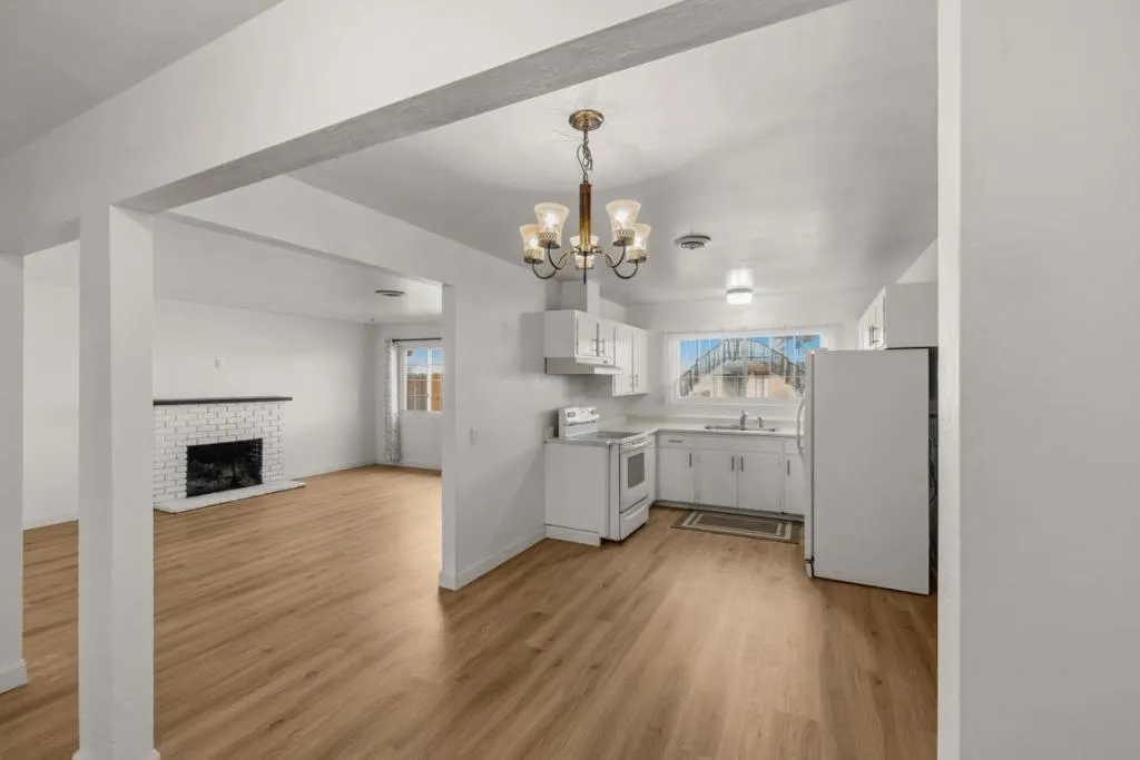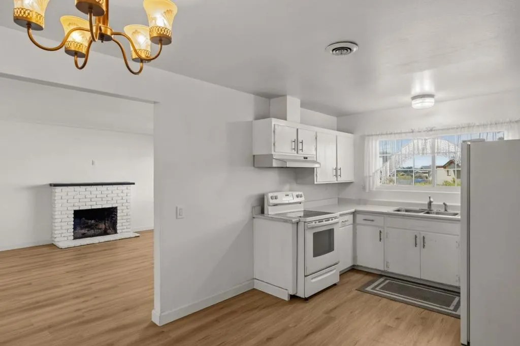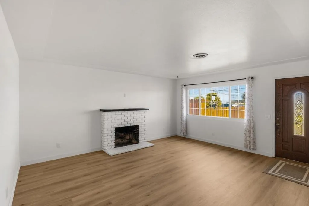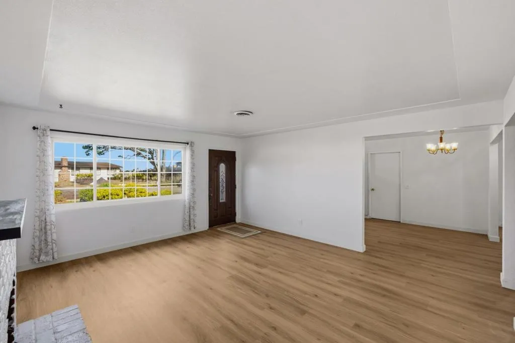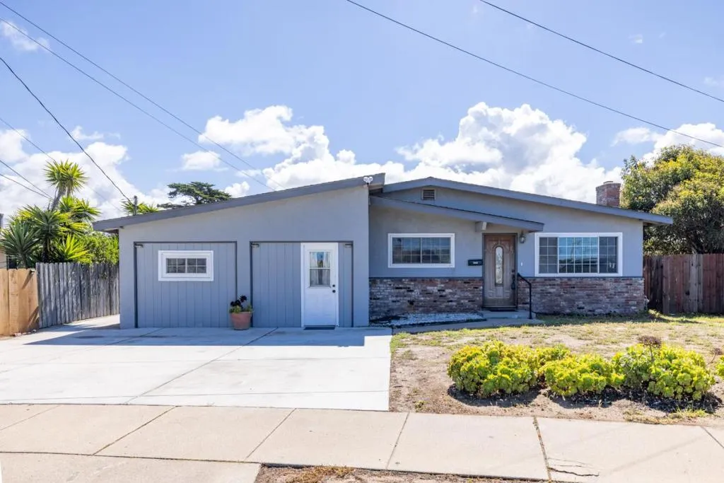 Located in Marina, this 3-bedroom, 2- full bath, 1 half bath home offers 1,482 square feet of living space. The kitchen includes an electric cooktop, electric oven, and refrigerator, complemented by a breakfast nook for casual dining. Flooring features a mix of newly installed carpet and laminate throughout the home. The living room has a wood-burning fireplace, adding a cozy focal point. Bathrooms include one with marble finishes, a shower over tub, and a stall shower in the other. Laundry facilities with 110V and 220V electric hookups are conveniently located in the garage area. Heating is provided by central forced air fueled by gas, and there is no cooling system installed. This home is part of the Monterey Peninsula Unified elementary school district.