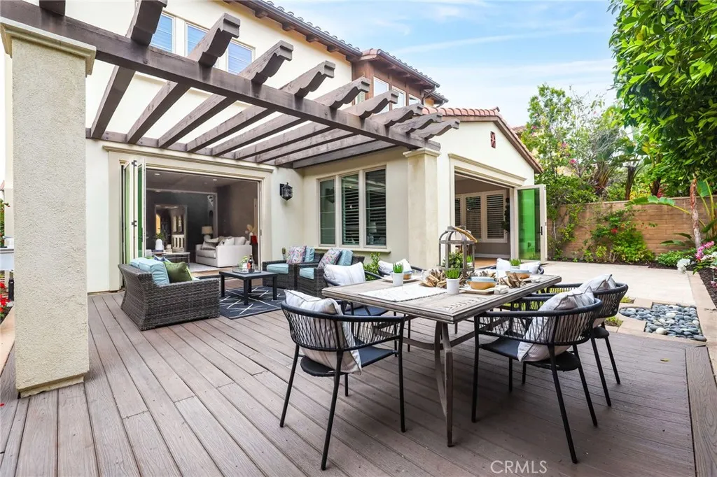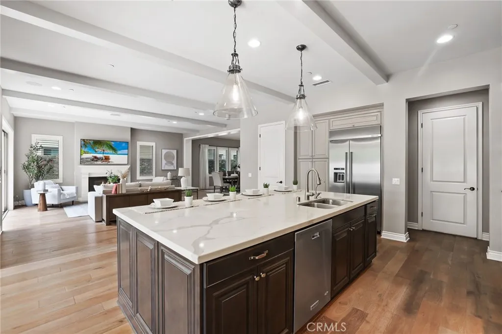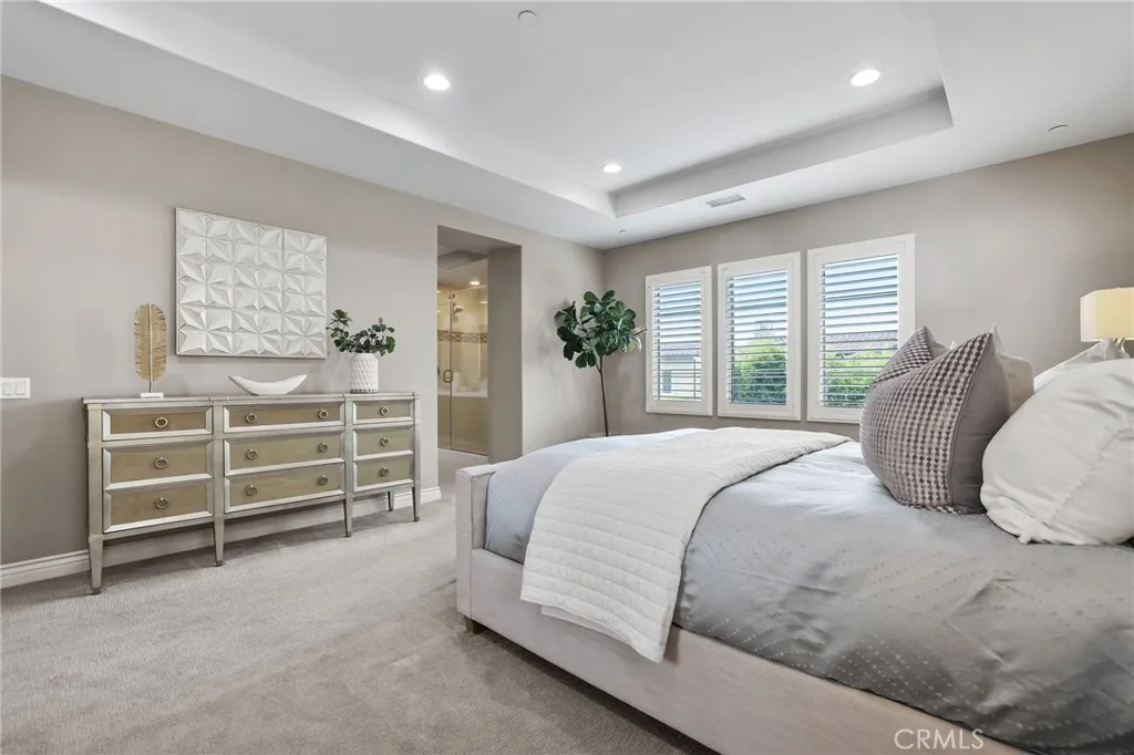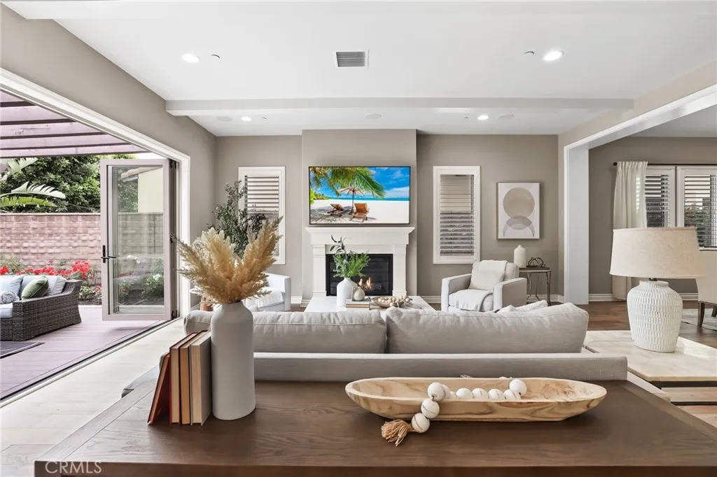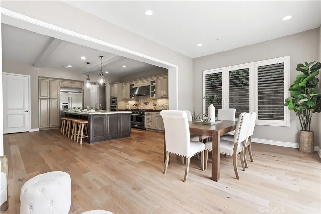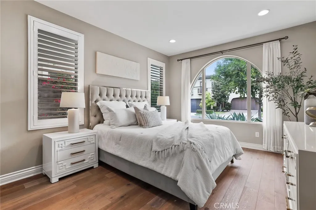 Located in the prestigious guard-gated community of The Groves at Orchard Hills, this stunning Modern Mediterranean residence offers 4 ensuite bedrooms, including a highly desirable main-level guest suite, plus an upstairs loft across approximately 4,191 square feet of thoughtfully designed living space. Enter through the solid wood front door to rich hardwood flooring and an open-concept great room showcasing soaring ceilings and elegant wood beam details. The spacious family room flows seamlessly into the dining area and gourmet kitchen, appointed with upgraded cabinetry, quartz countertops, oversized center island accented by designer RH pendant lights, walk-in pantry, stainless steel appliances, and a separate prep kitchen that provides additional cabinetry, counter space, secondary sink, and enhanced functionality for entertaining, everyday cooking, or keeping the main kitchen beautifully organized. The downstairs guest bedroom with private ensuite bath is ideal for multigenerational living, overnight guests, or a private home office. Upstairs, a generous loft provides flexible living space ideal for a media room, office, or play area. The luxurious primary suite features a spa-inspired bath and dual walk-in closets with custom built-in shelving. Two additional secondary bedrooms are generously sized, each with their own private full baths. Designed for exceptional indoor-outdoor living, the backyard offers a spacious covered patio with pergola, perfect for entertaining or everyday relaxation, with stylish seating and dining areas framed by mature landscaping for enhanced privacy. Additional highlights include energy-efficient solar panels, water softening system, epoxy-coated garage floors, and built-in garage cabinetry providing excellent storage and organization. Residents enjoy resort-style Orchard Hills amenities including pools, spas, clubhouse, tennis and basketball courts, tot lot, picnic areas, and scenic greenbelts. Ideally located within walking distance to top-ranked elementary & middle schools and shopping centers.