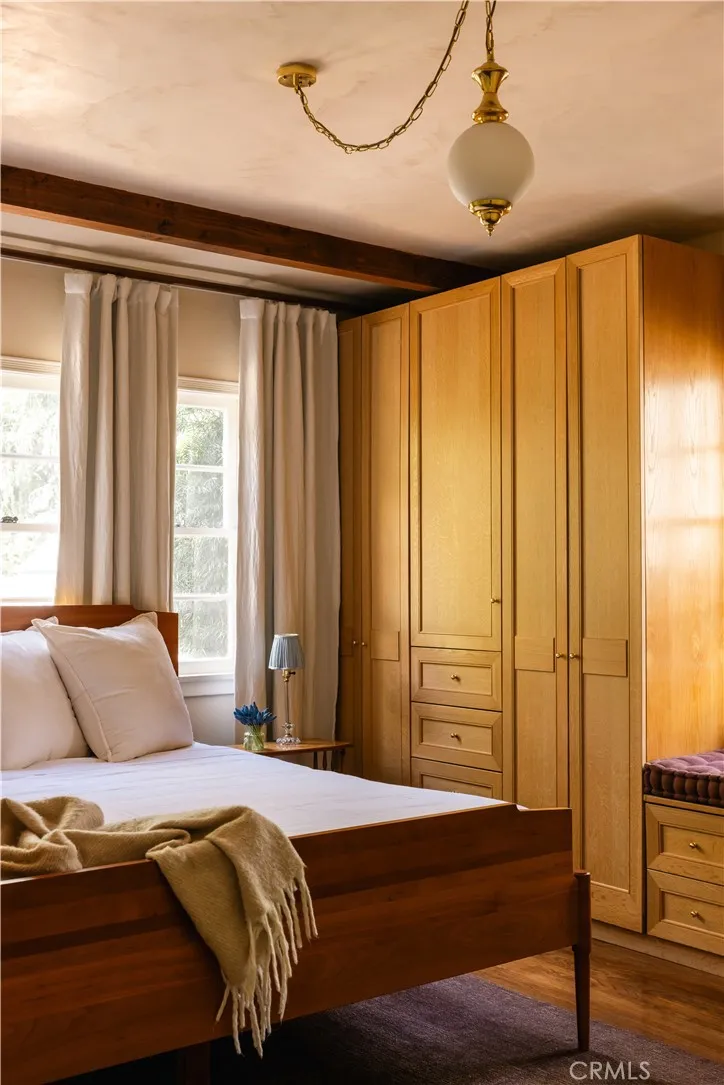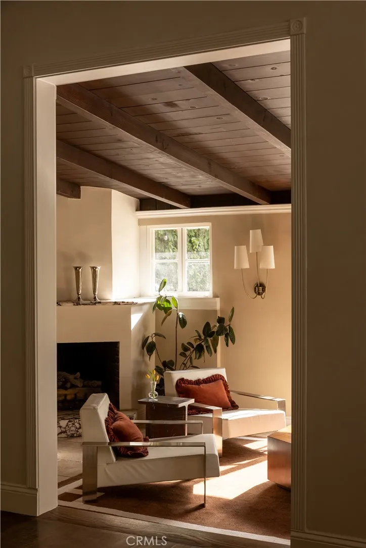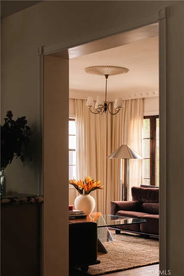 Set amongst some of the best homes in Los Angeles, a 1926 Tudor fully reimagined by Gibson House as their primary residence. Three bedrooms, two baths, and 2,050 square feet of quiet, considered interiors. A spacious formal living room anchored by a fluted fireplace and views of the tree-lined street. The Calacatta Viola kitchen opens to a deck off the back of the home — made for the morning coffee ritual. Step out of the den, past a second Calacatta Viola fireplace, onto a 400 sf travertine patio that leads into the oasis. The 11,000 sf lot is the love letter: covered pergola, DG meditation garden with fountain, a new pool set amongst a fruit orchard, all held in by fifty 25-foot cypress. Set back beyond the pool, a 250 sf converted garage — plumbed and ready for full ADU conversion. Dahlia Heights, the best elementary school in the city, is a four-minute walk from the front door. An assumable loan can convey with the home.