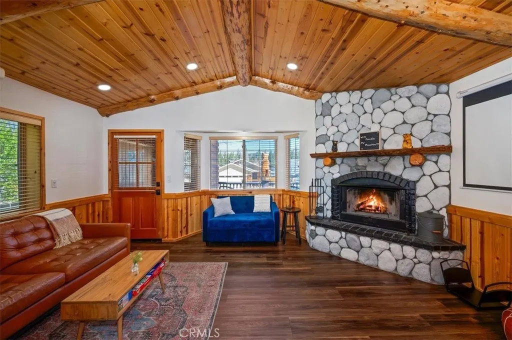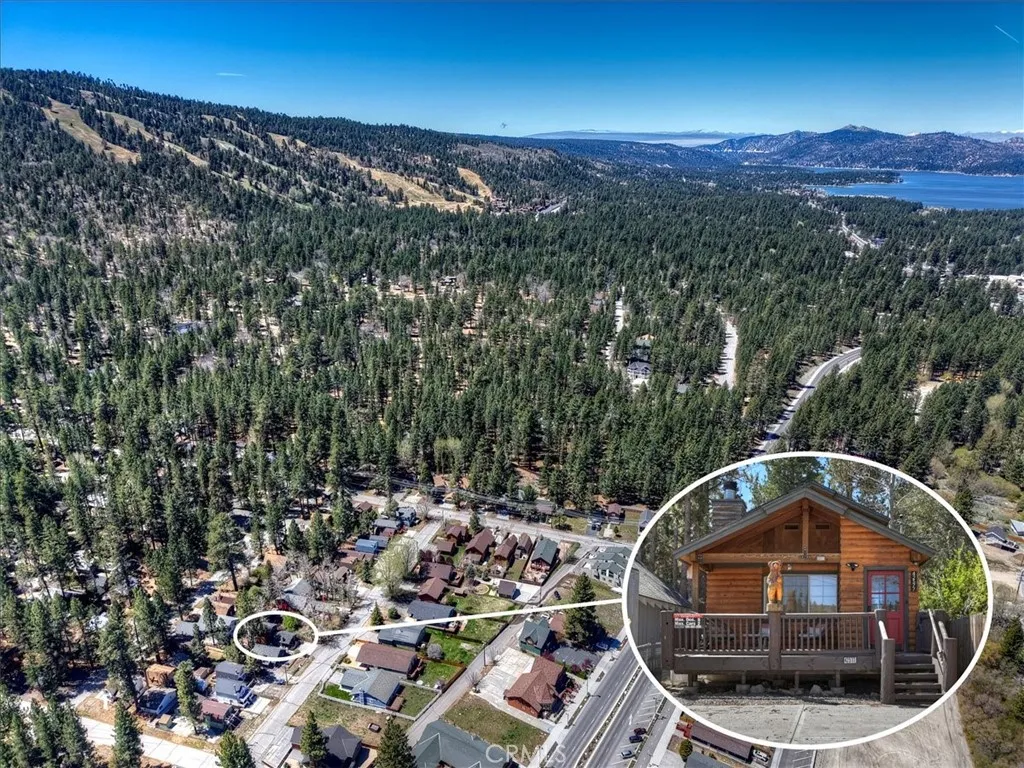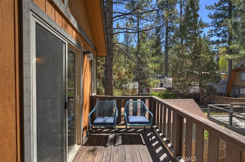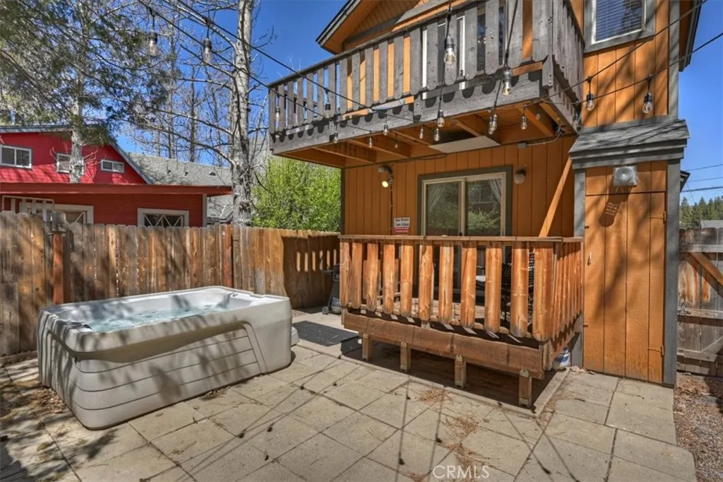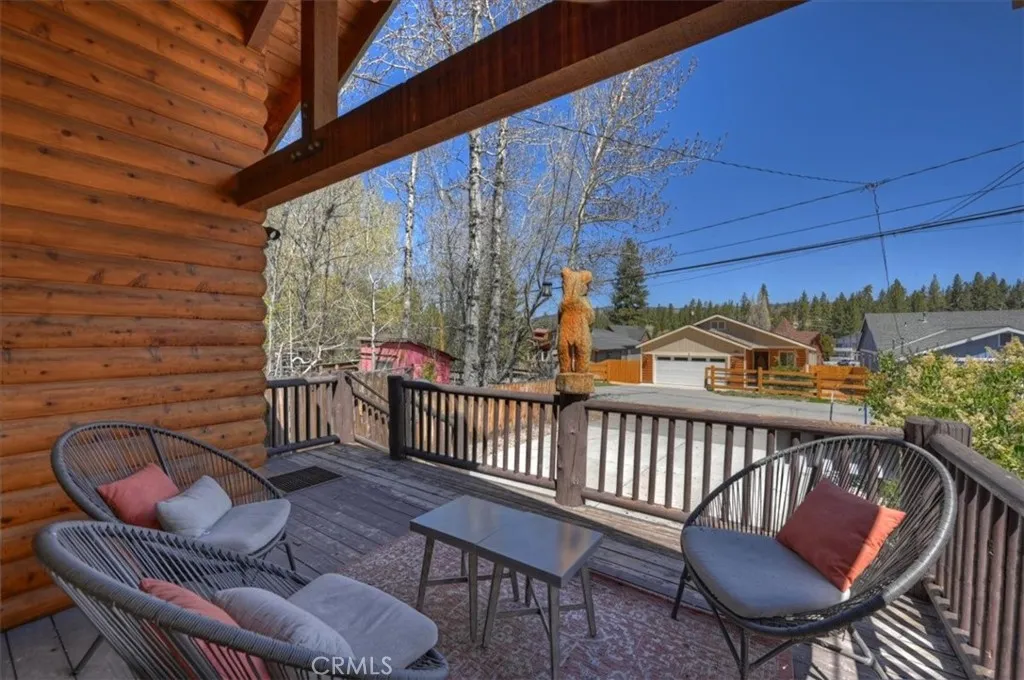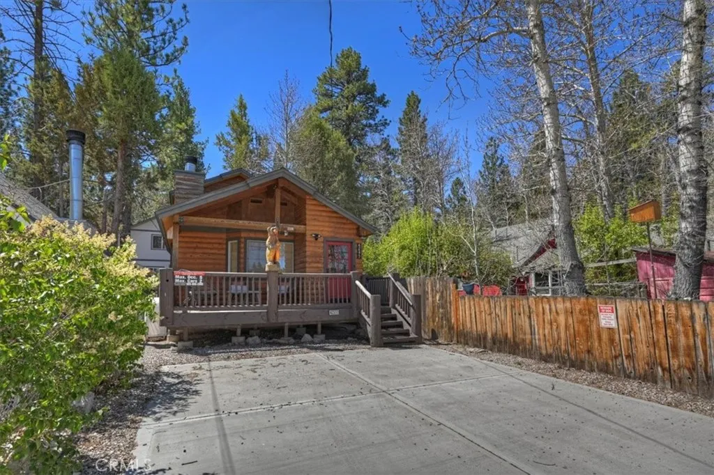 Welcome to your perfect Big Bear getaway, located between both ski areas- where convenience meets mountain charm. With easy year-round access, this beautifully renovated two-story log-style home offers 1,060 sq ft of thoughtfully designed living space, ideal as a full-time residence, vacation retreat, or proven income property. Step inside to an inviting open floor plan featuring warm knotty pine walls and ceilings, wood-like laminate flooring, and a stunning rock fireplace that anchors the living room. Enjoy movie nights with the built-in projection TV, creating a true cabin experience with modern comfort. The updated kitchen is both stylish and functional, showcasing quartz countertops, stainless steel appliances, including a gas range, microwave hood, dishwasher, fridge, and sink, and a convenient breakfast bar for casual dining. With two spacious bedrooms and two bathrooms, one on each level, this home offers flexibility and privacy. The upstairs en suite bedroom features its own balcony, perfect for morning coffee or evening stargazing. Bathrooms are upgraded with tile flooring and marble finishes, complemented by custom fixtures throughout. Additional highlights include minisplit air conditioning, Nest-controlled central heating, and laundry hook-ups for added convenience. Outside, enjoy a well-deserved soak in your private spa after a day on the slopes or a day on the Lake. A fully fenced rear yard offers quiet relaxation as you dine on the deck. This location truly shines, just a short walk to Moonridge favorites like Dank Doughnuts, Moonridge Coffee House, the Alpine Zoo, and the ski shuttle, plus it's only about a half mile to Bear Mountain Ski & Golf Course and Snow Summit Ski Area. Currently a five-star rated Airbnb, this property offers both lifestyle and affordable investment appeal in one of Big Bear’s most sought-after neighborhoods. Furnishings are negotiable