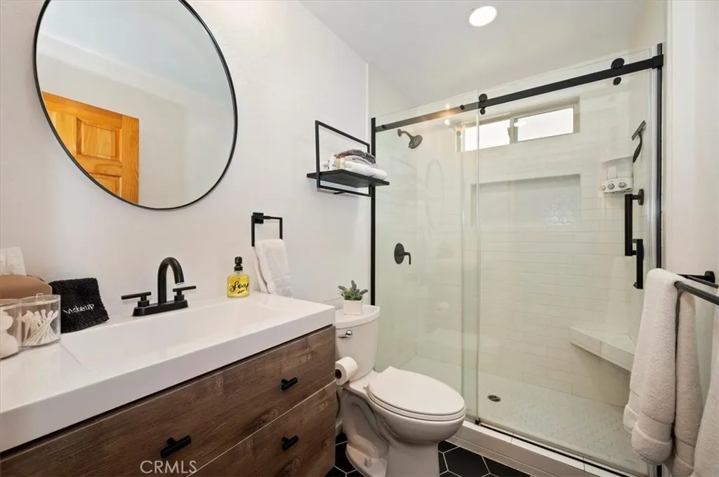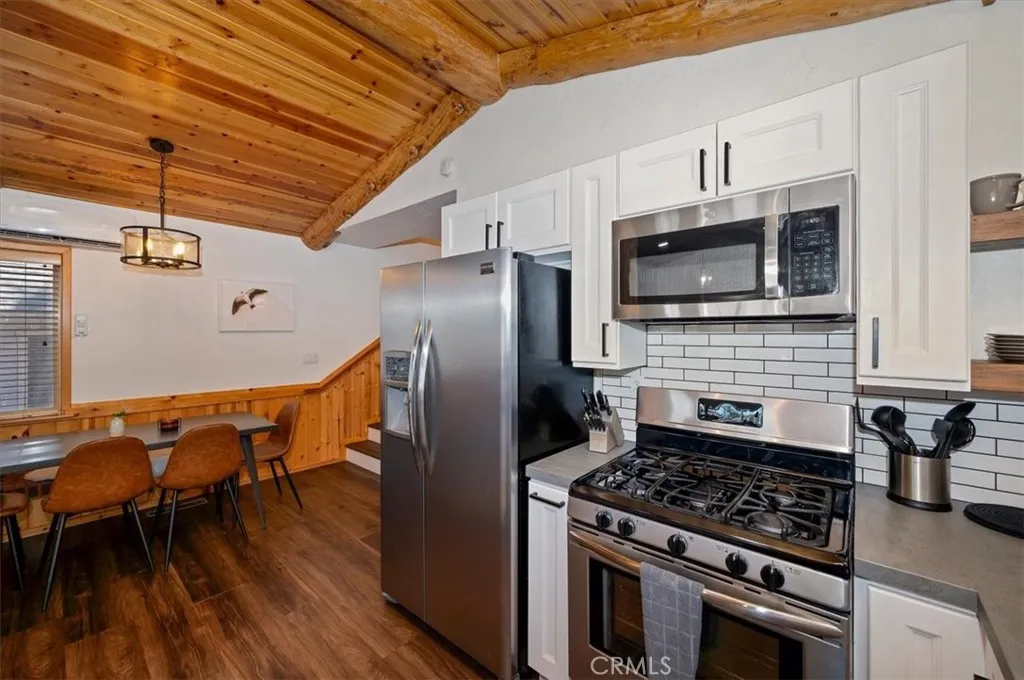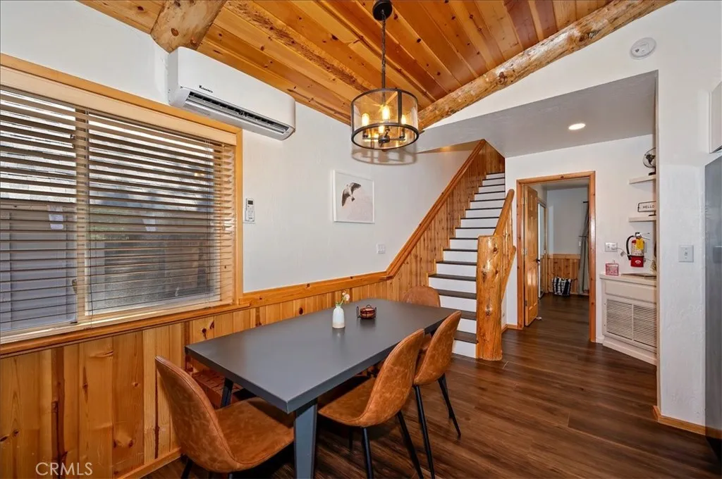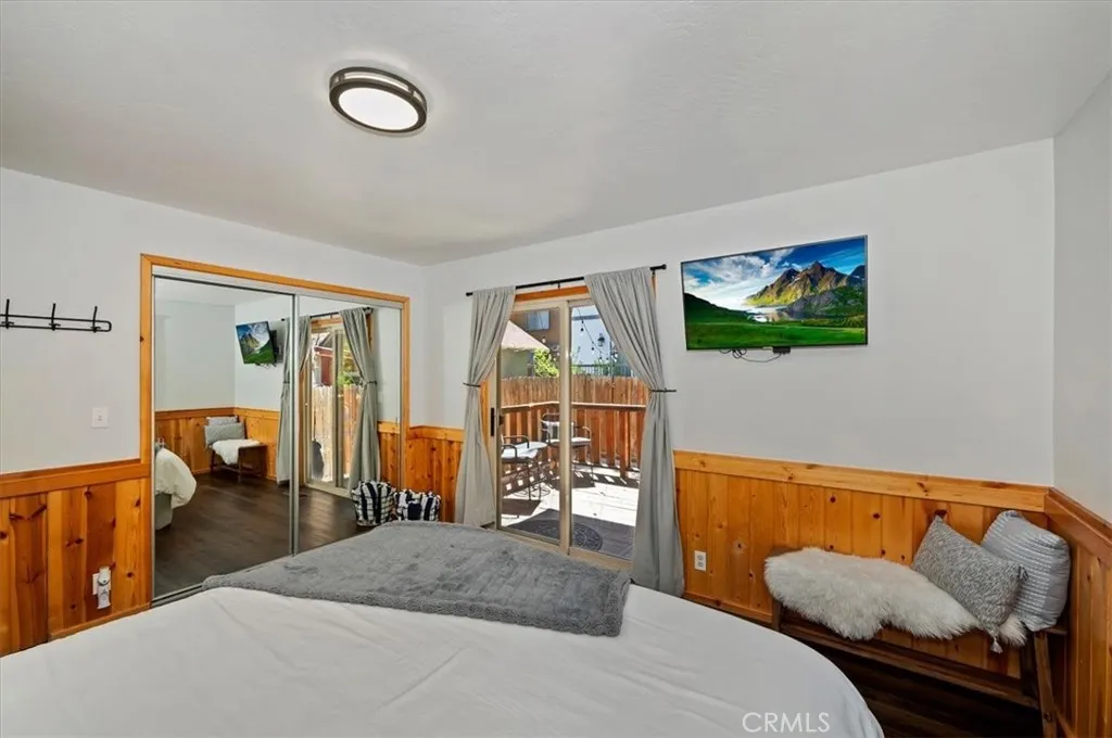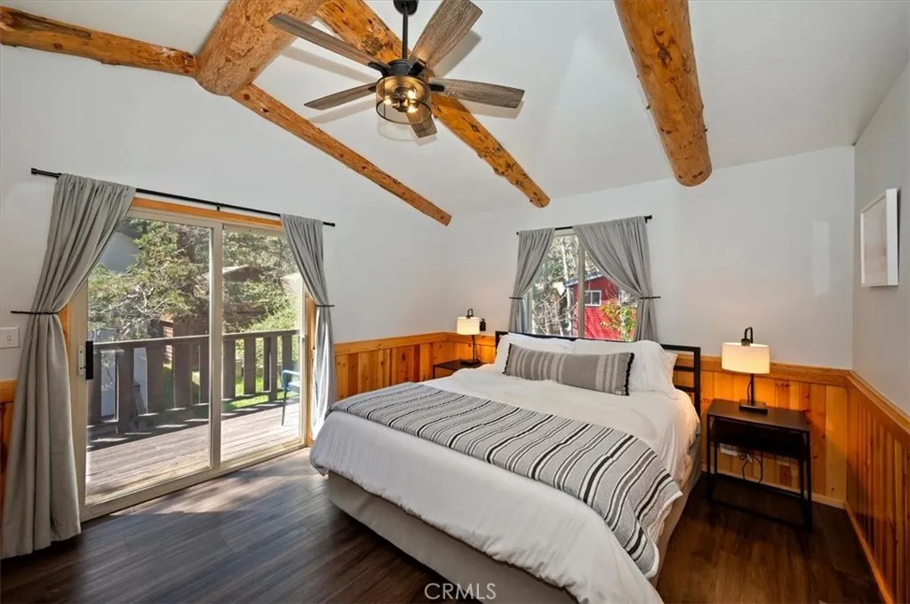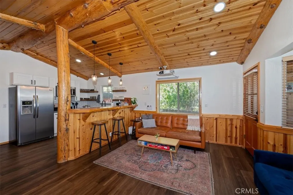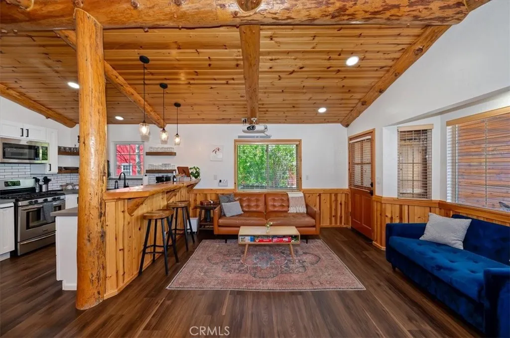 Welcome to your perfect Big Bear getaway, located between both ski areas- where convenience meets mountain charm. With easy year-round access, this beautifully renovated two-story log-style home offers 1,060 sq ft of thoughtfully designed living space, ideal as a full-time residence, vacation retreat, or proven income property. Step inside to an inviting open floor plan featuring warm knotty pine walls and ceilings, wood-like laminate flooring, and a stunning rock fireplace that anchors the living room. Enjoy movie nights with the built-in projection TV, creating a true cabin experience with modern comfort. The updated kitchen is both stylish and functional, showcasing quartz countertops, stainless steel appliances, including a gas range, microwave hood, dishwasher, fridge, and sink, and a convenient breakfast bar for casual dining. With two spacious bedrooms and two bathrooms, one on each level, this home offers flexibility and privacy. The upstairs en suite bedroom features its own balcony, perfect for morning coffee or evening stargazing. Bathrooms are upgraded with tile flooring and marble finishes, complemented by custom fixtures throughout. Additional highlights include minisplit air conditioning, Nest-controlled central heating, and laundry hook-ups for added convenience. Outside, enjoy a well-deserved soak in your private spa after a day on the slopes or a day on the Lake. A fully fenced rear yard offers quiet relaxation as you dine on the deck. This location truly shines, just a short walk to Moonridge favorites like Dank Doughnuts, Moonridge Coffee House, the Alpine Zoo, and the ski shuttle, plus it's only about a half mile to Bear Mountain Ski & Golf Course and Snow Summit Ski Area. Currently a five-star rated Airbnb, this property offers both lifestyle and affordable investment appeal in one of Big Bear’s most sought-after neighborhoods. Furnishings are negotiable